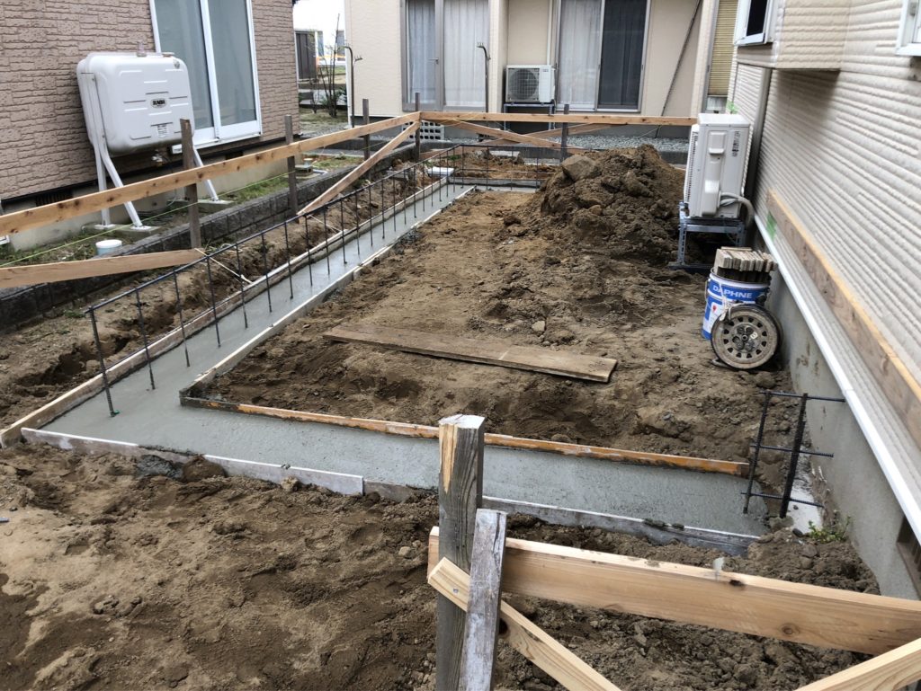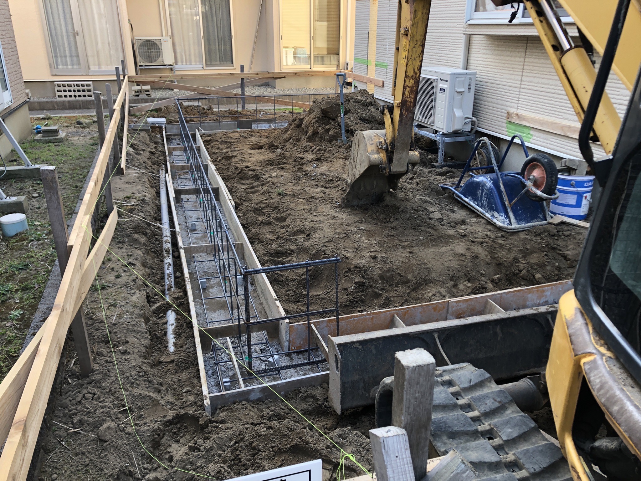 まずは増築部分の基礎工事を行います。型枠を組み鉄筋を建てコンクリートを流し込み基礎を作っていきます。