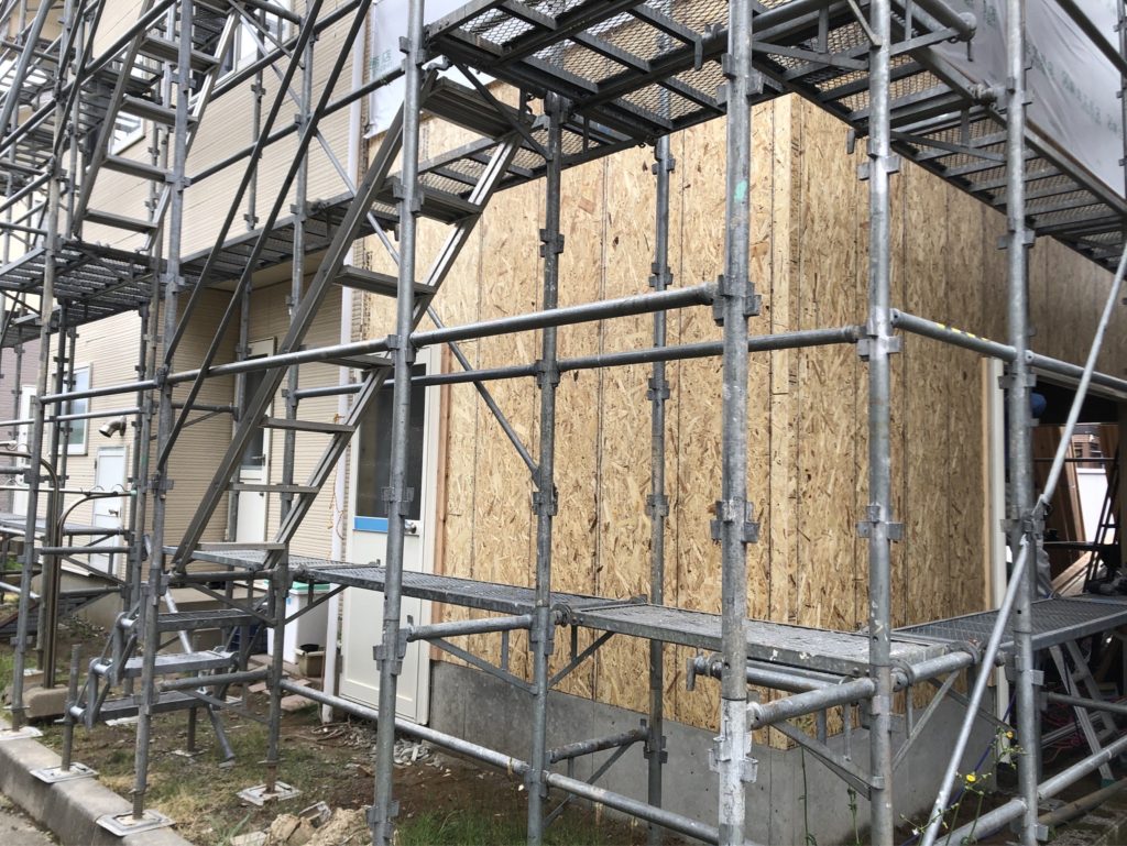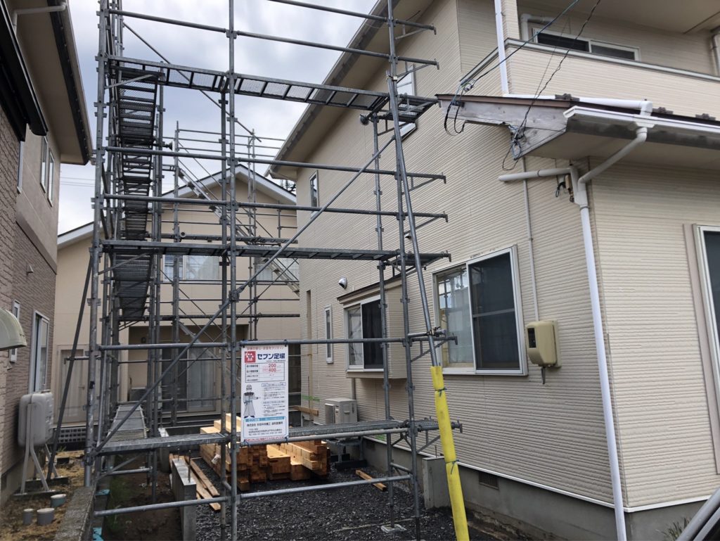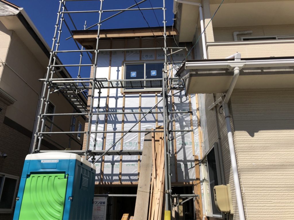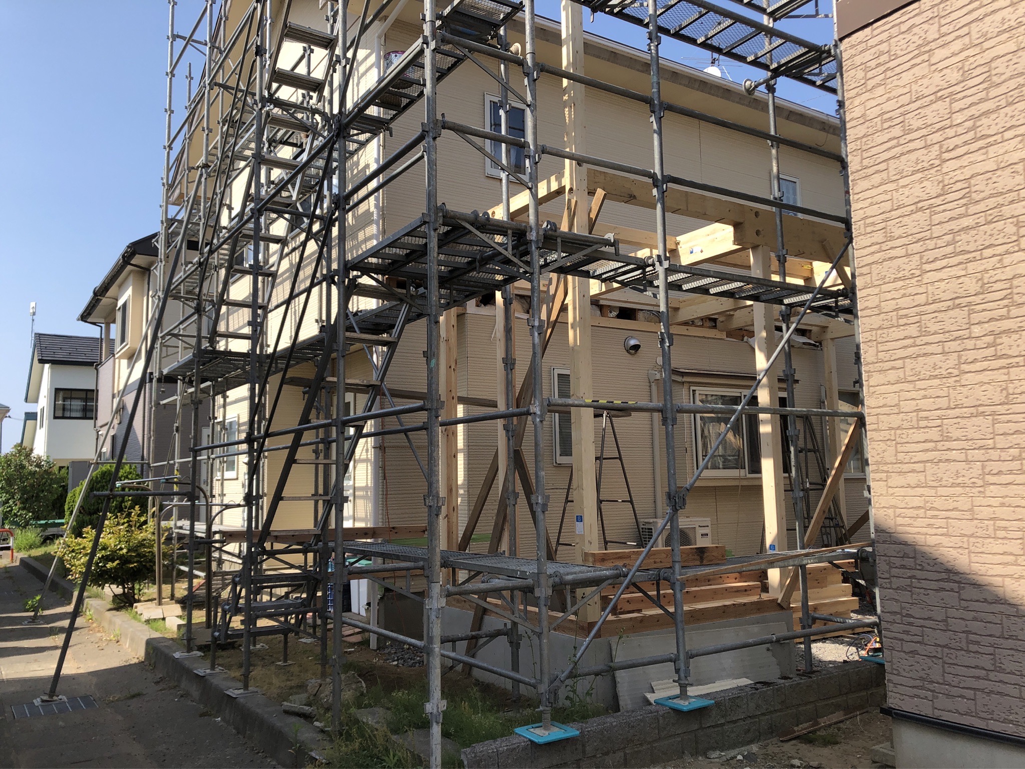 以上、S様邸増築工事の様子でした。なお、足場ネットは終業時に施工状況を撮影する為に一旦取り外し、外観撮影後に再度取り付けております。麻生工務店では転落事故防止用の足場ネットを取り付けずに高所工事は行いませんのでご安心下さい。