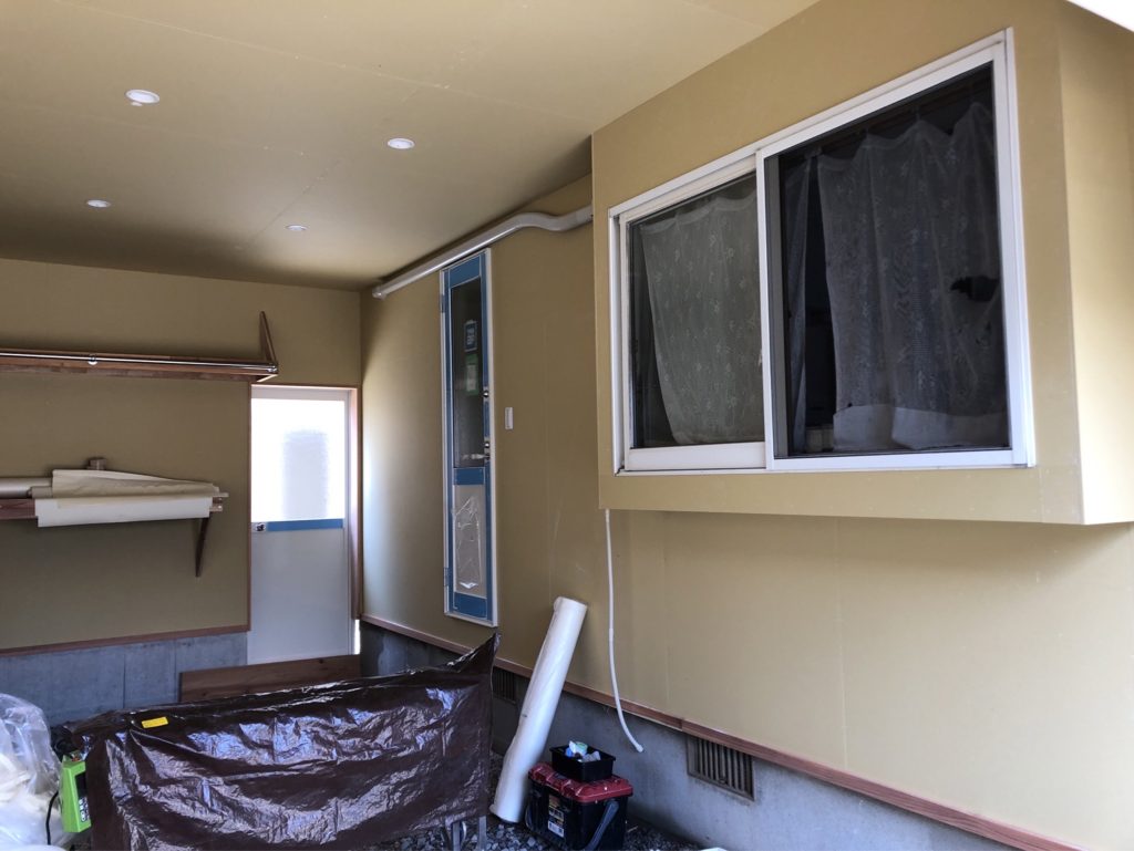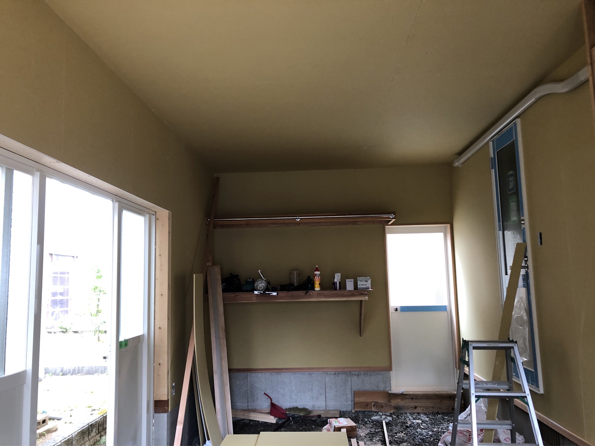 一階、物置部分の様子。統一感を出すために既存の建物部分の外壁材を一度剥がし石膏ボードを貼り付けていきます。増築部分の壁面、天井面にも石膏ボードを貼り付けサッシやドアを設置します。