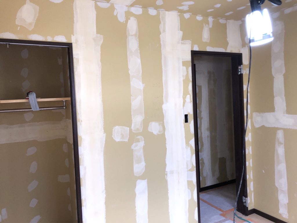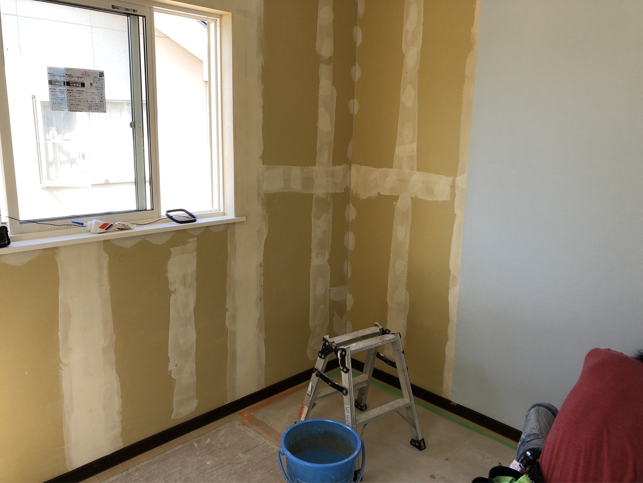 2階部分の様子。一階と同じくサッシやドアと組み込み石膏ボードを貼り付け、クロス(壁紙)を貼る前に凹凸を埋める下地処理をします。