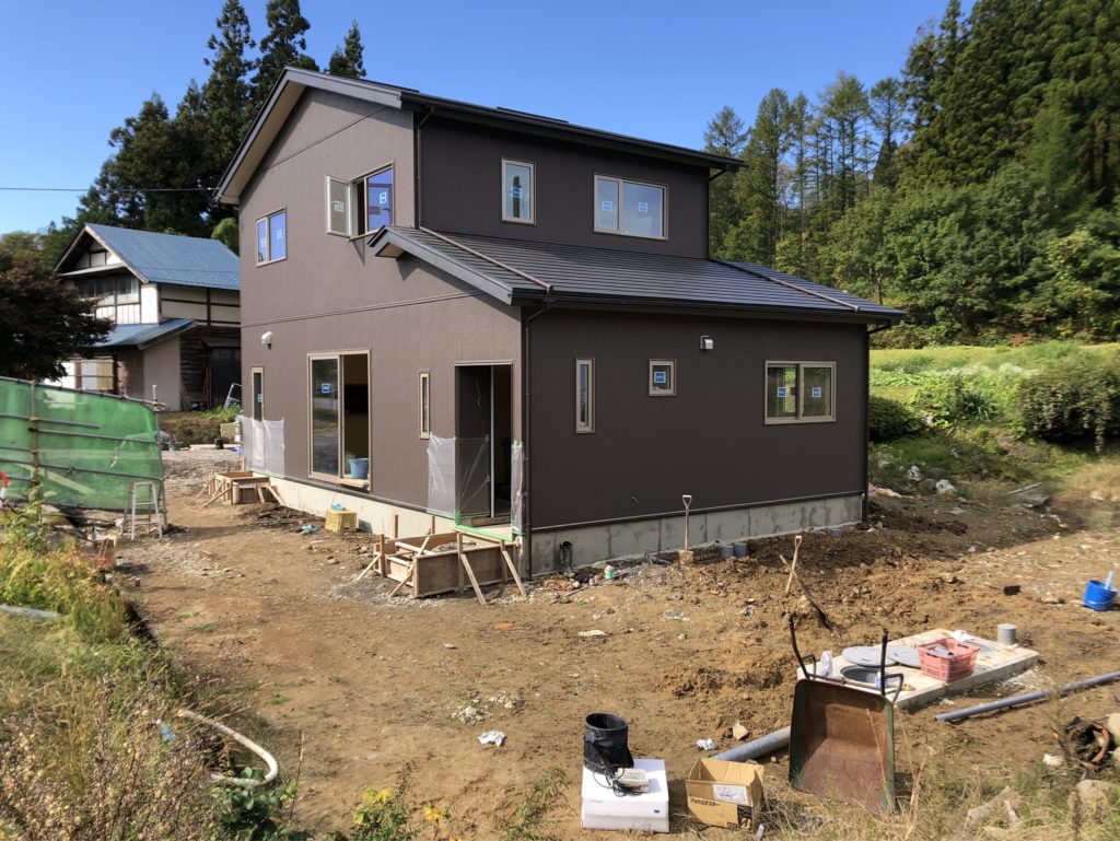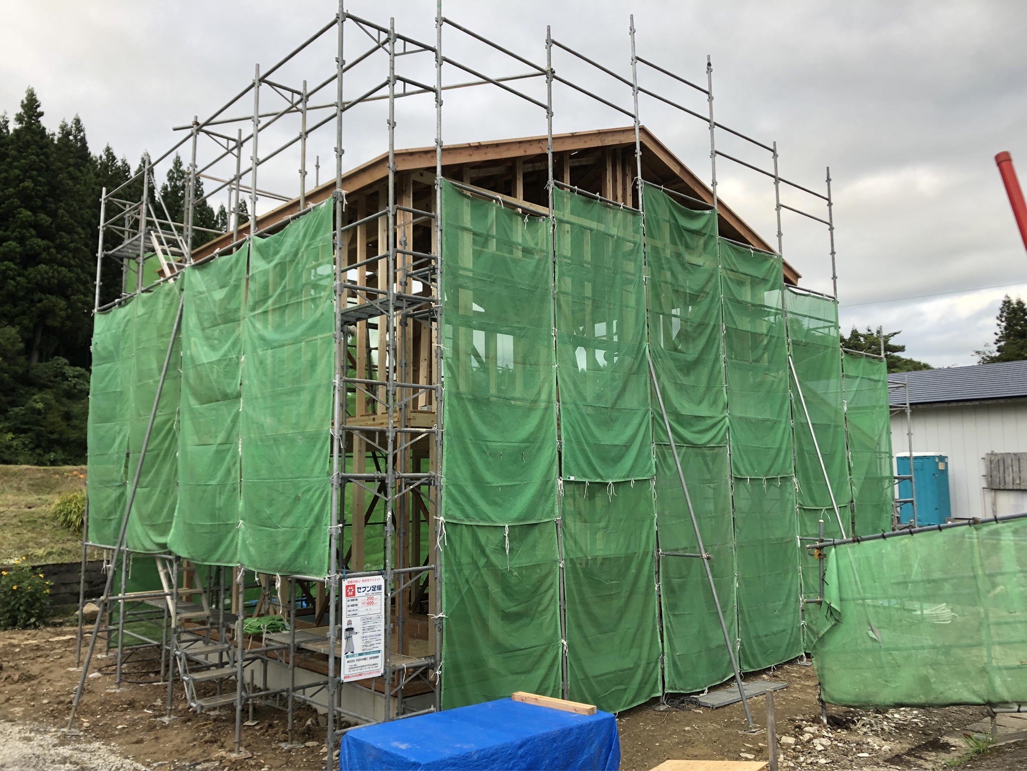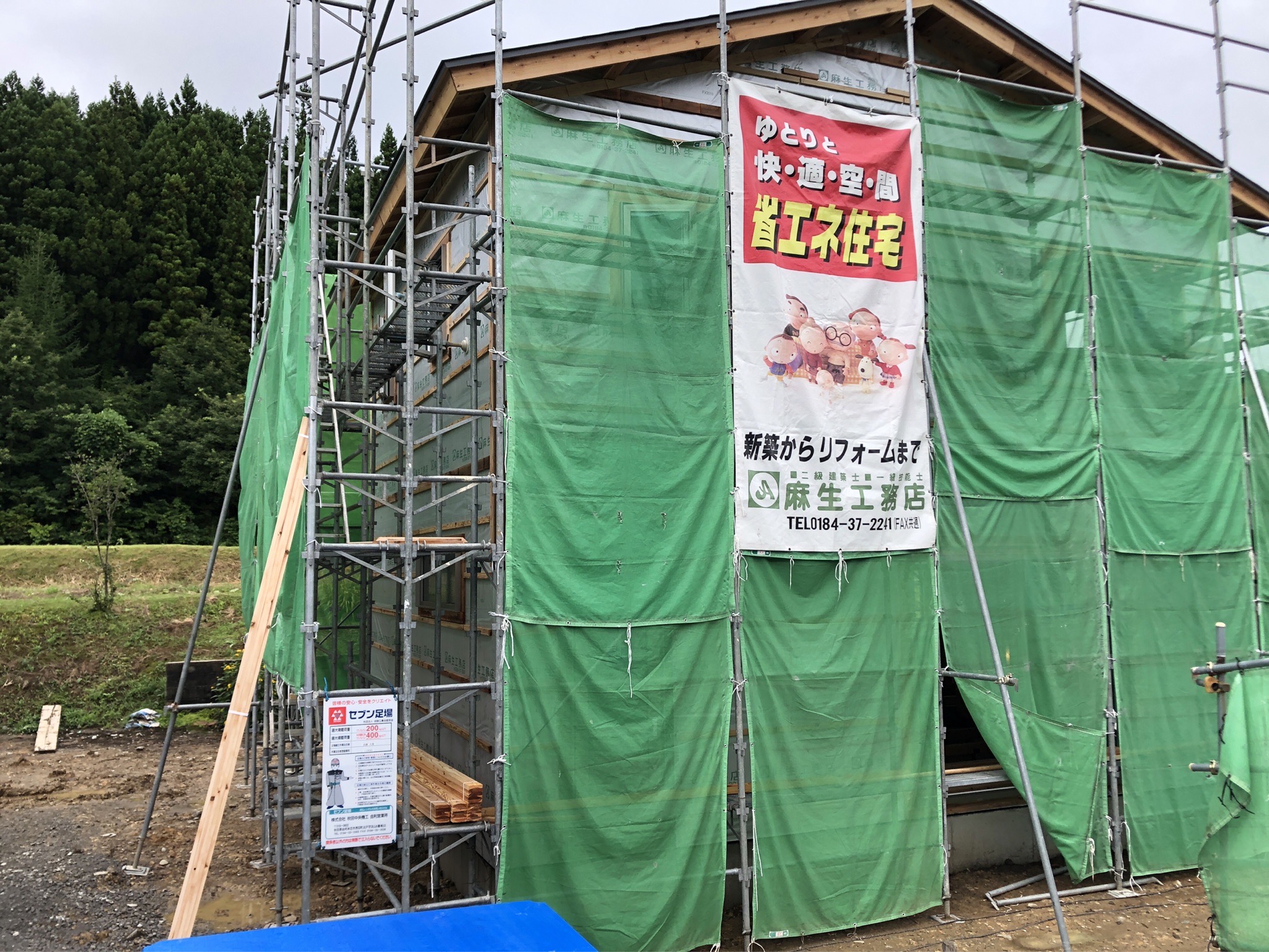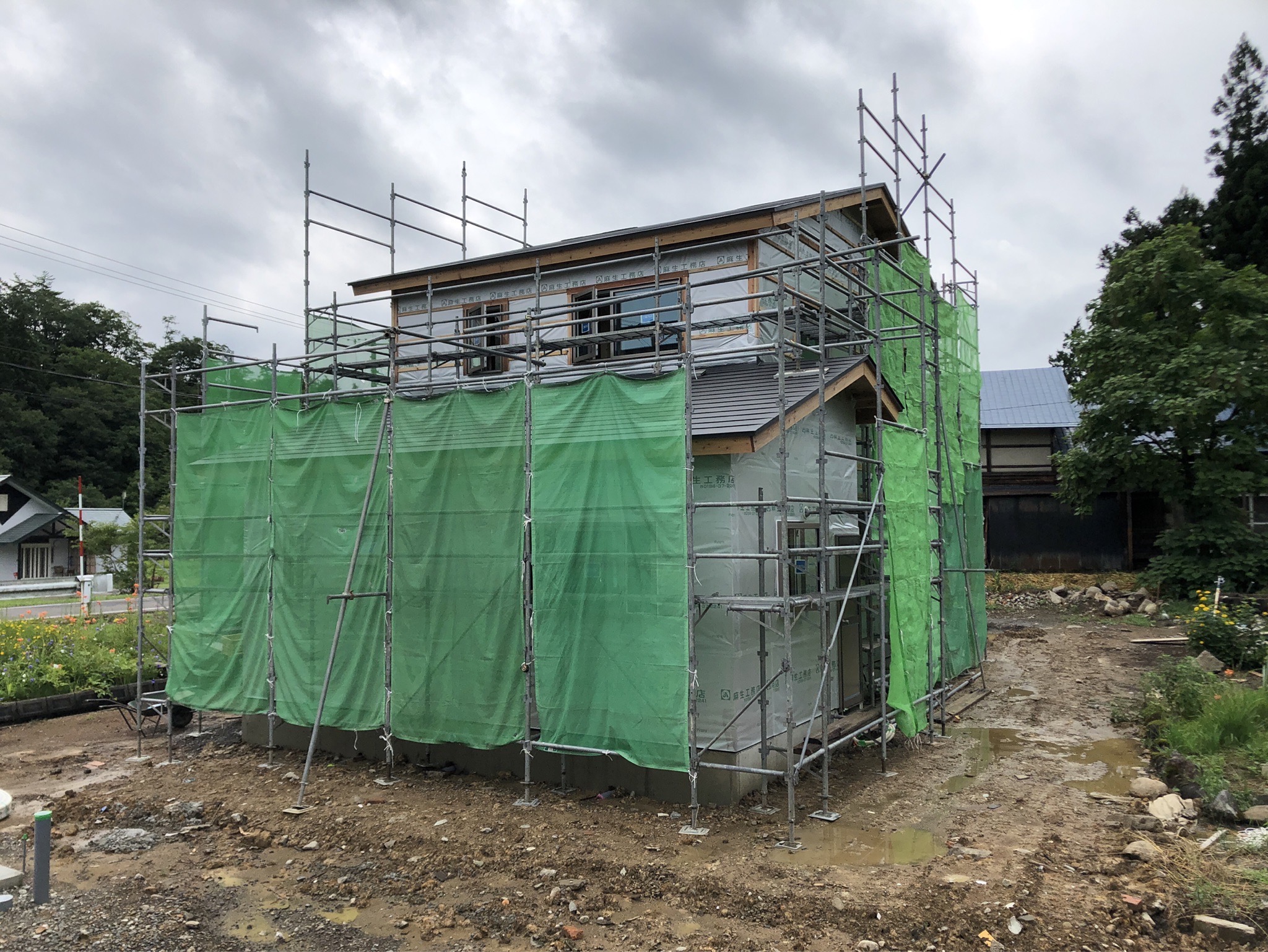 外部の様子。サッシやドアを取り付け防水透湿遮熱シートを外壁の下地として全面に貼り付けました。