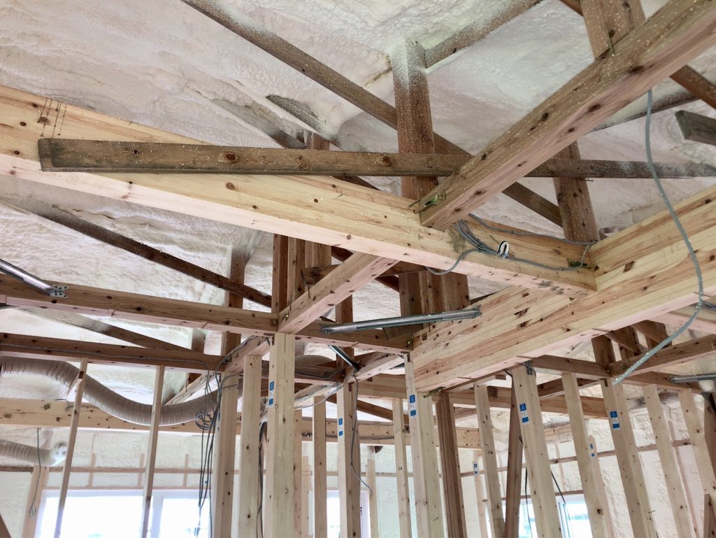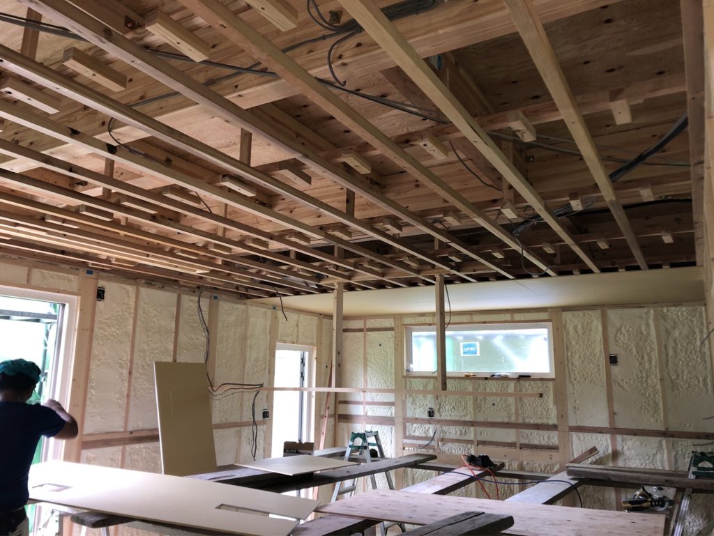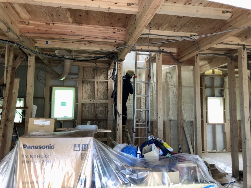1階天井部分の様子。アクアフォーム吹き付けによる断熱処理、電気配線・空気口工事が完了しましたのでこれから石膏ボード、天井板を貼り付け天井や壁面を作っていきます。