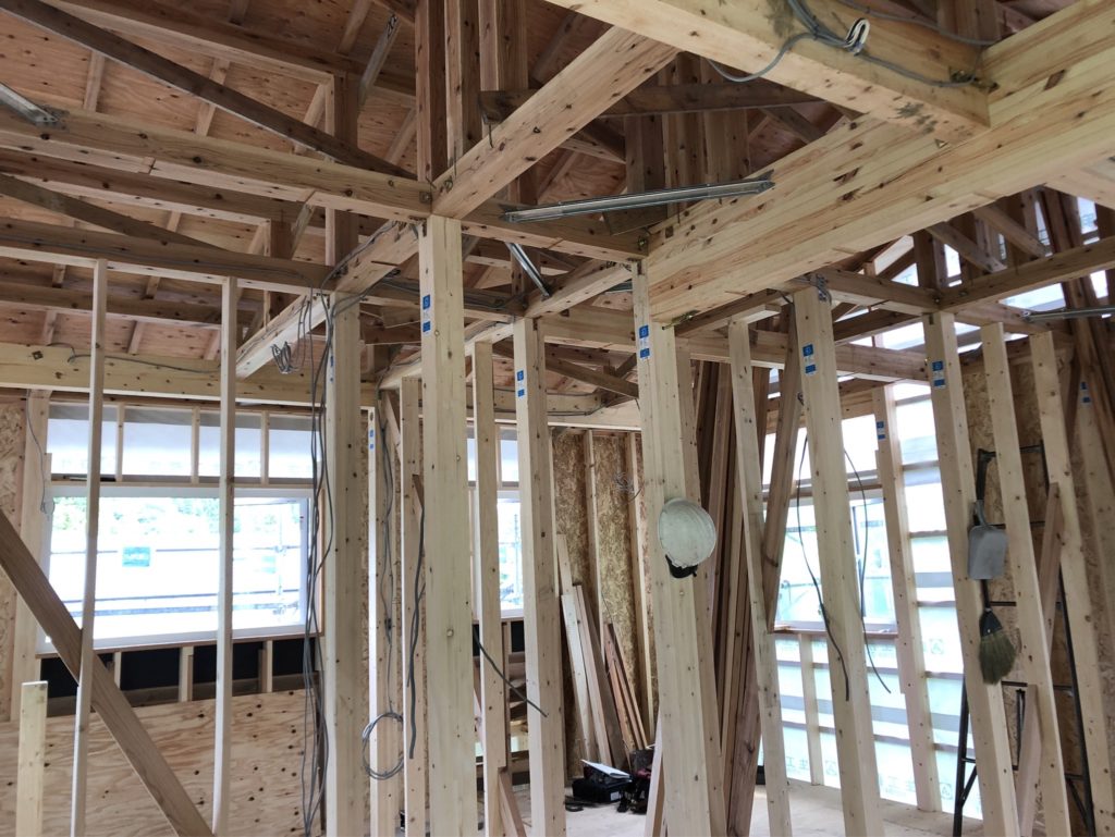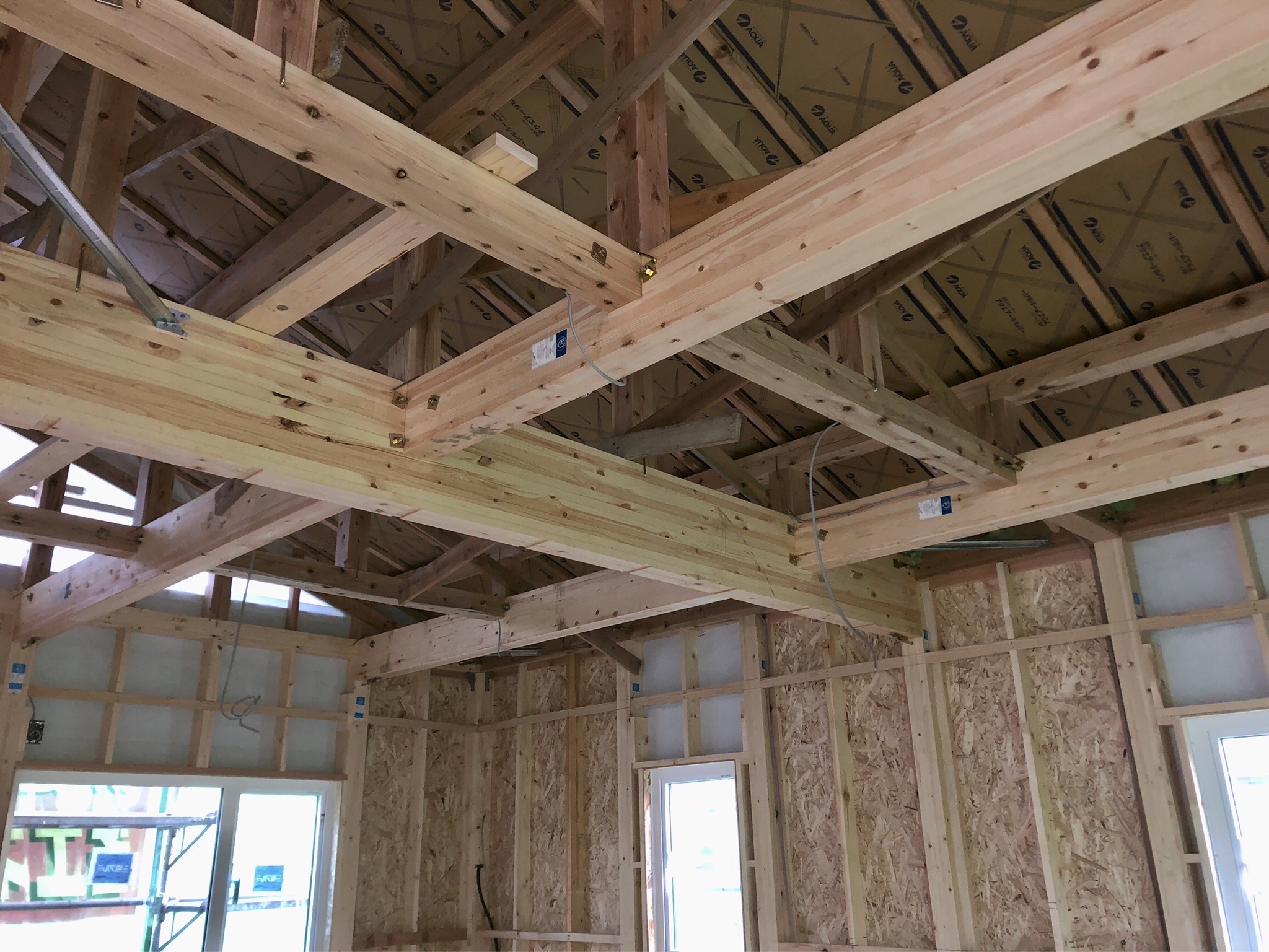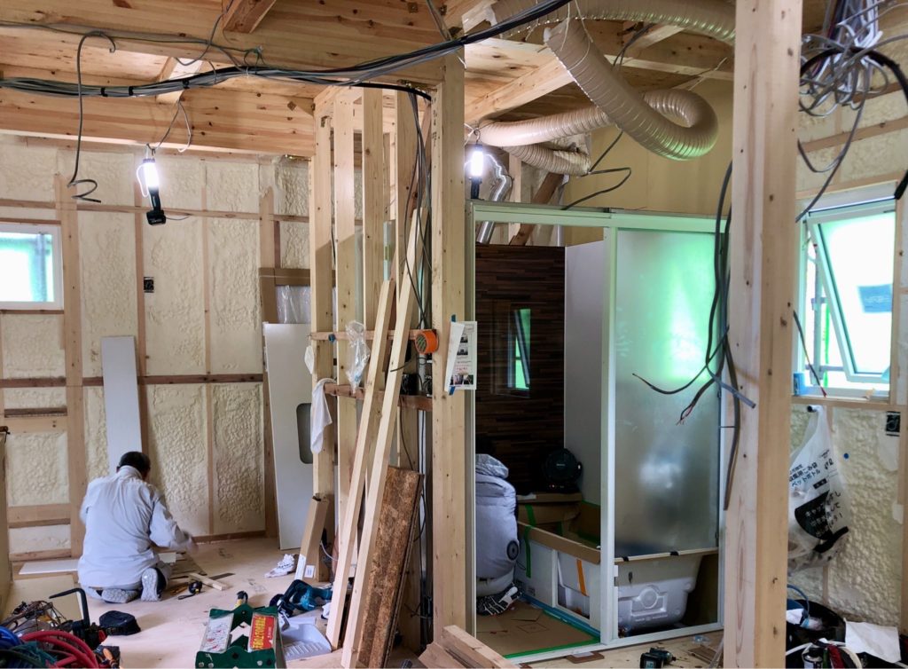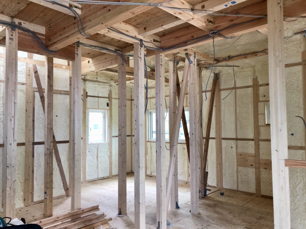 施工後の様子です。アクアフォーム吹付は床、壁、屋根に行いました。この工程により高気密高断熱の住宅を実現することができます。