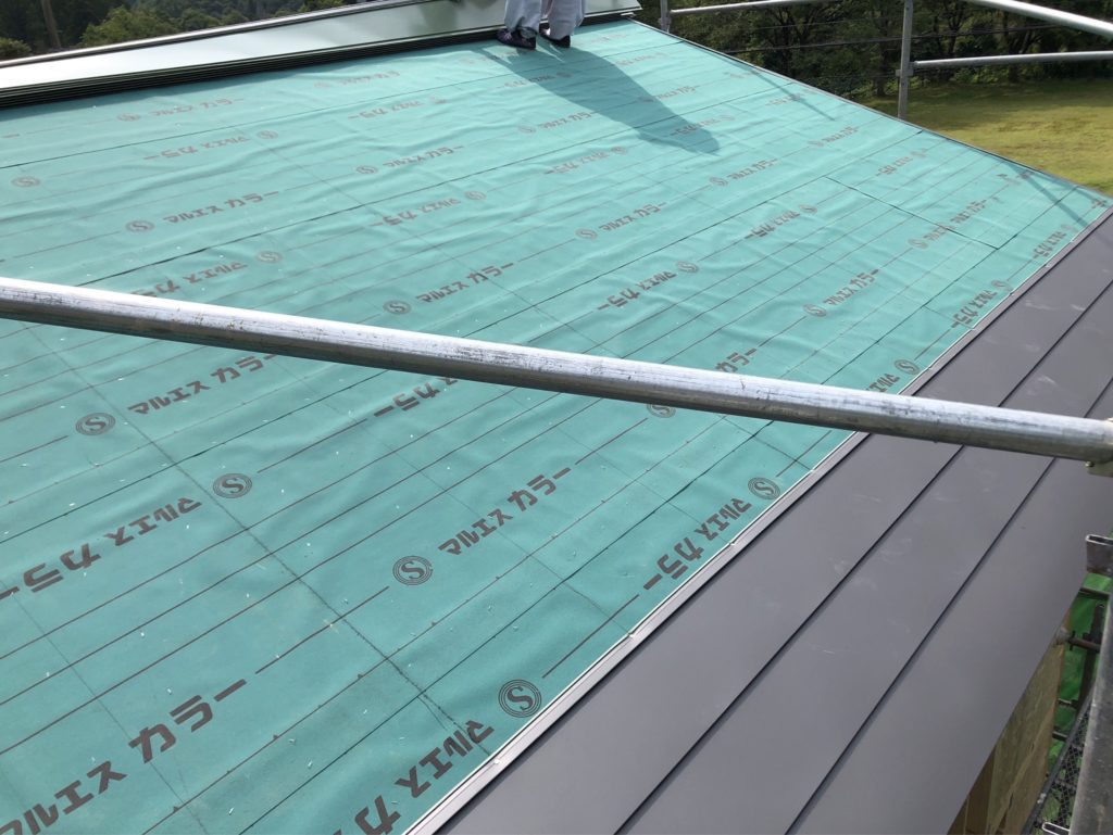 基礎のコンクリートが十分に乾いたら建て方開始です。柱や梁を組みあげ屋根部分も作っていきます。屋根の下地にアスファルトルーティングを敷いていきます。アスファルトルーティングとは道路にも使われているアスファルトを紙に染み込ませて鉱物質の粉末で加工したシートをいいます。アスファルトの道路と同様に強力な防水機能を発揮します。