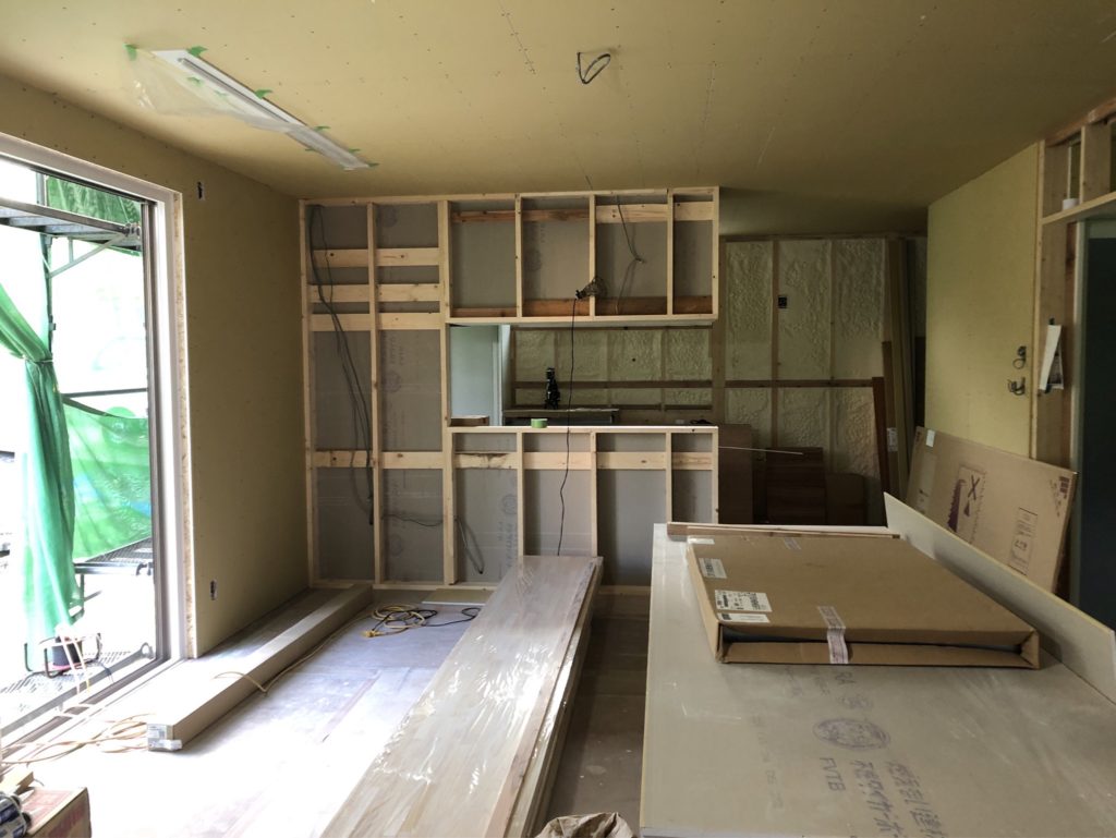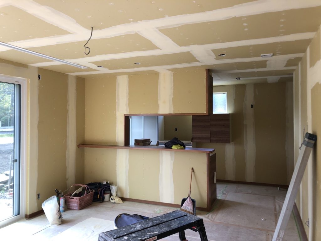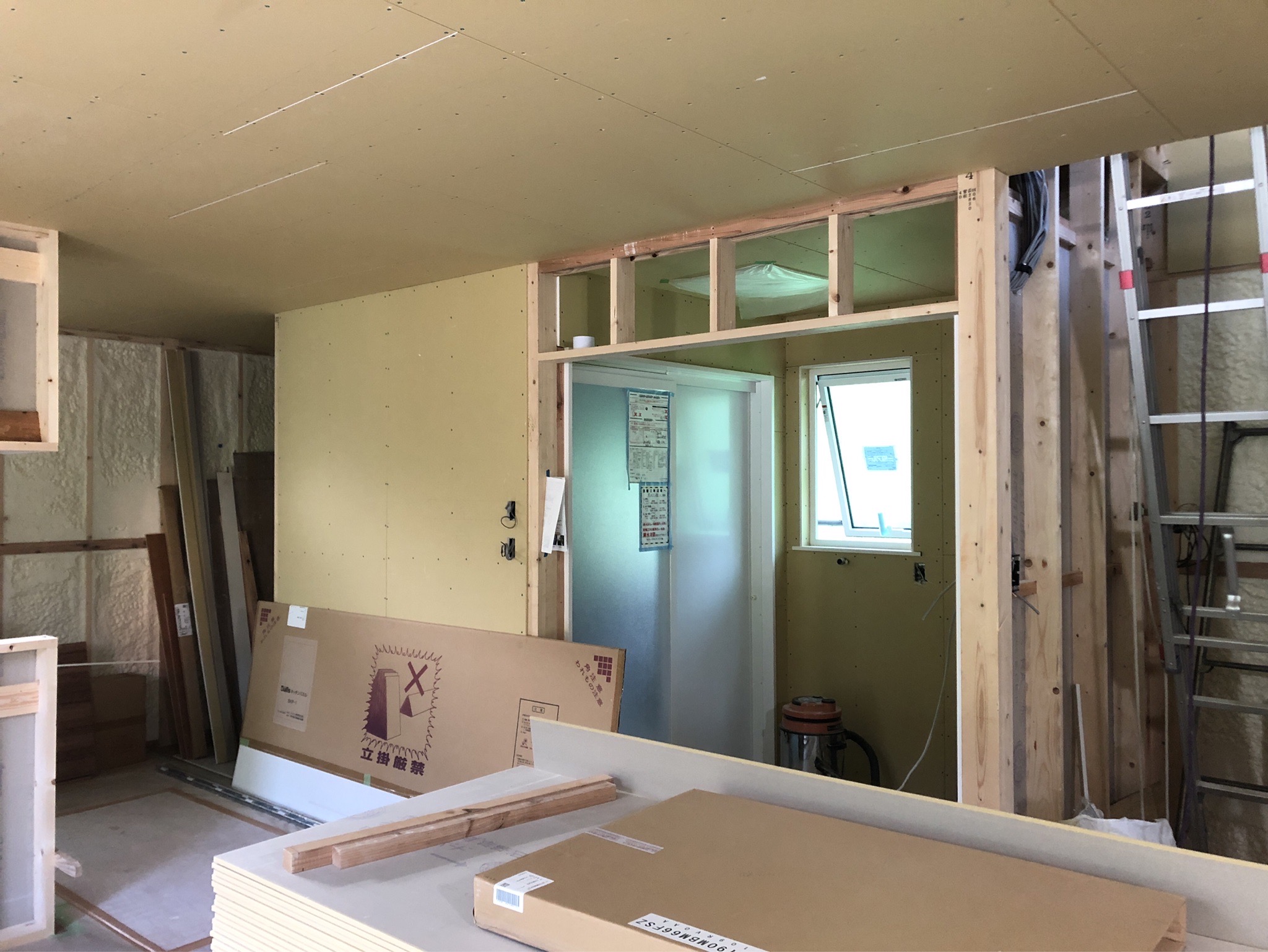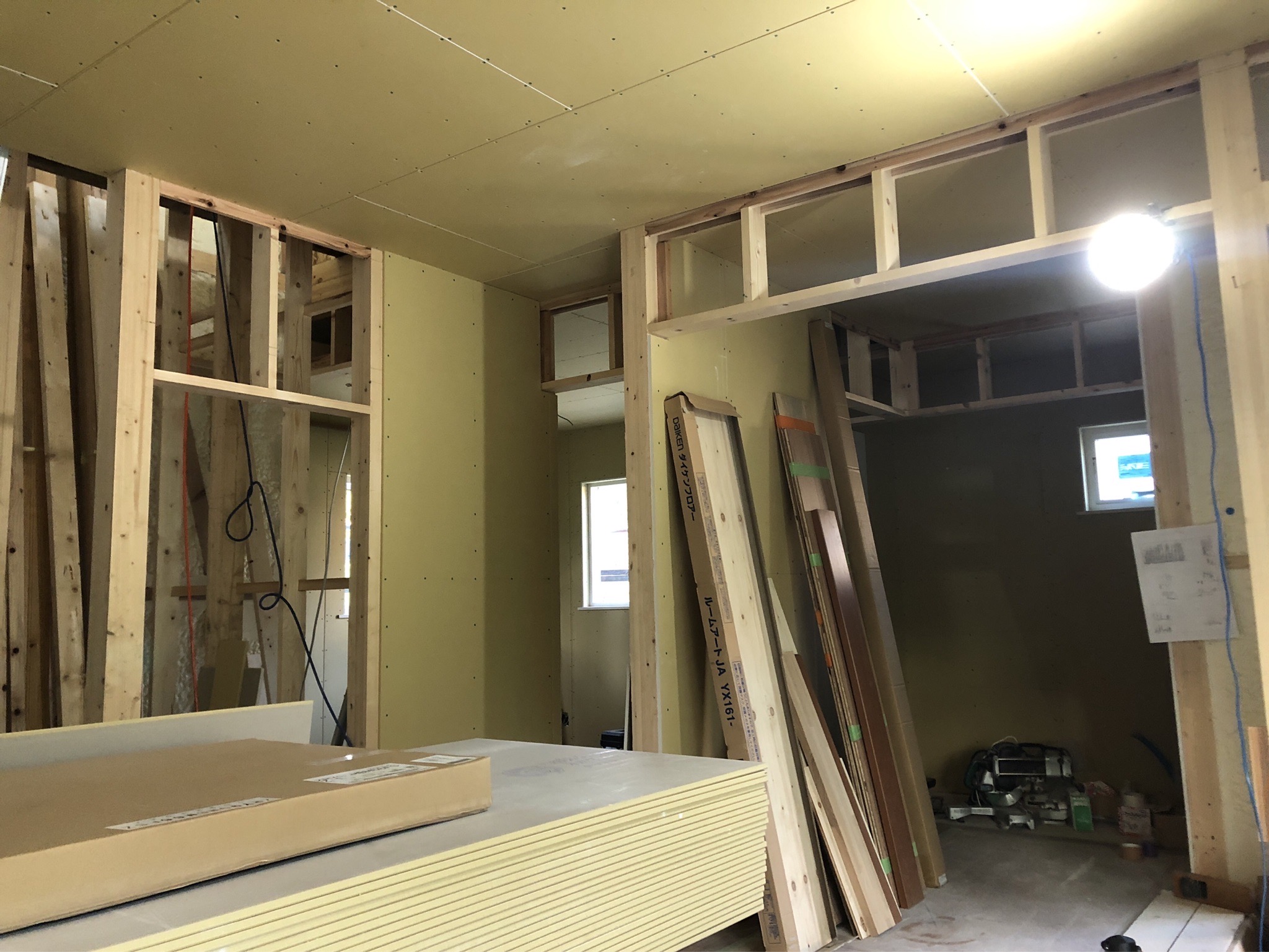 石膏ボードを貼り付けたので部屋の様子が段々と解るようになりました。一階の写真ですが、キッチン部分には建て付けの棚を設置した様子が伺えます。