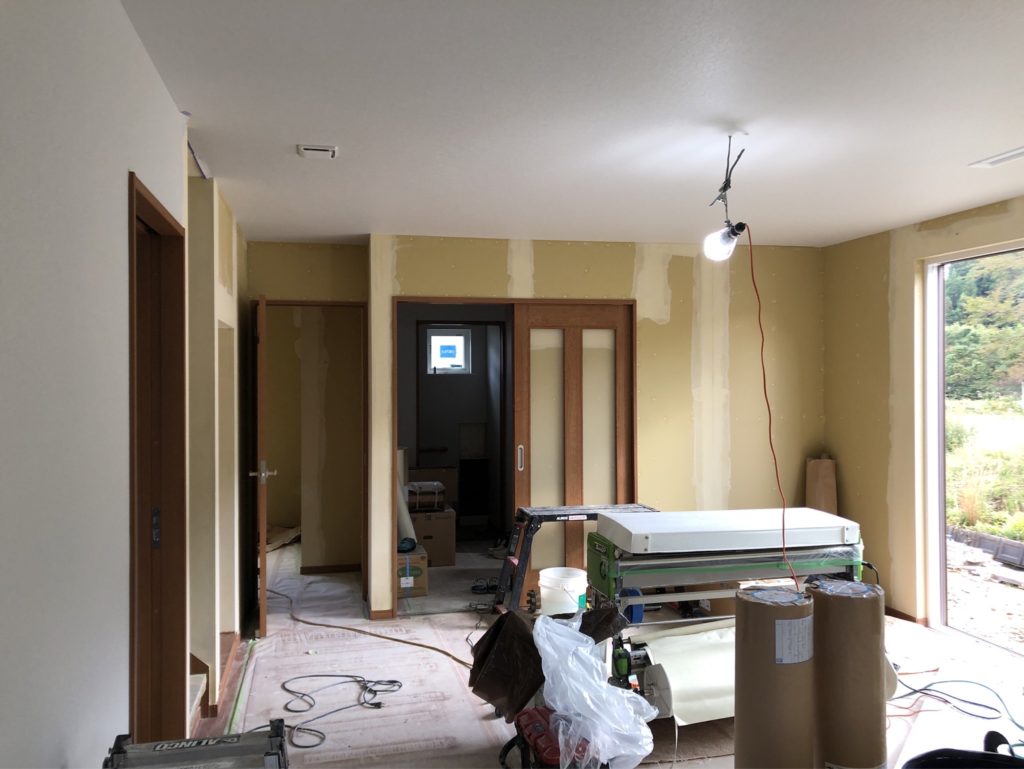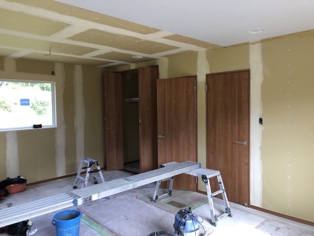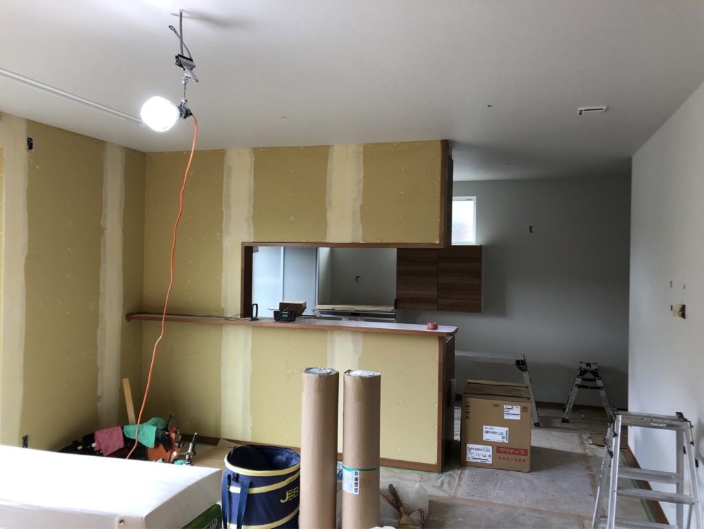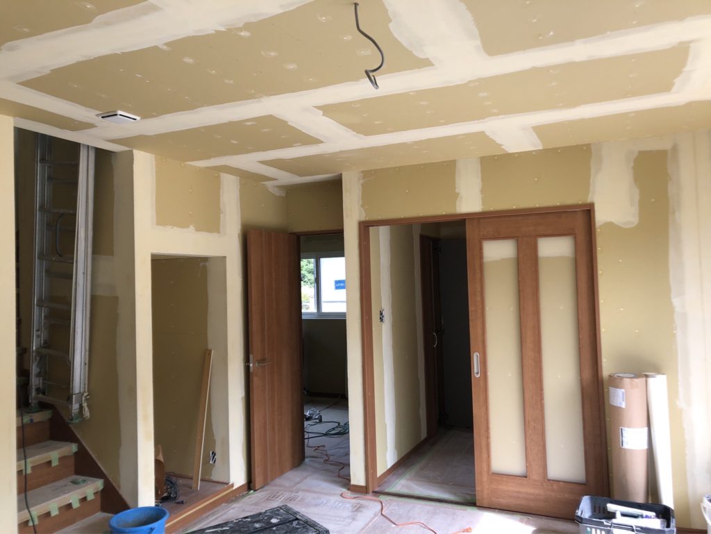 1階部分の様子。石膏ボードの貼り付けが完了し天井部分や壁面が完成し、化粧台やドアの設置も完了しました。クロス(壁紙)を貼る下地処理としてパテで壁の繋ぎ目やビス穴を塞ぎフラットにしていきます。下地処理を丁寧に行うことでクロスをより綺麗に仕上げることができます。