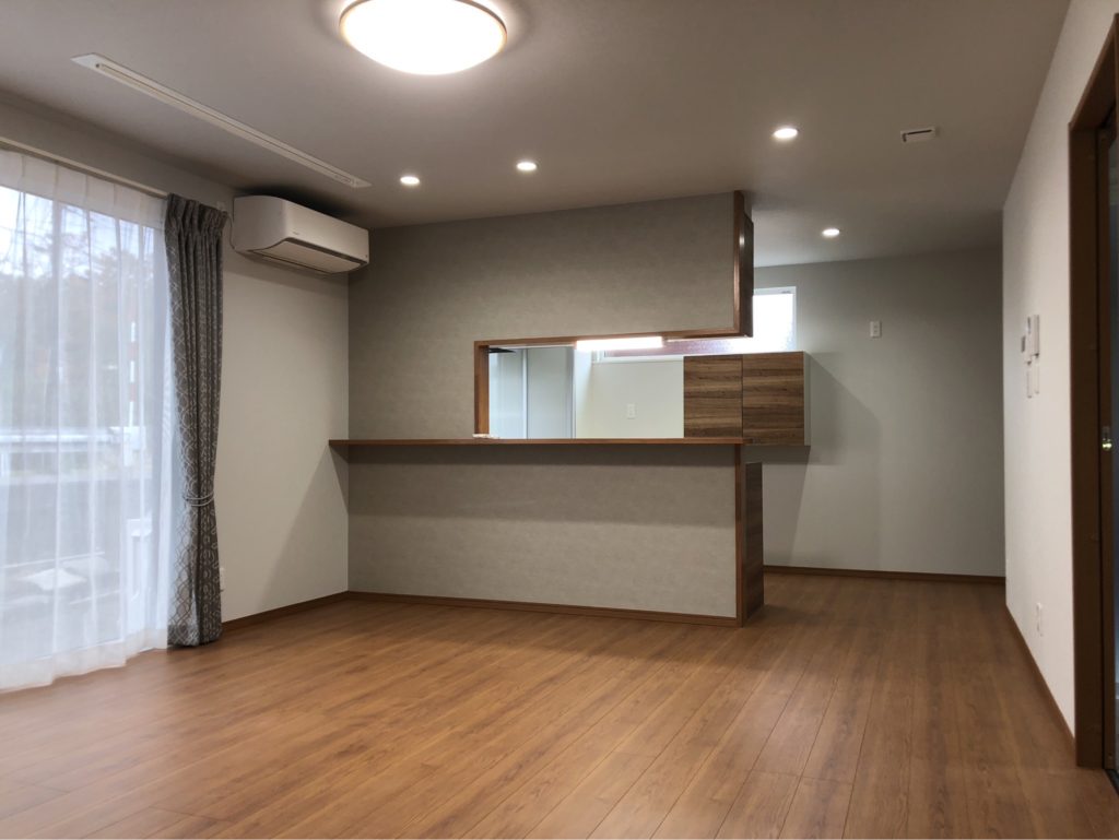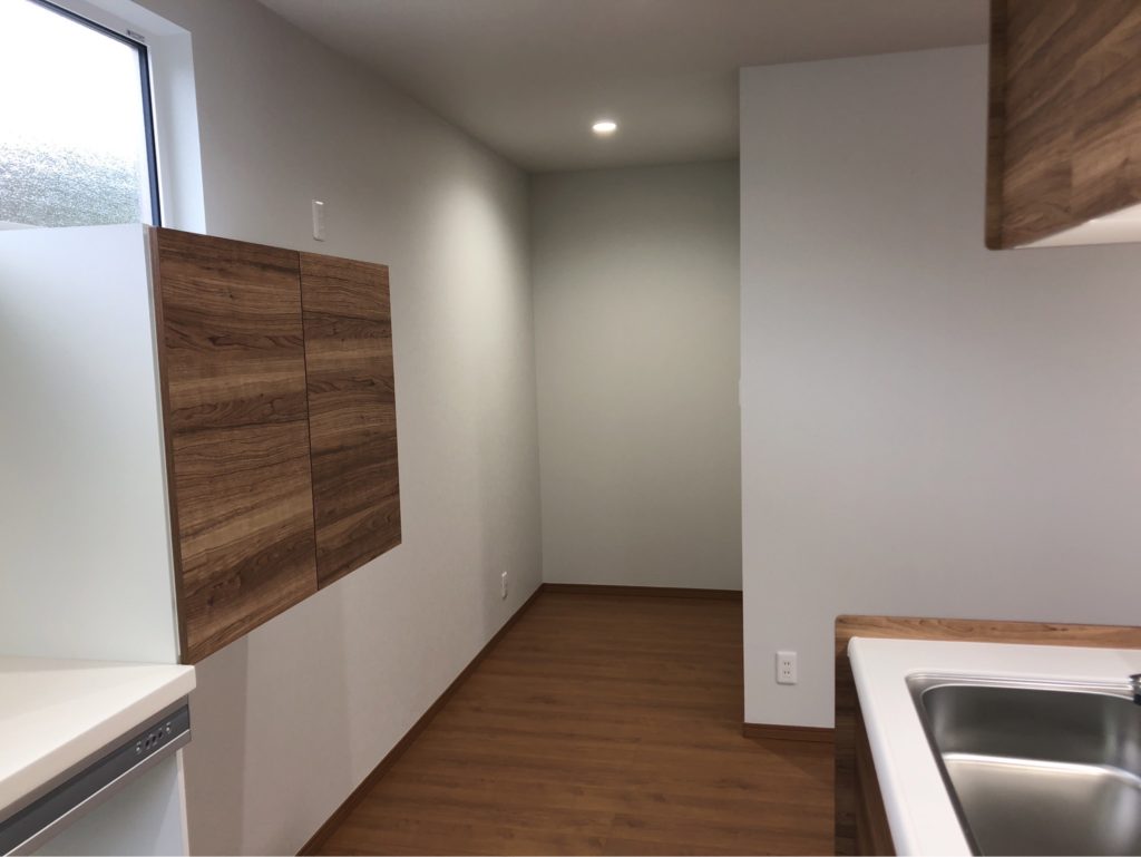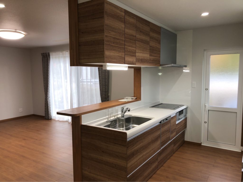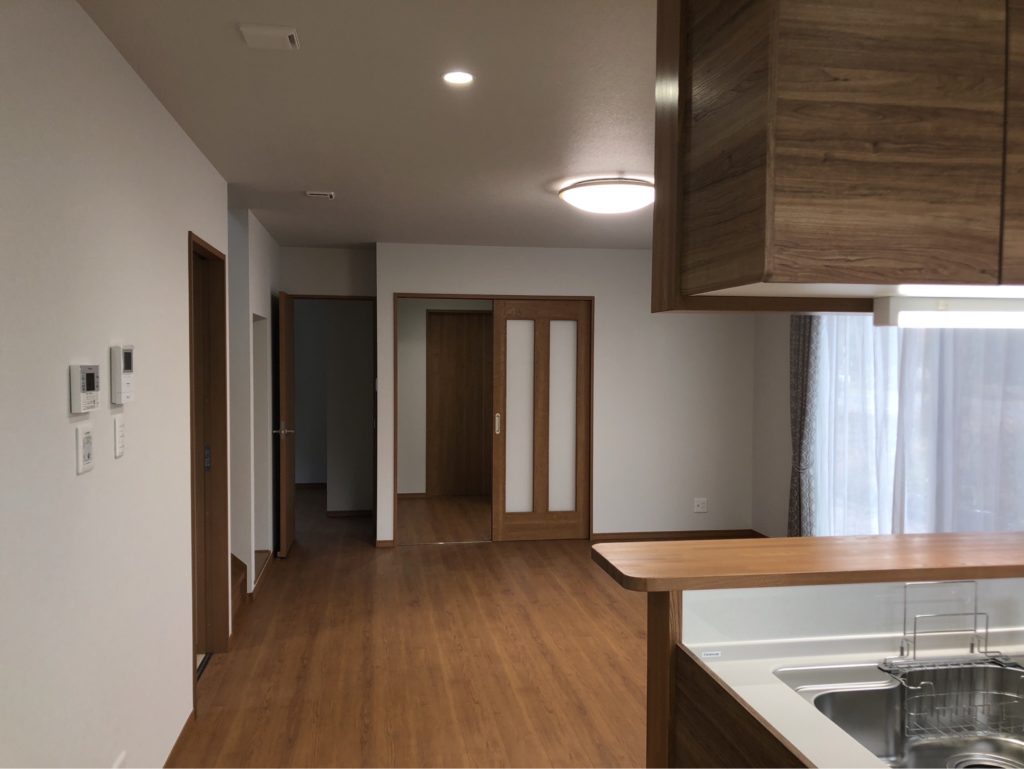 リビングダイニングキッチンの様子。内装建具と床は全てDAIKENを使用し内装に統一感を持たせました。キッチンはクリナップ製を取り付けています。キッチンの裏手はキッチンが使いやすいように収納棚やレンジ台、冷蔵庫スペースを設け、食材の搬入もしやすい様に勝手口も設置しました。