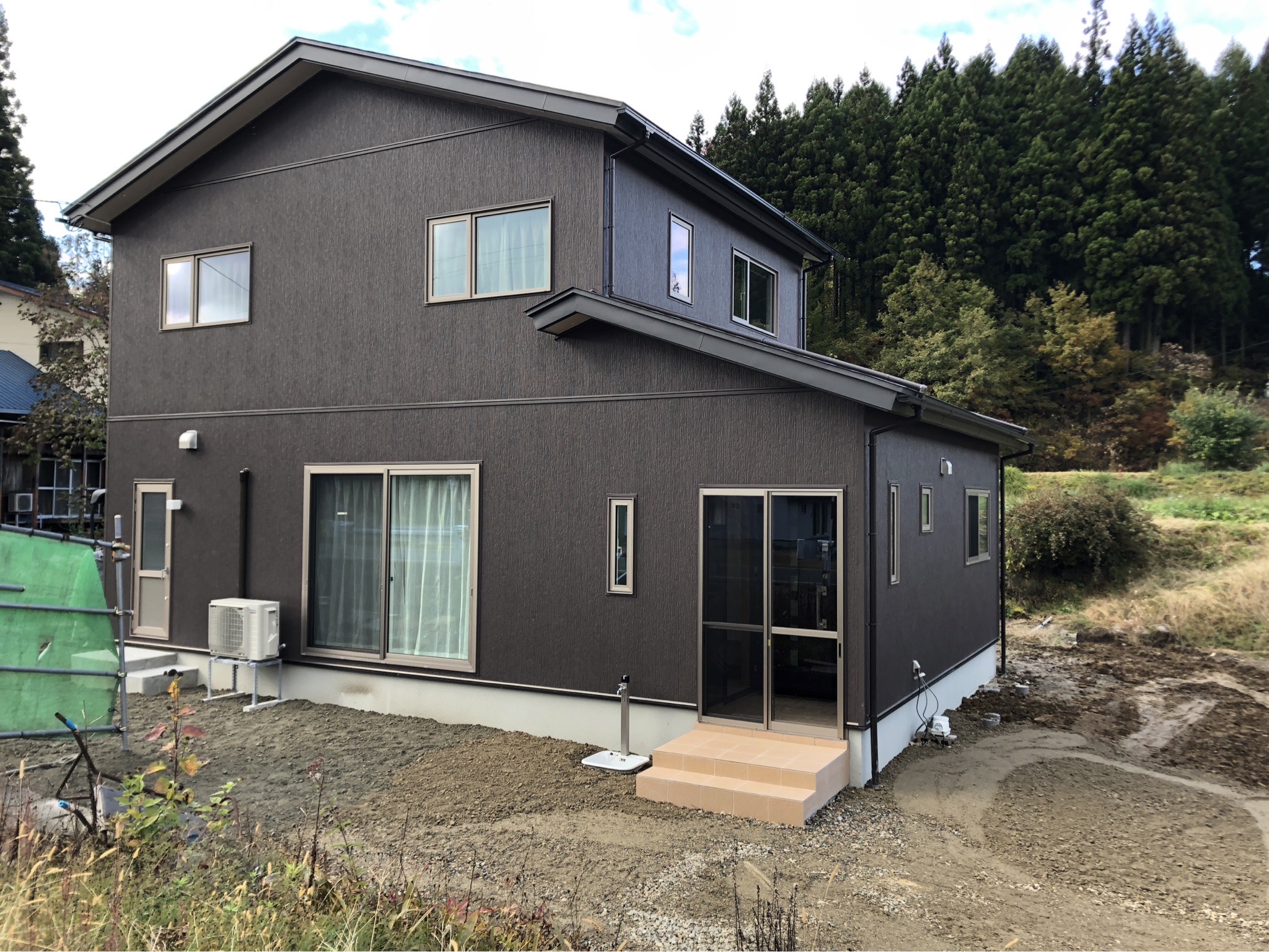 由利本荘市H様邸が完成しました。外装は表明コーティングで経年による色褪せを抑え、外観を長く保つと評判のKmewの金属サイディングを使用しています。ダークカラーですが周囲の景色から浮く事なく、寧ろバックの森林によく馴染んでいます。
