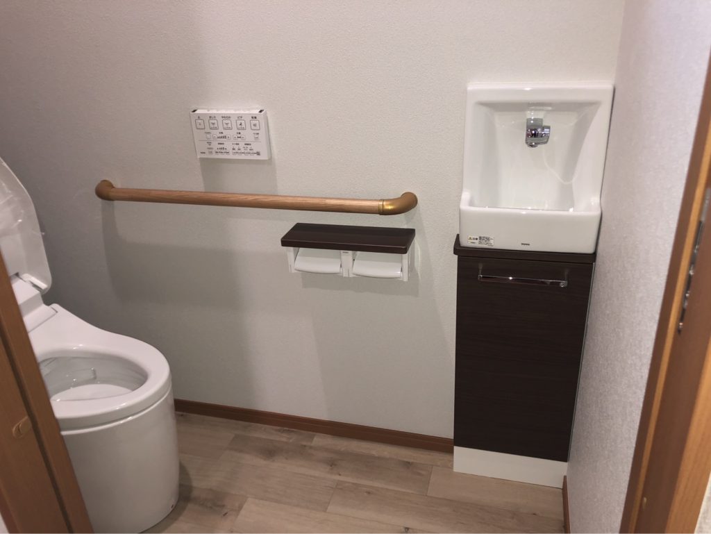トイレと手洗い器はTOTO製を設置しました。お掃除ラクラクのすっきりデザインでスリムなフォルムから空間が広々と感じることができる便座です。