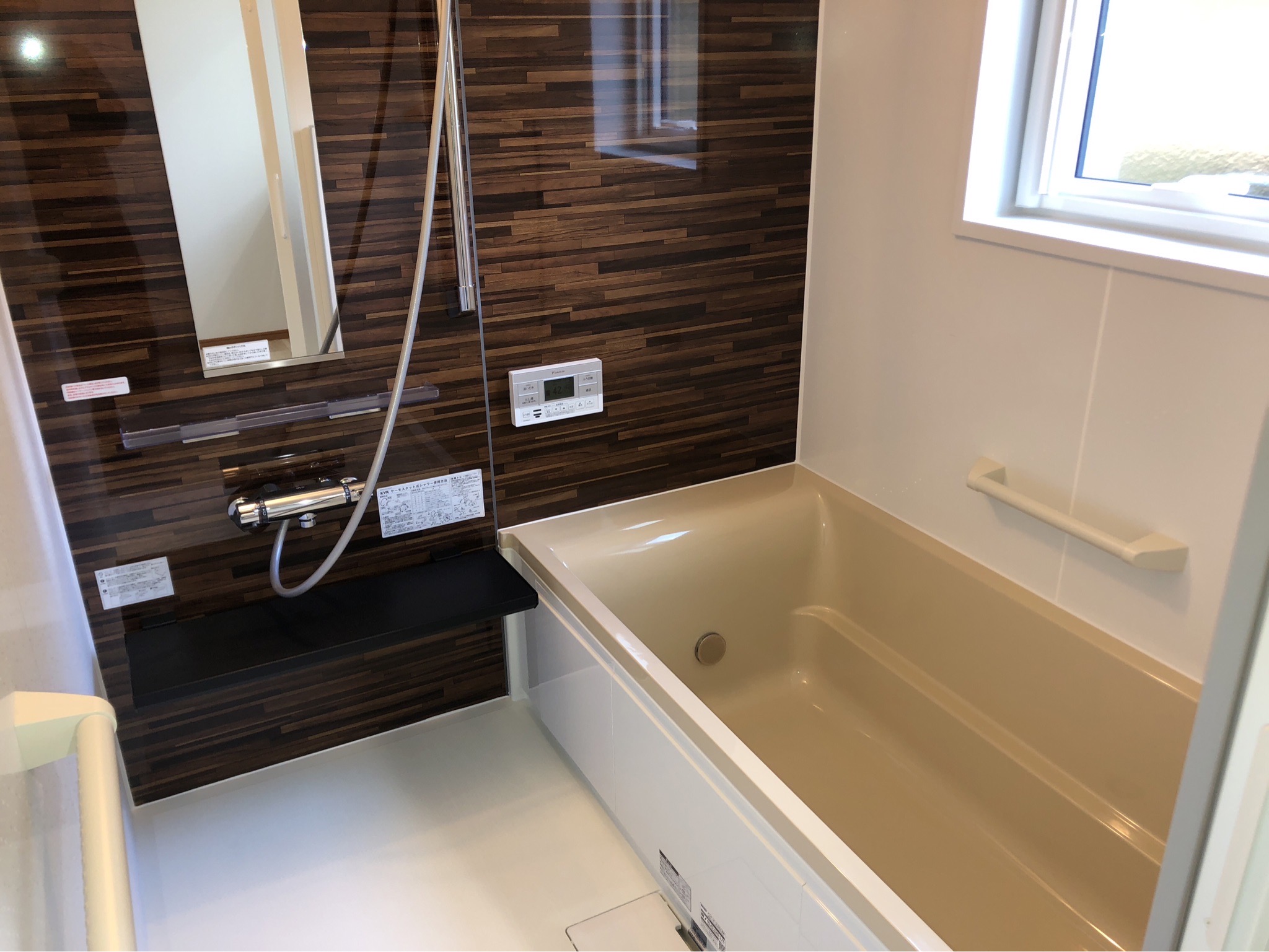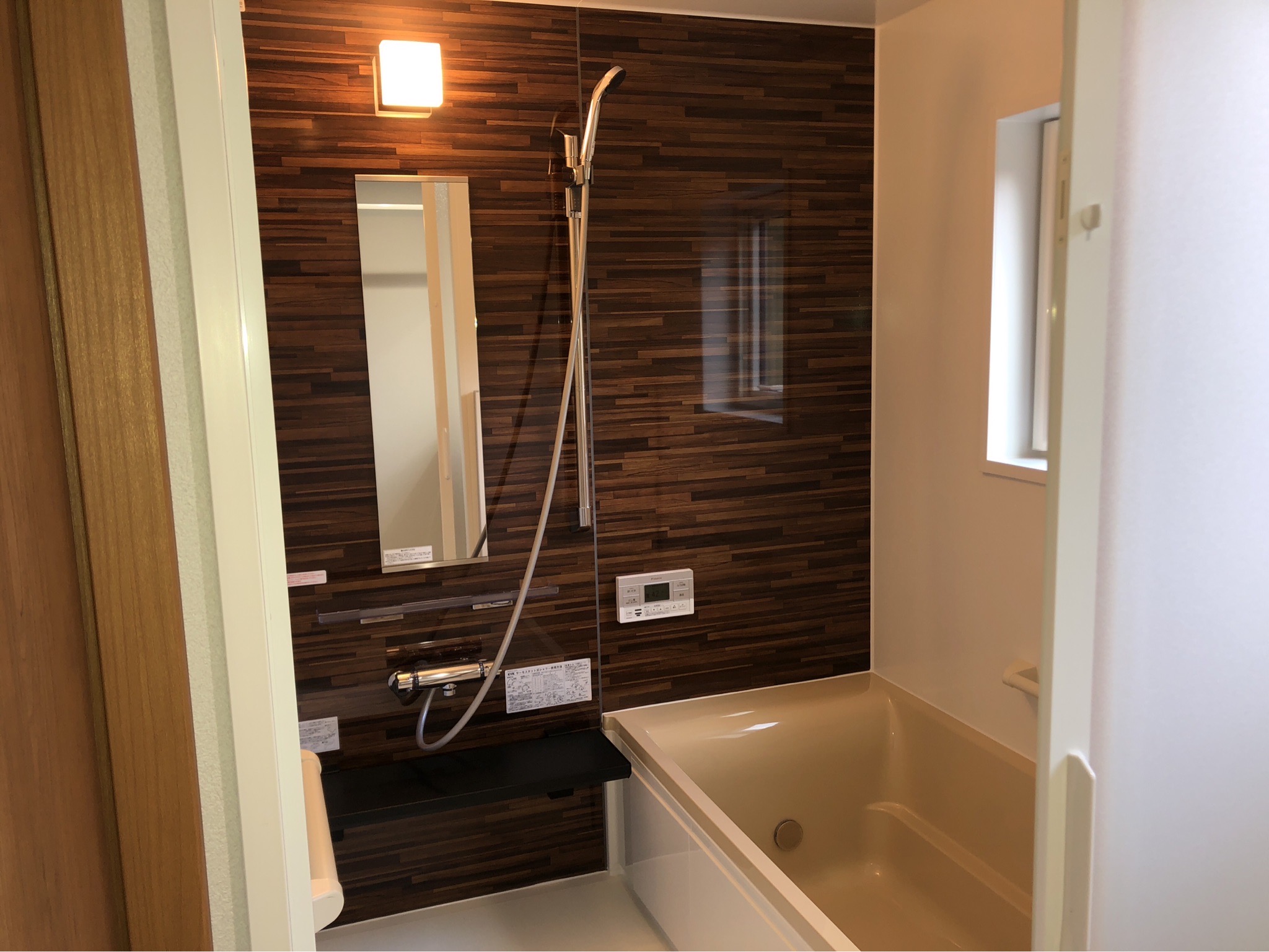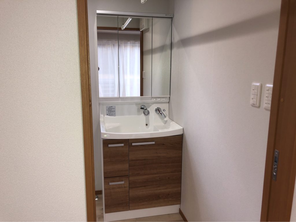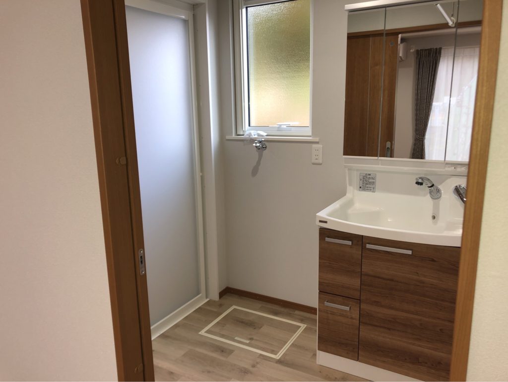 洗面化粧台とシステムバスはクリナップ製を取り付けました。白+木目調パネルで色合いを室内と合わせた形です。