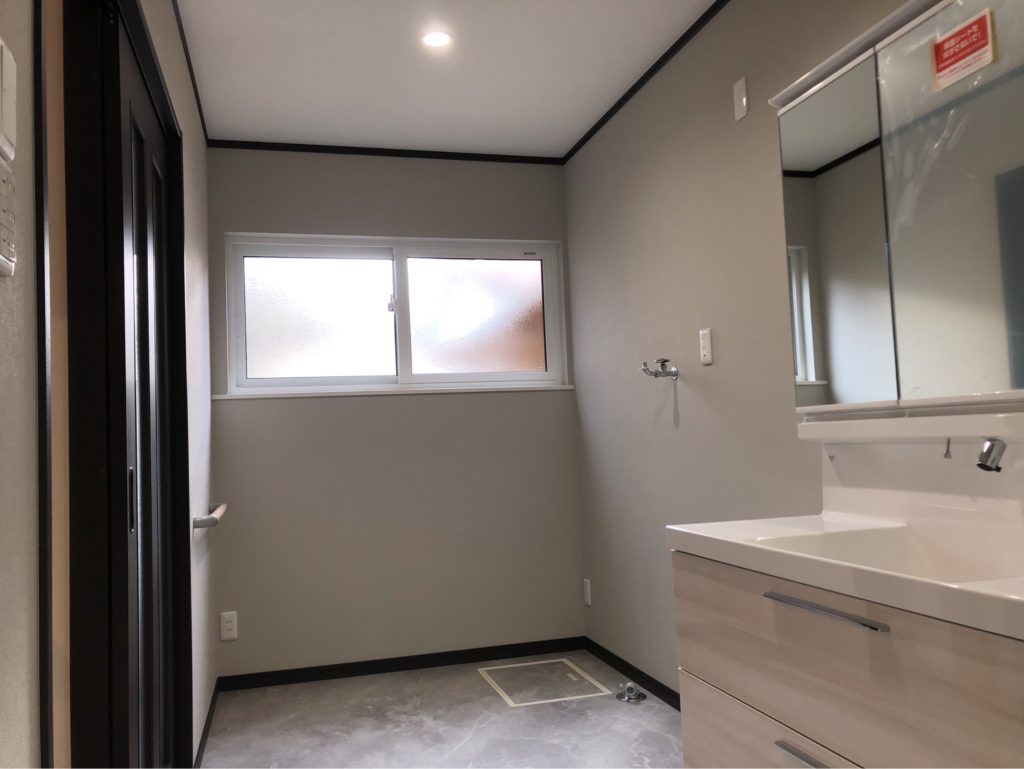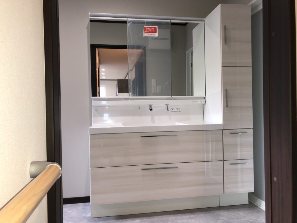 浴室前脱衣所部分にはLIXIL製LC(エルシィ)W1200とトールキャビネットW300。通常の洗面化粧台より大きめのサイズでゆったりと余裕を持って使用することができます。