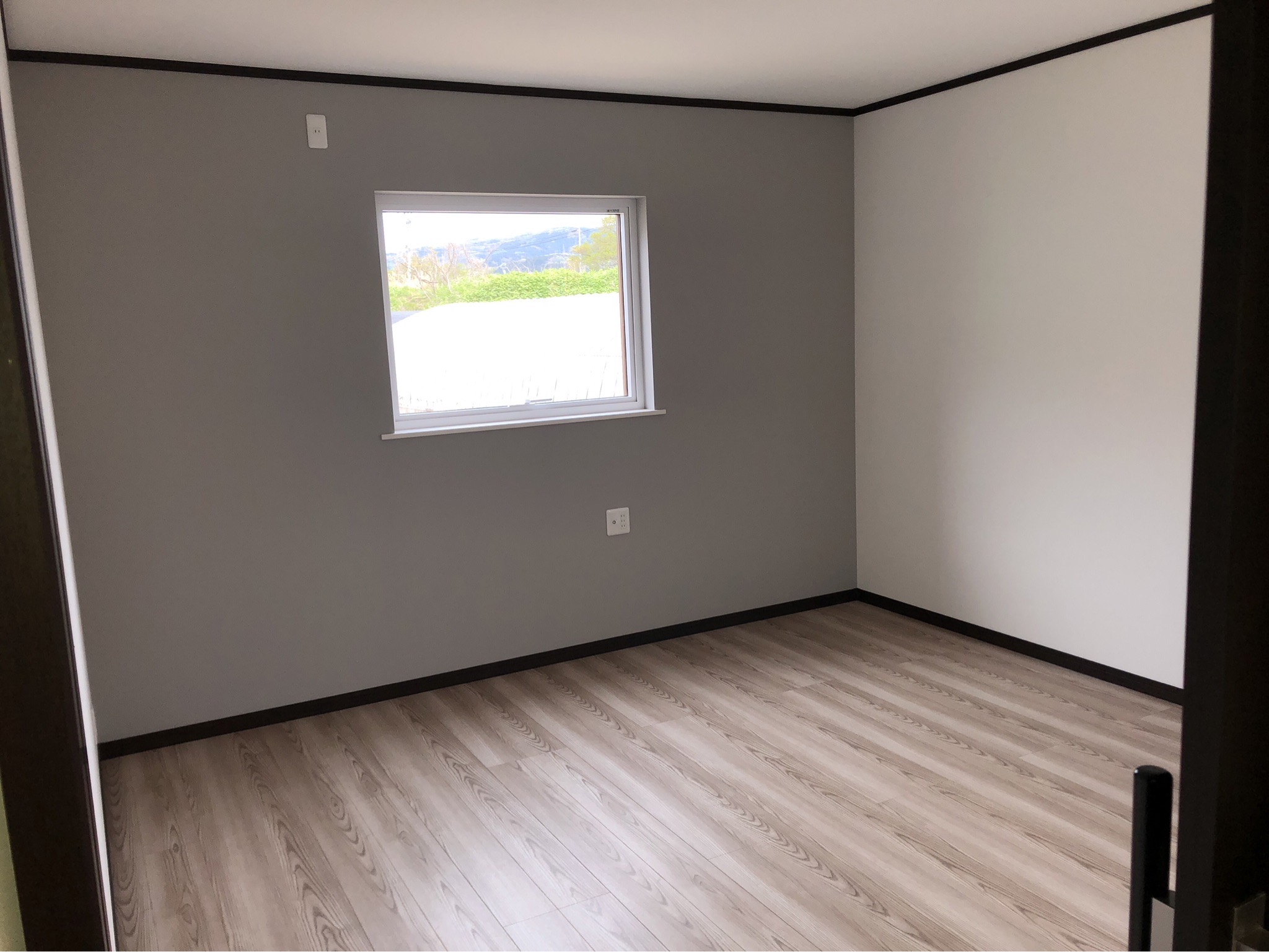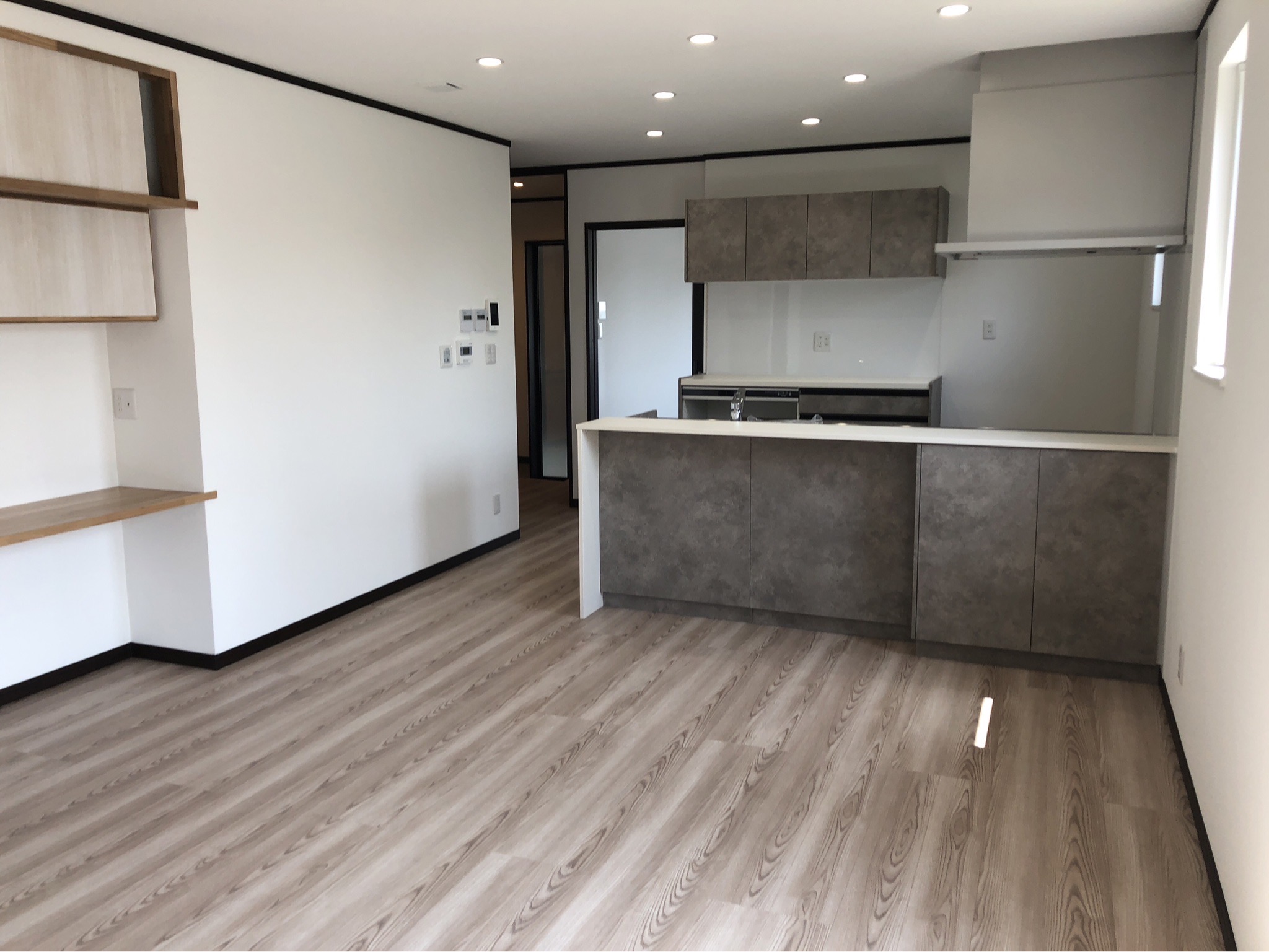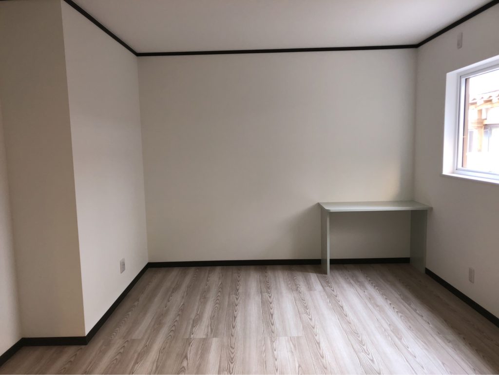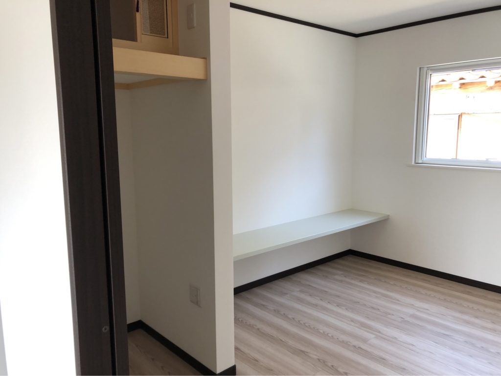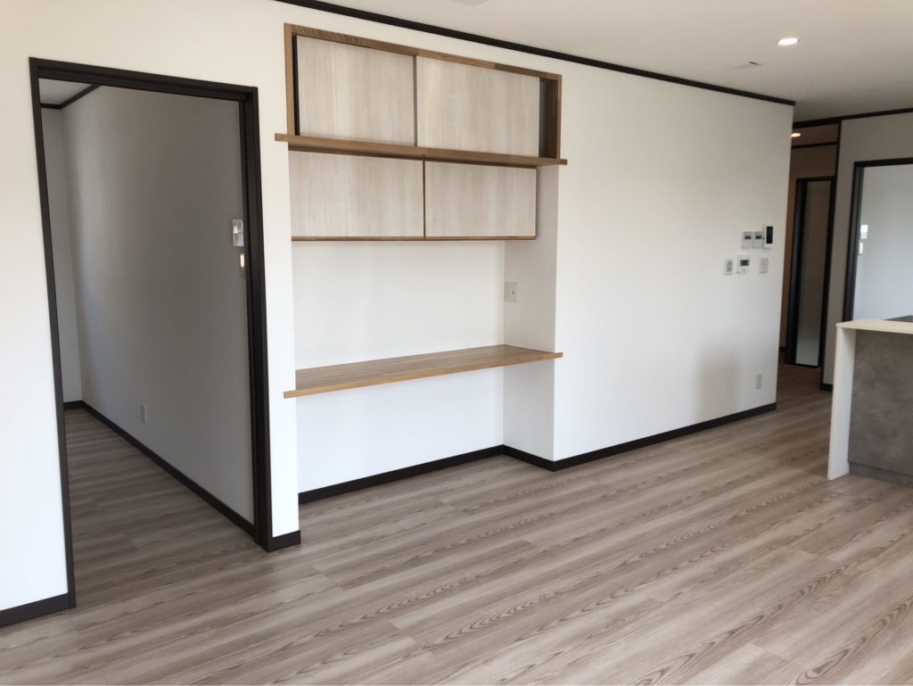 部屋の様子。洋室には施主様が希望された寸法のカウンターを設置しています。窓と内装建具は三協アルミ製の製品を取り付けました。