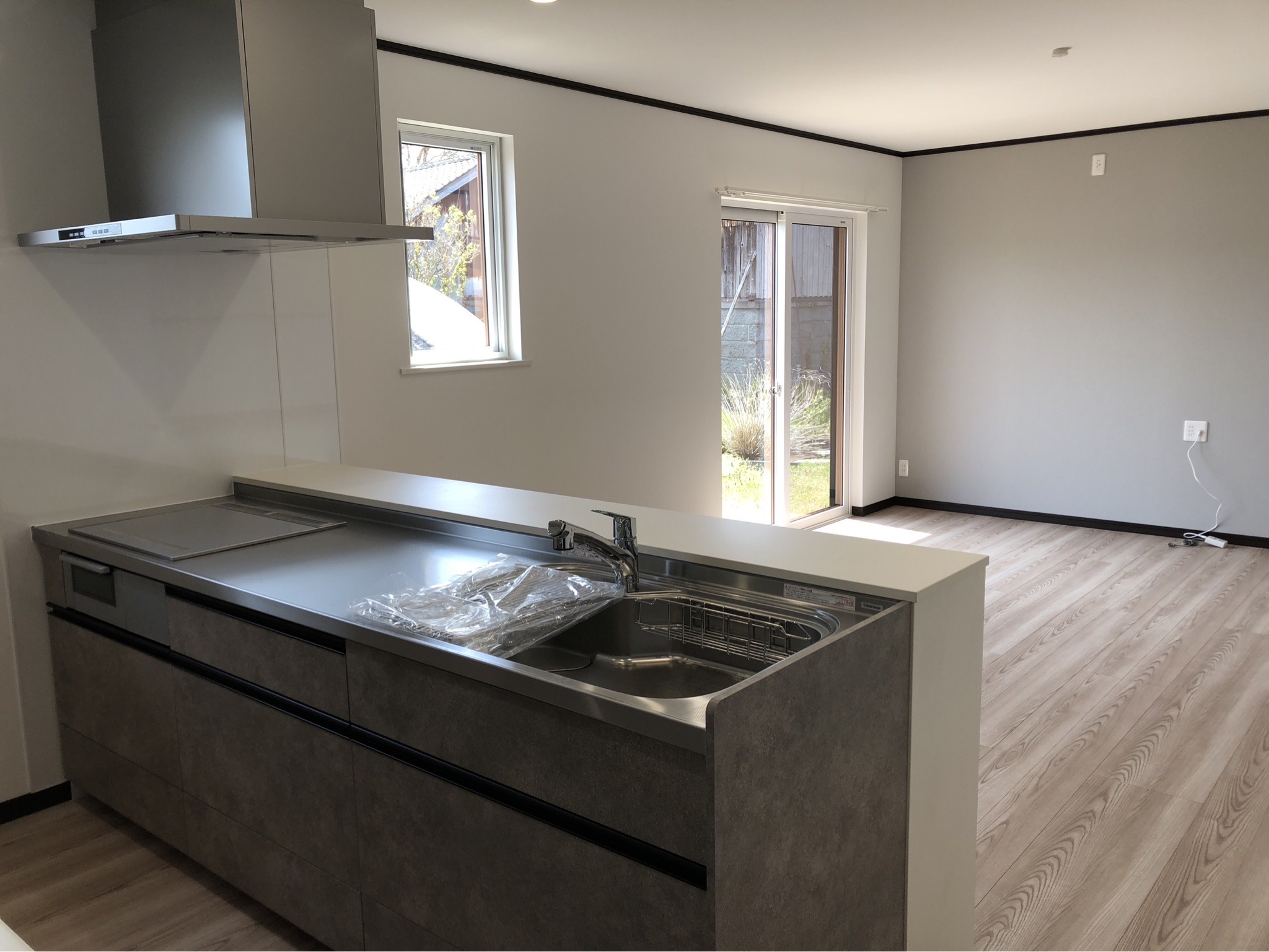 施主様こだわりのキッチンはクリナップ製のSTEDIA(ステディア)、硬質なセラミックコーティングで汚れと傷が付きづらく清潔を保ちやすいと評判のキッチンです。レンジフードは給水トレイにお湯を入れてボタンを押すだけで自動洗浄してくれる「洗エールレンジフード」付。さらに利便性の高いマグネット対応パネルとなっています。