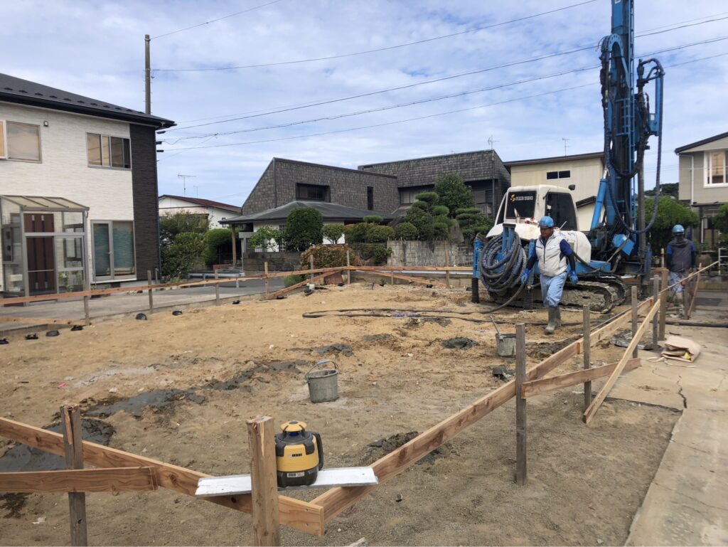 PP(ピュアパイル)工法による地盤改良。地中にコンクリートの柱を作り災害に強い地盤を作ります。