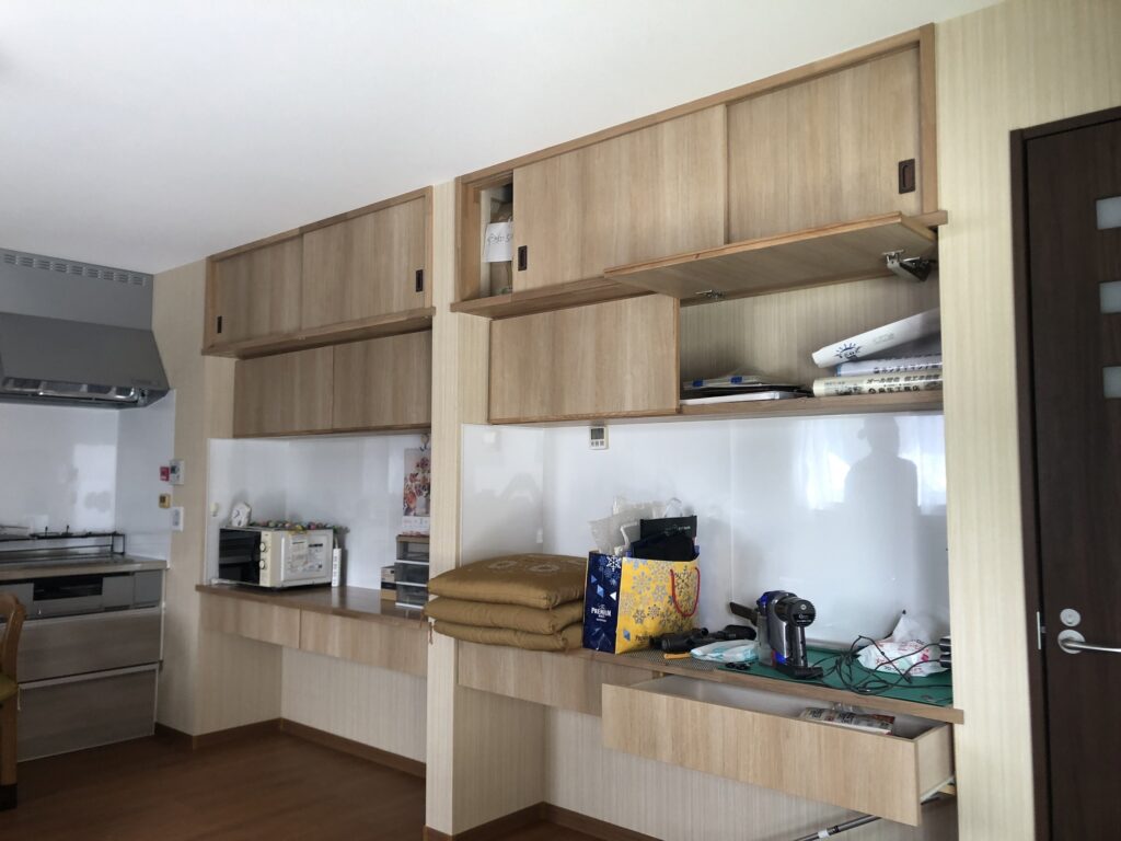 キッチン部分には大きめの建て付けの引き戸、引き出しを備え付けました。