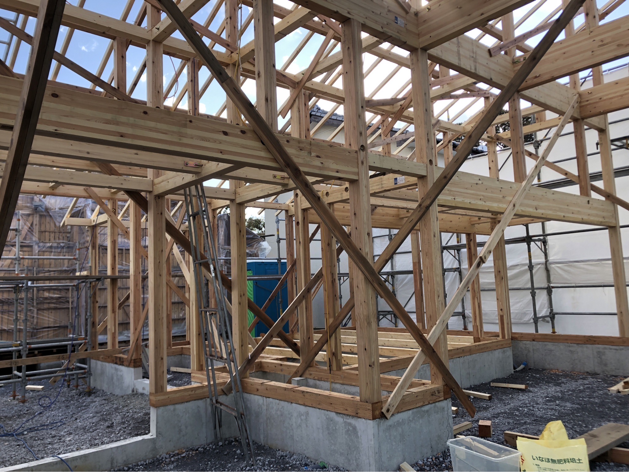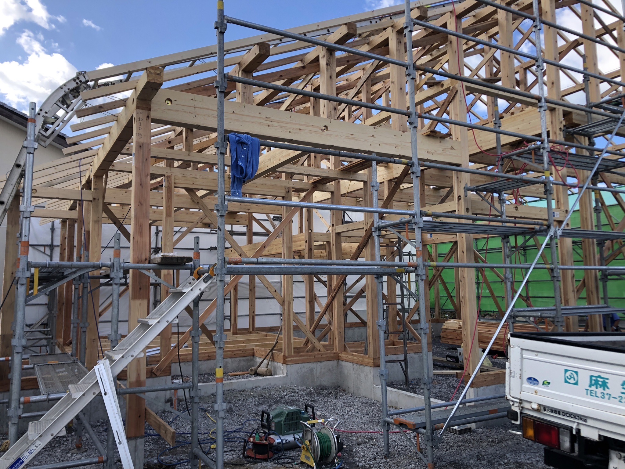 基礎部分のコンクリートが固まったので建て方開始。柱と梁を組んでいきます。