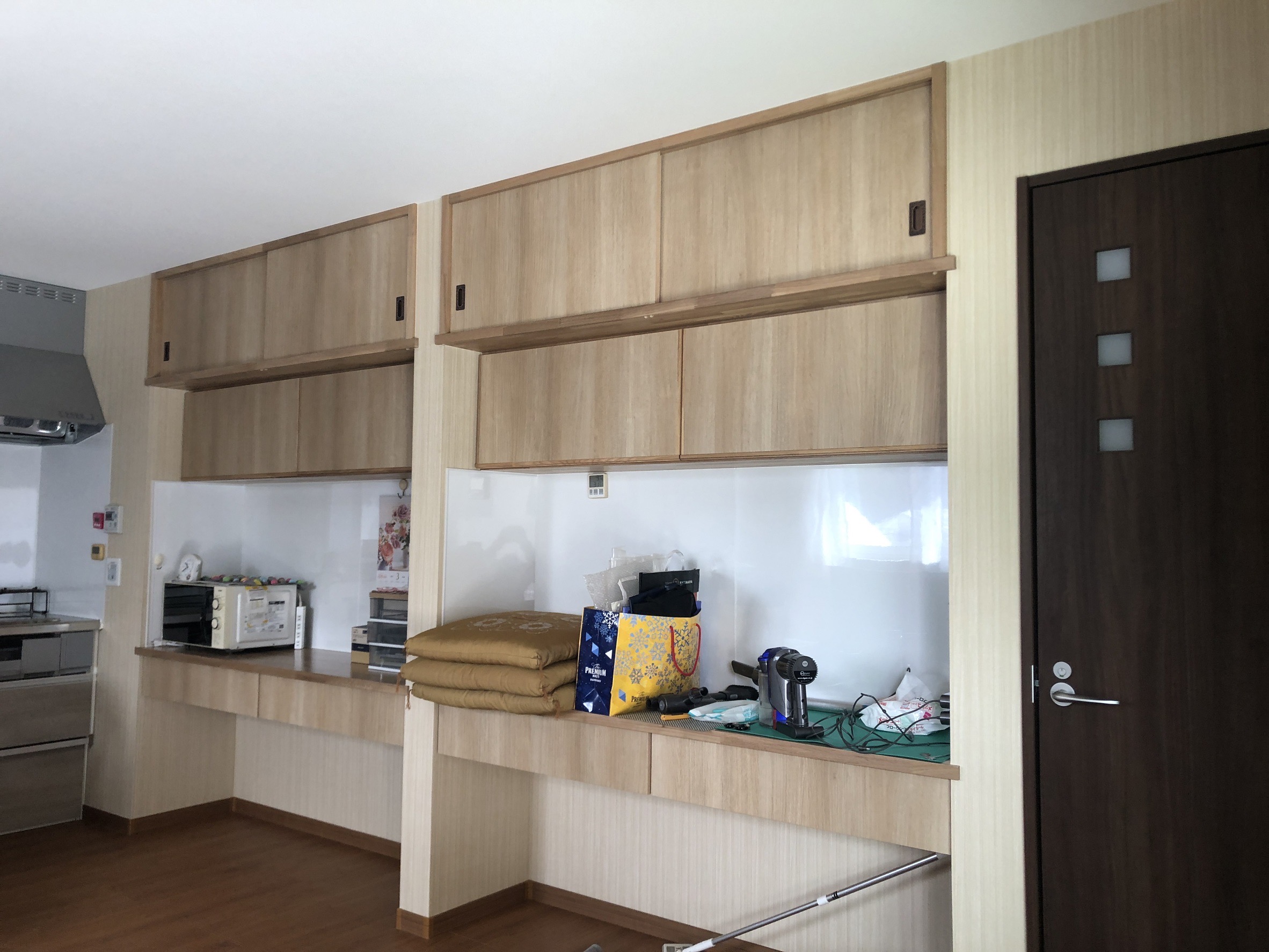 キッチン部分には大きめの建て付けの引き戸、引き出しを備え付けました。