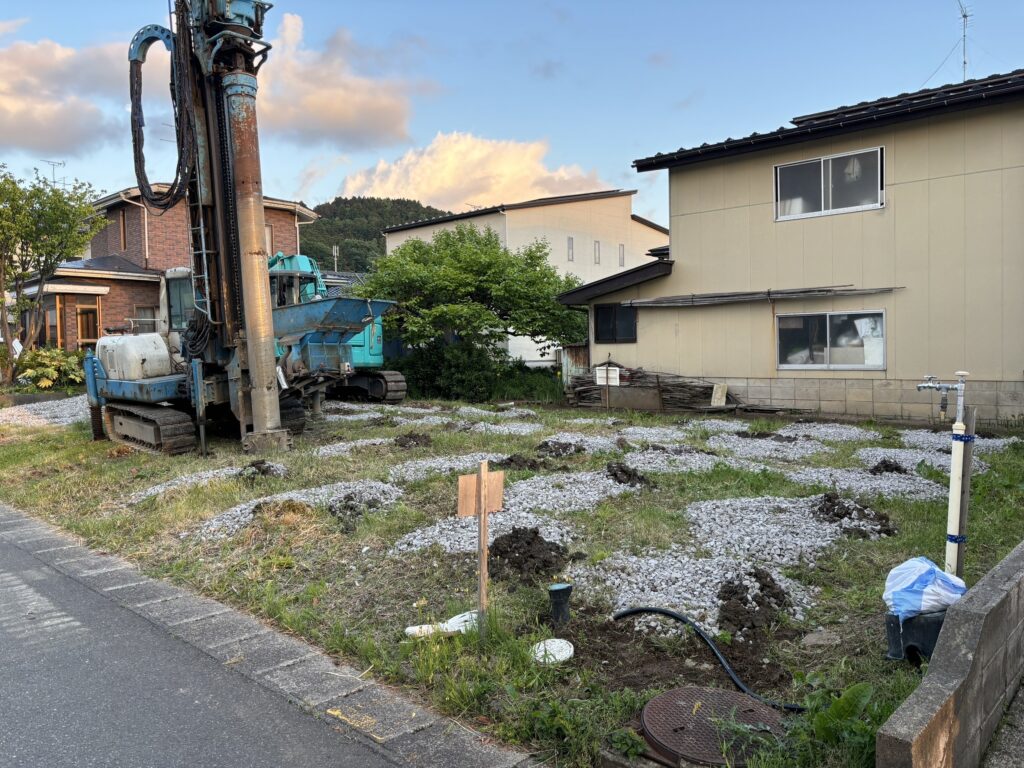 まずは土地の地盤改良から行います。今回はエコジオ工法で行いました。エコジオ工法とはセメントや鋼管を使わず、砕石だけを締め固めて柱状にして地盤を補強する工法です。 環境や土地価値への影響が少なく環境に優しい地盤改良の手法です。
