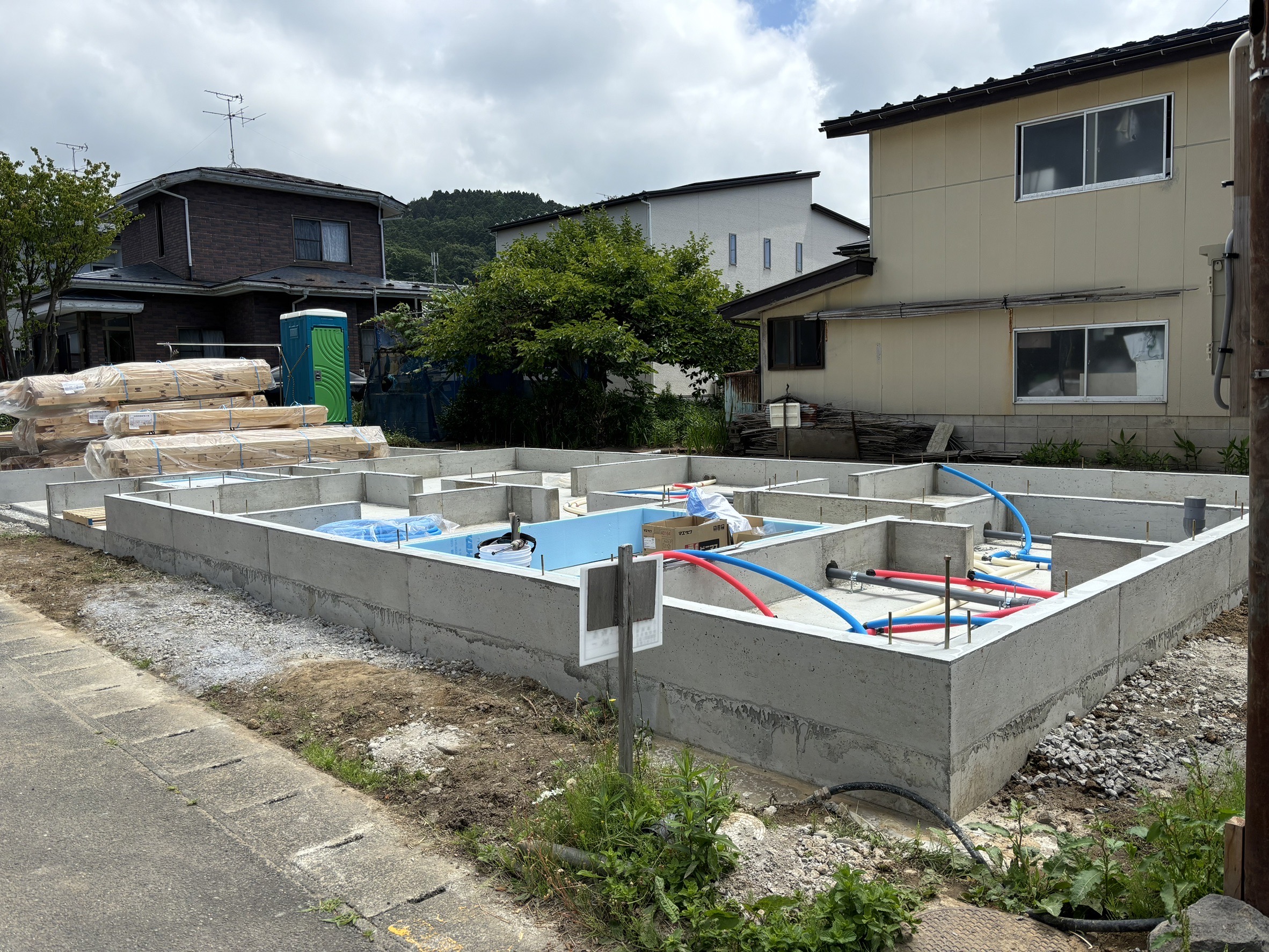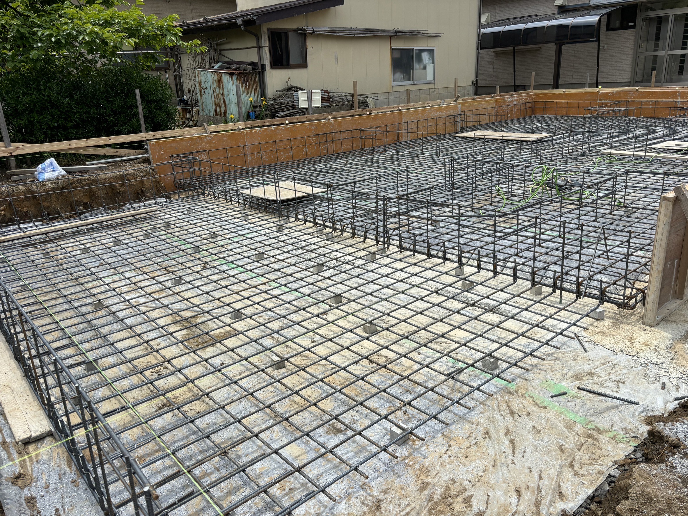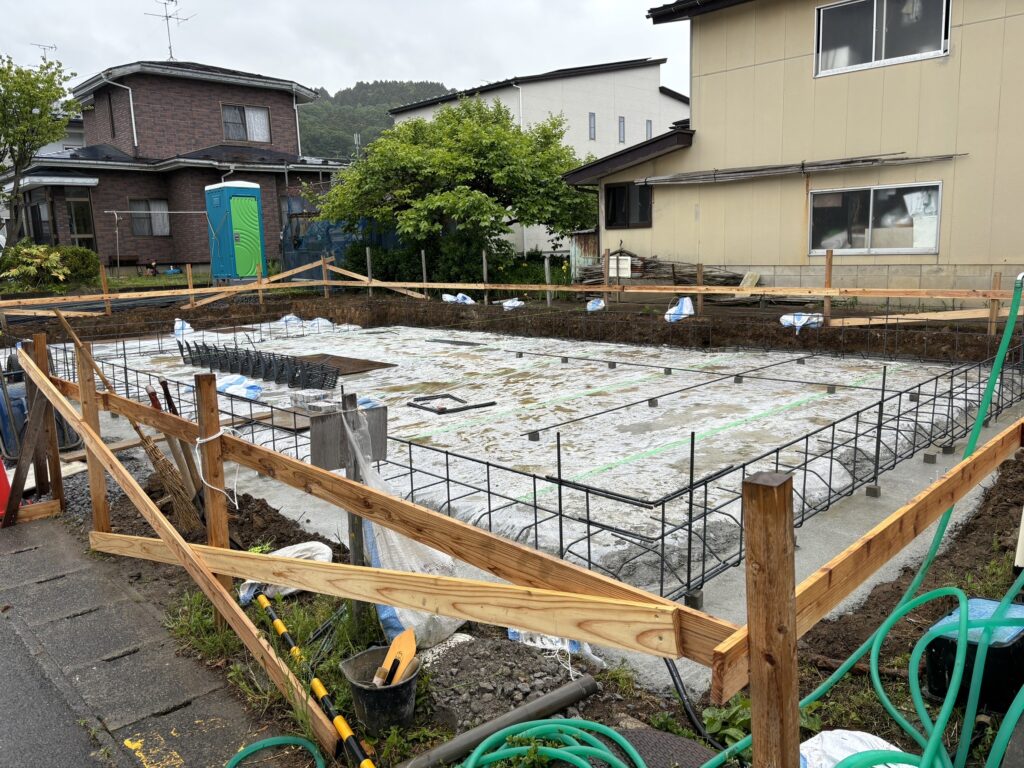 上記の写真では地面からの湿気を防ぐため防湿シートをひき、その上に捨てコンクリートと呼ばれる基礎の形成に必要な型枠の土台を作ります。
