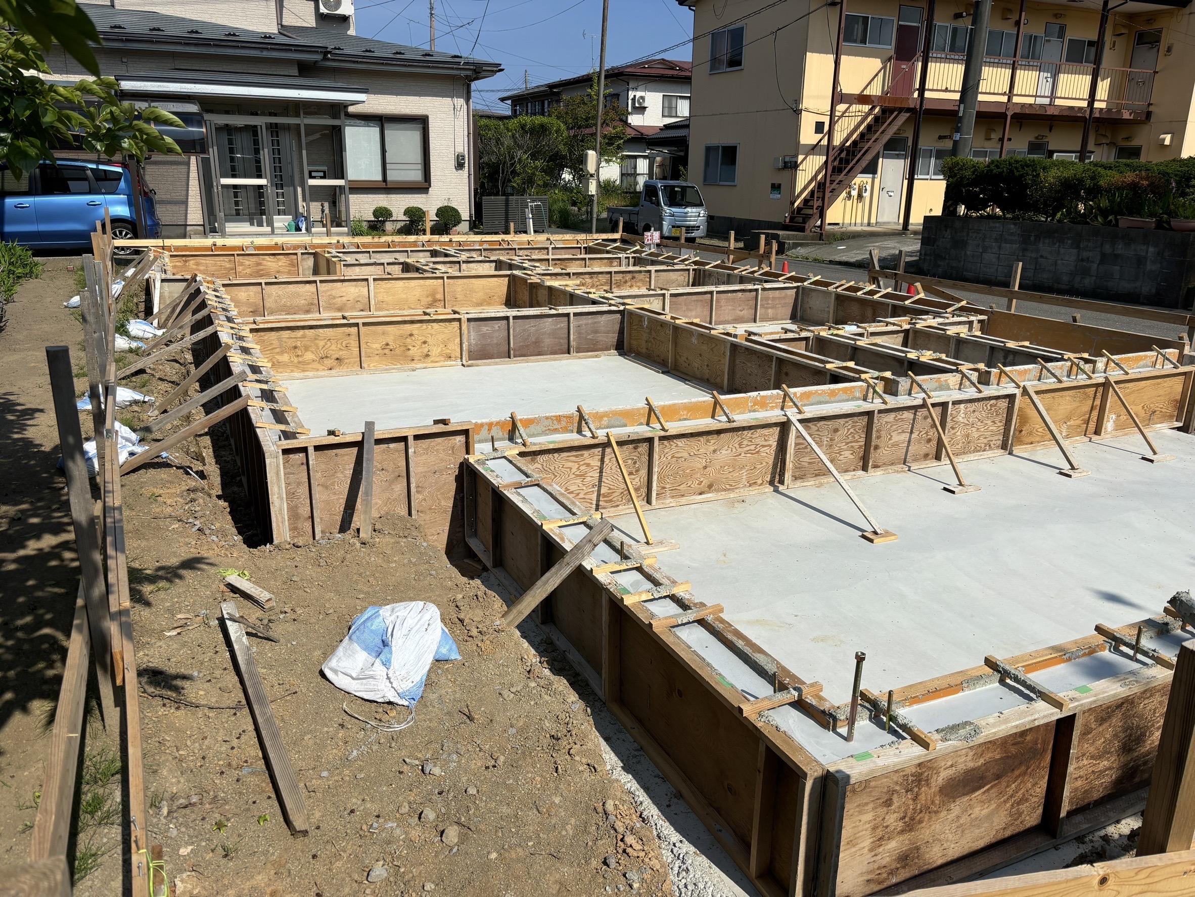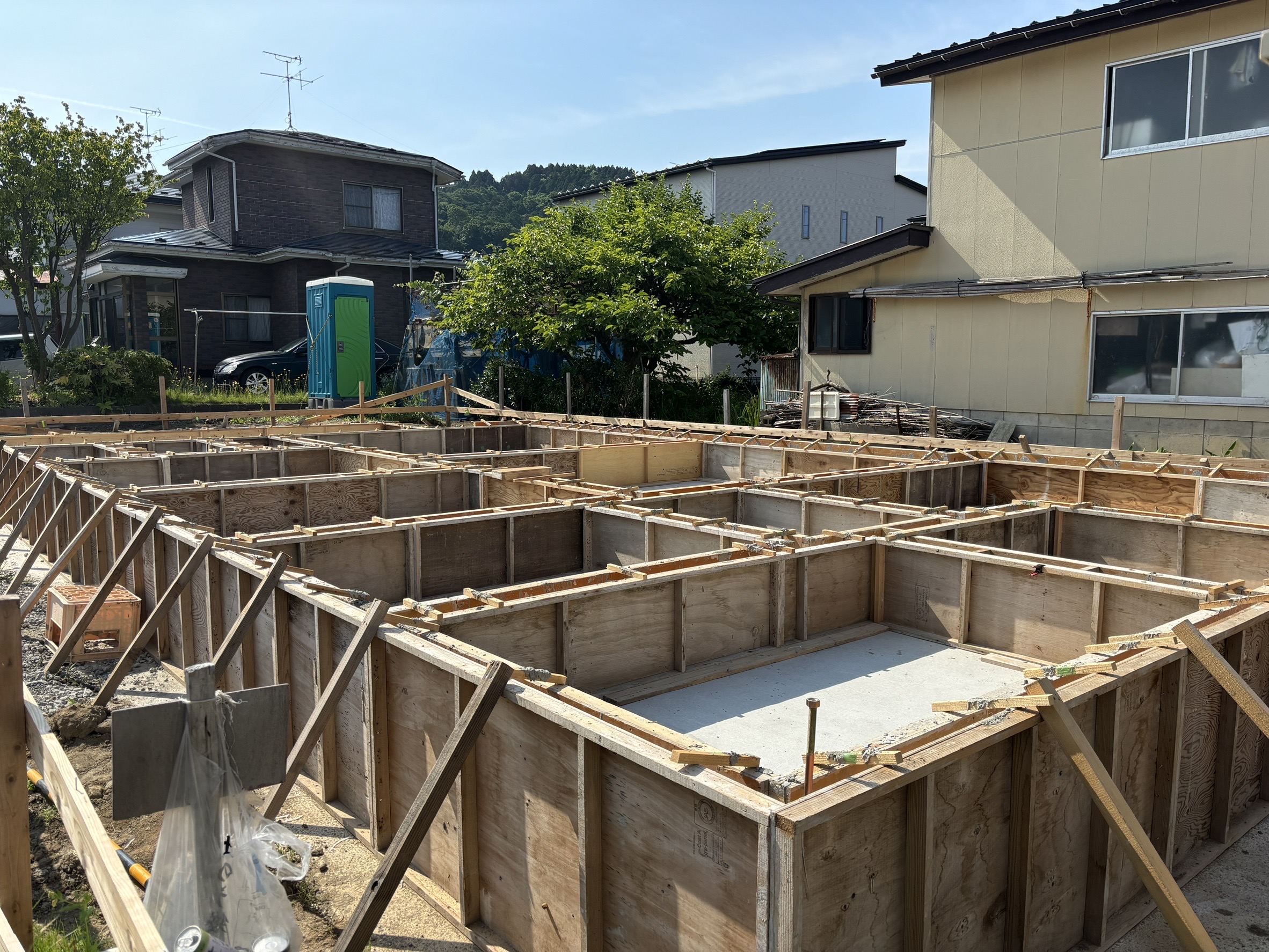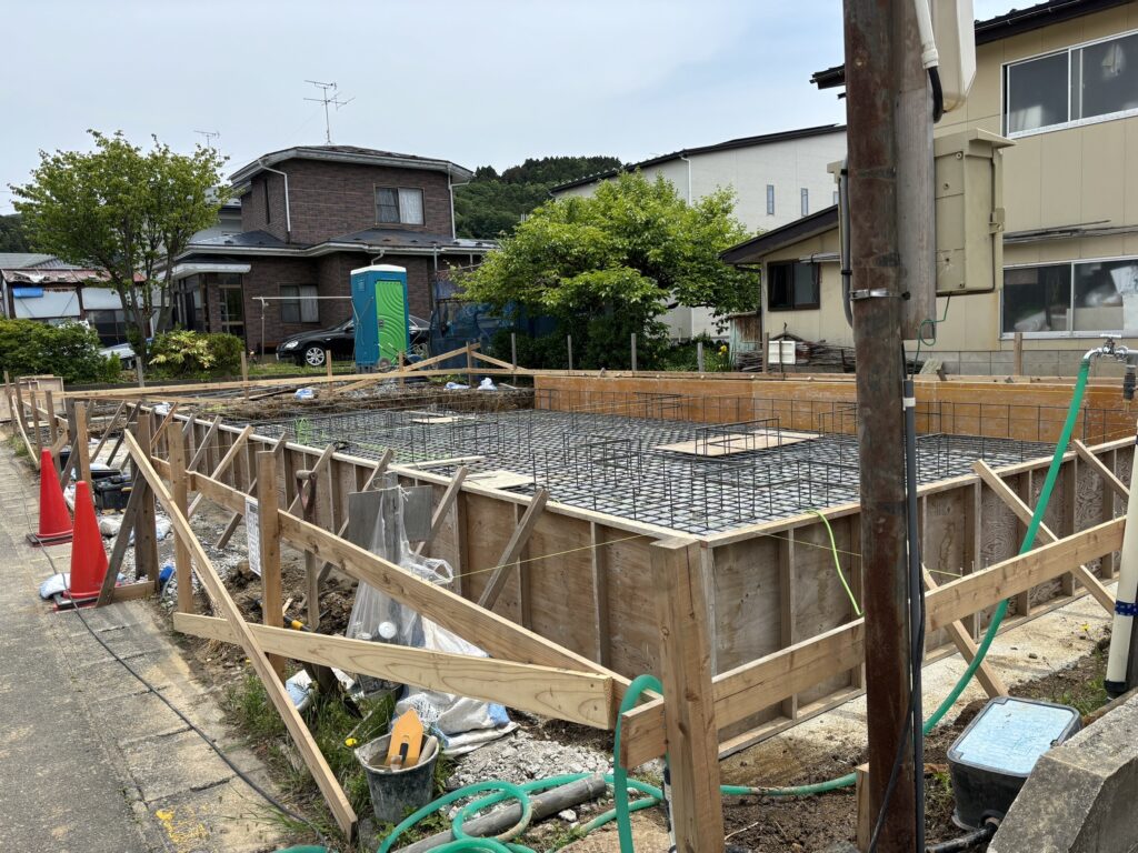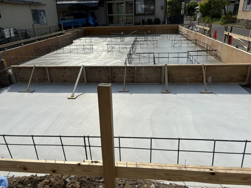 配筋検査完了後、型枠を組み上げコンクリートを流し込み建物の基礎を作ります。コンクリートをじっくりと乾かした後型枠を外していきます。