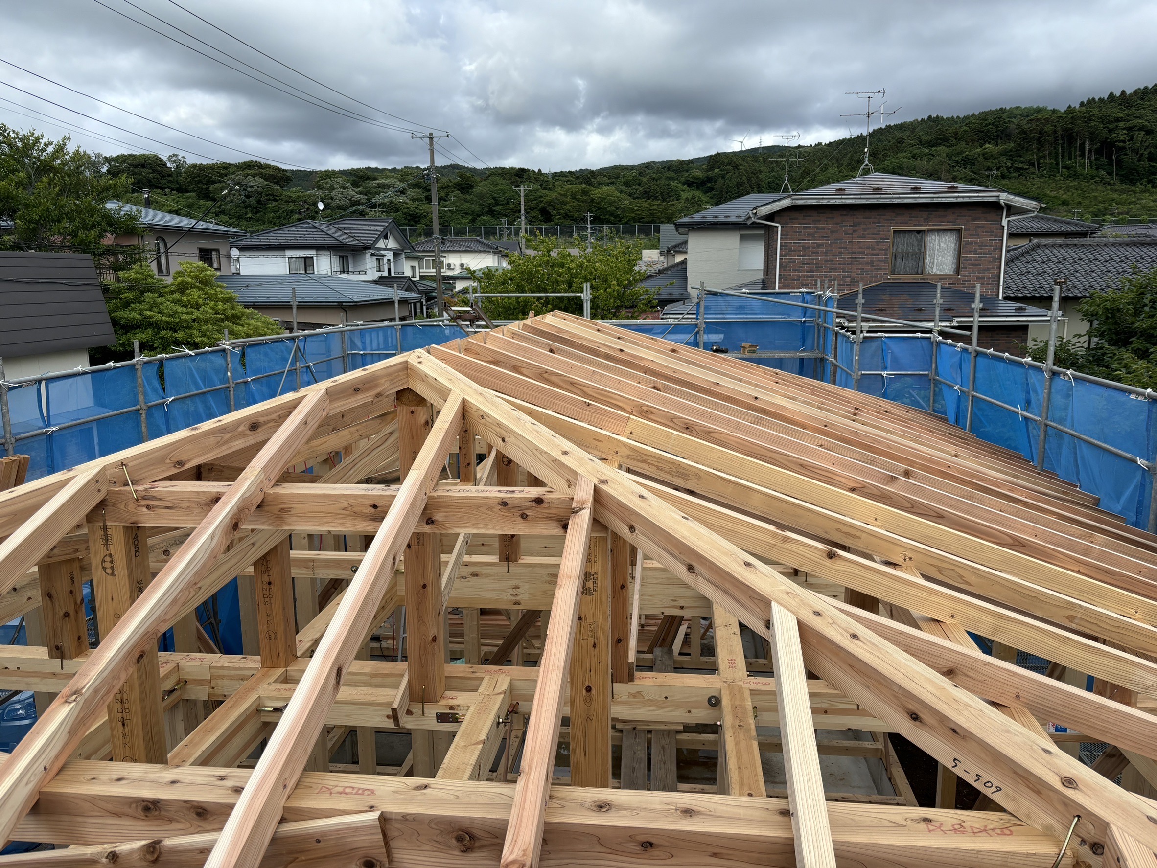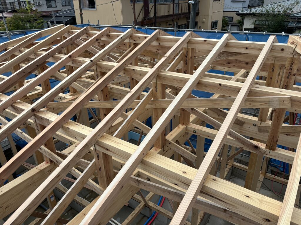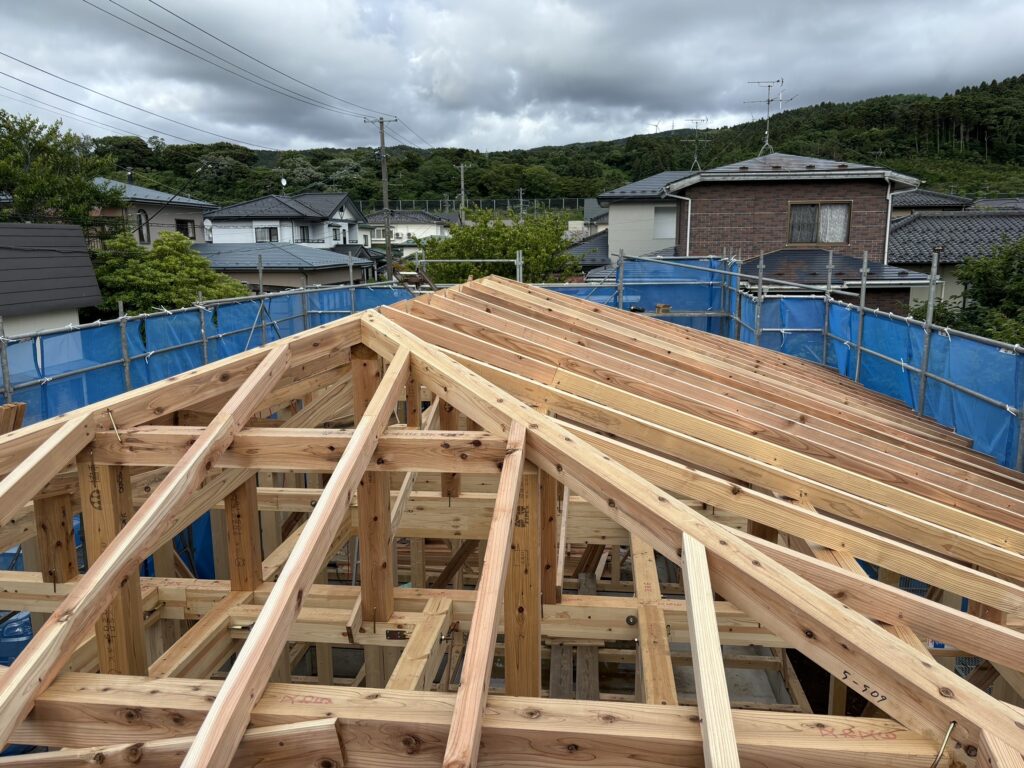 屋根部分の柱が組み上がりました。こちらに野地板を貼り付けその上に防水シートであるルーフィング材を貼り付けその上に軽量瓦を敷いていきます。