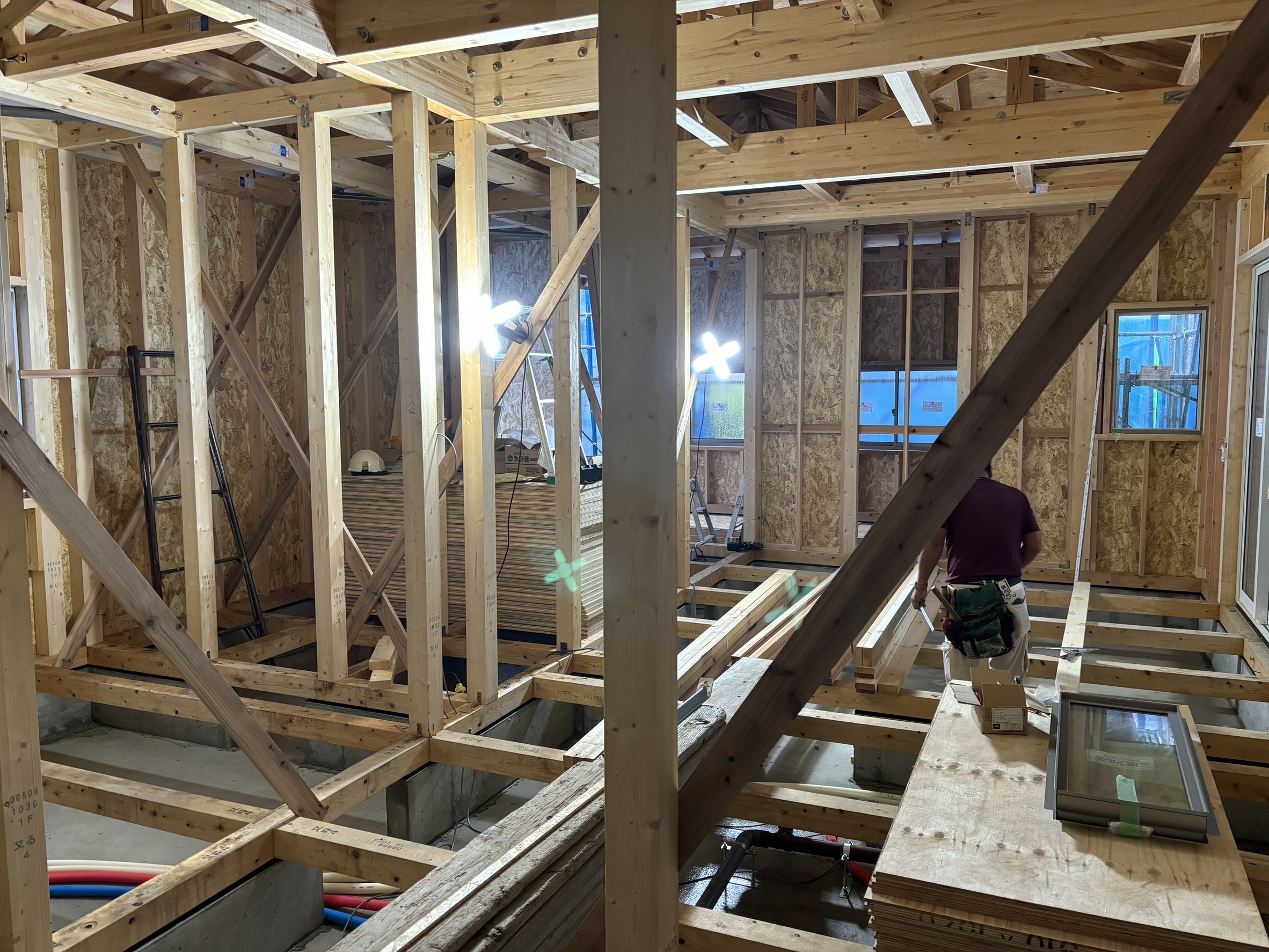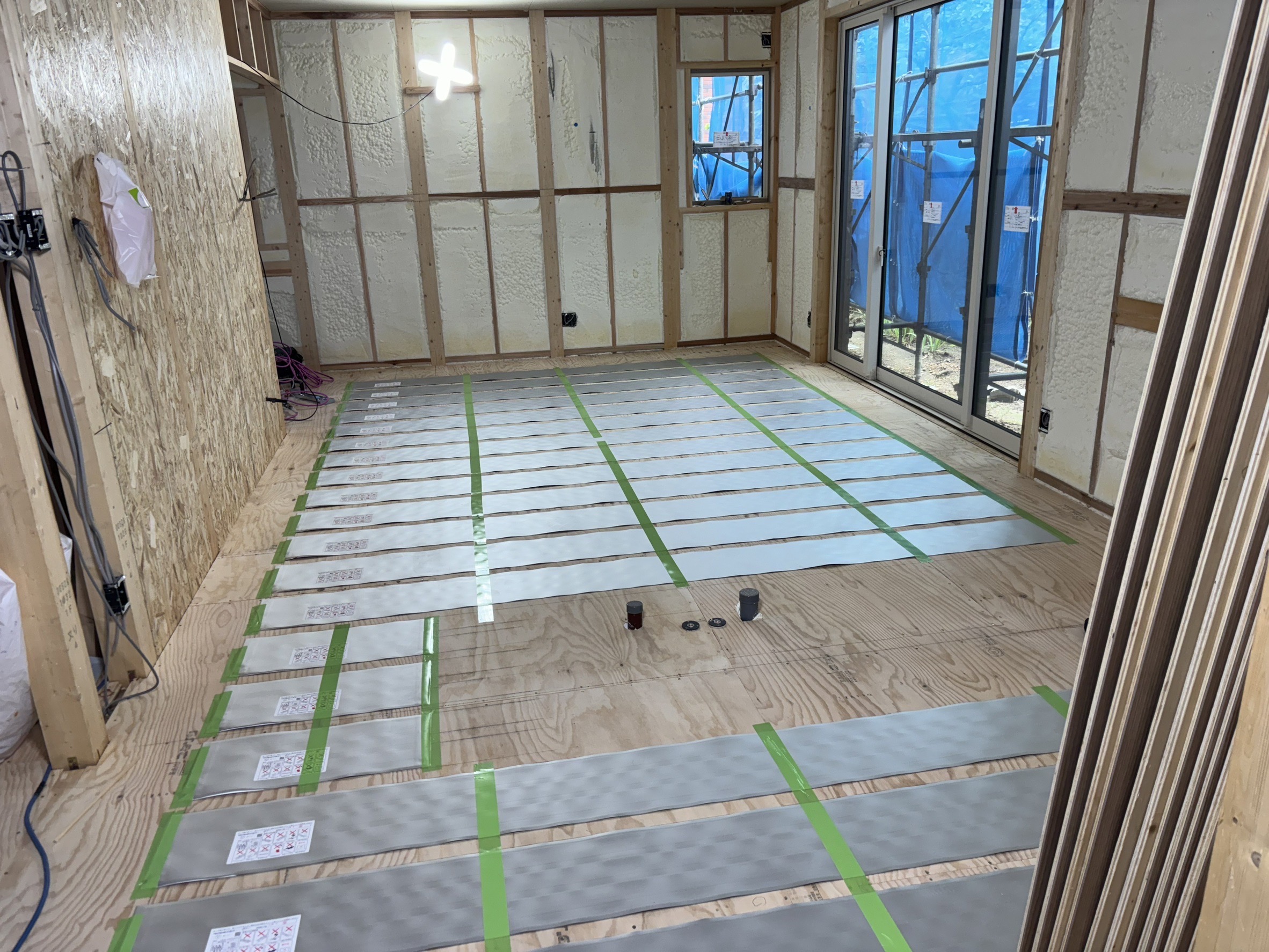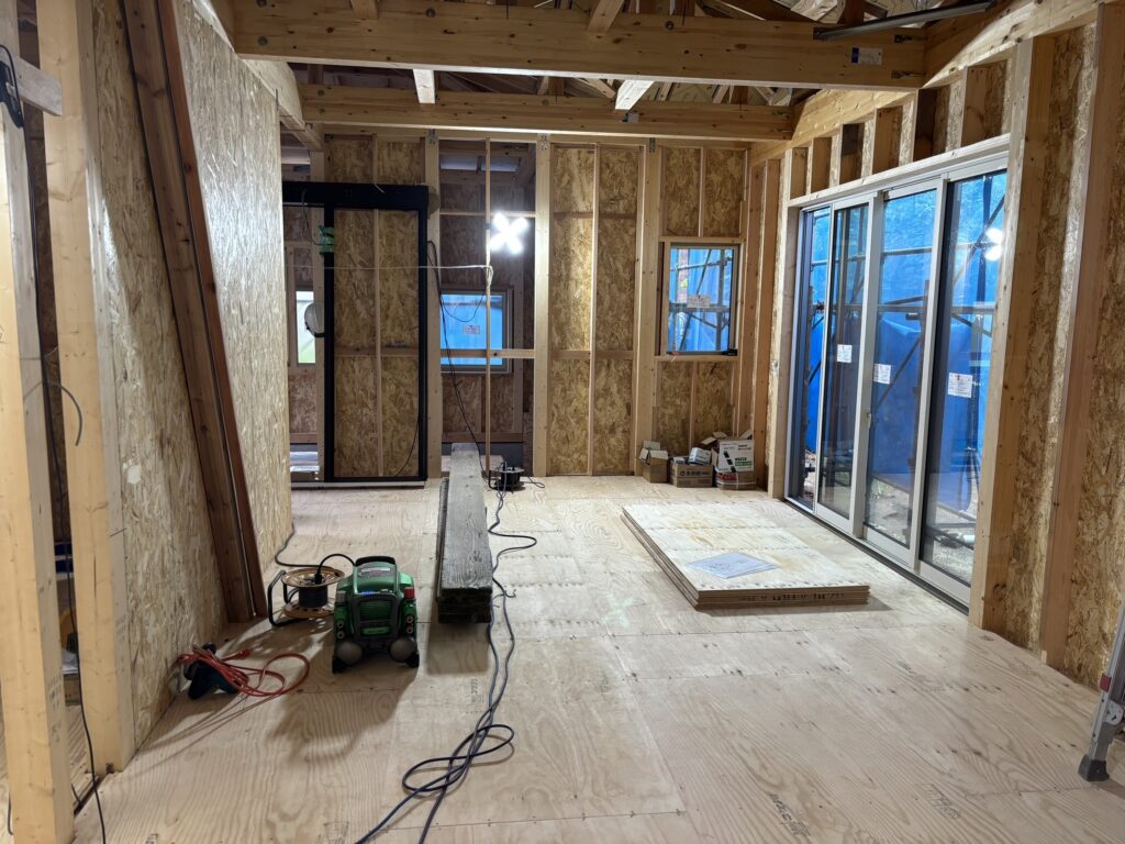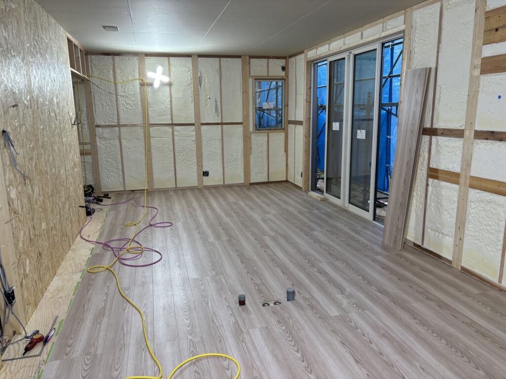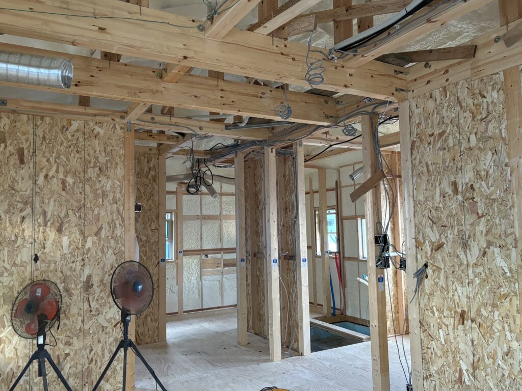 室内の通気口、配管・配線工事が完了しました。まずは床板を貼りその後天井部分を製作していきます。