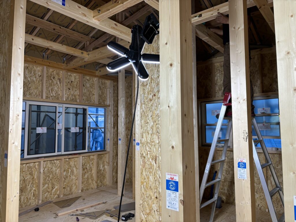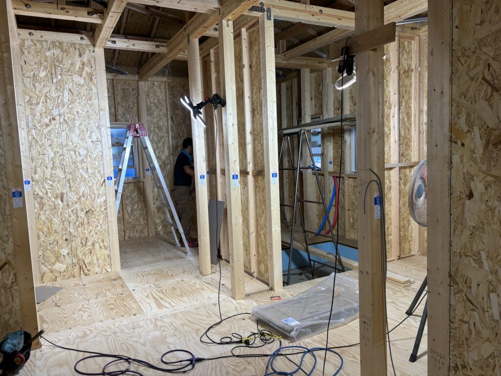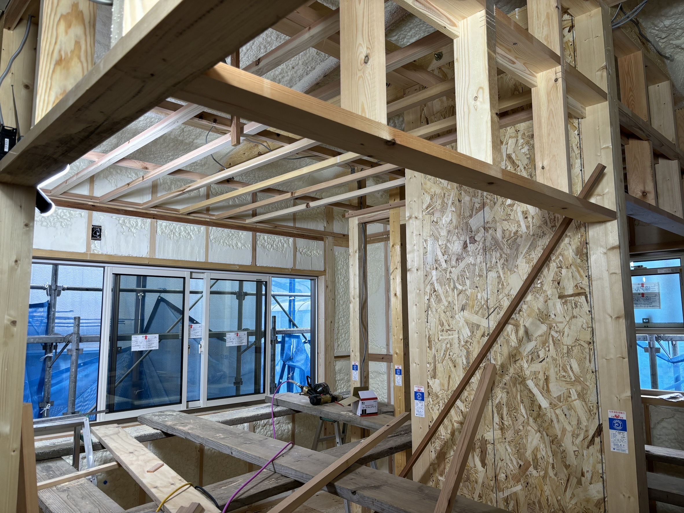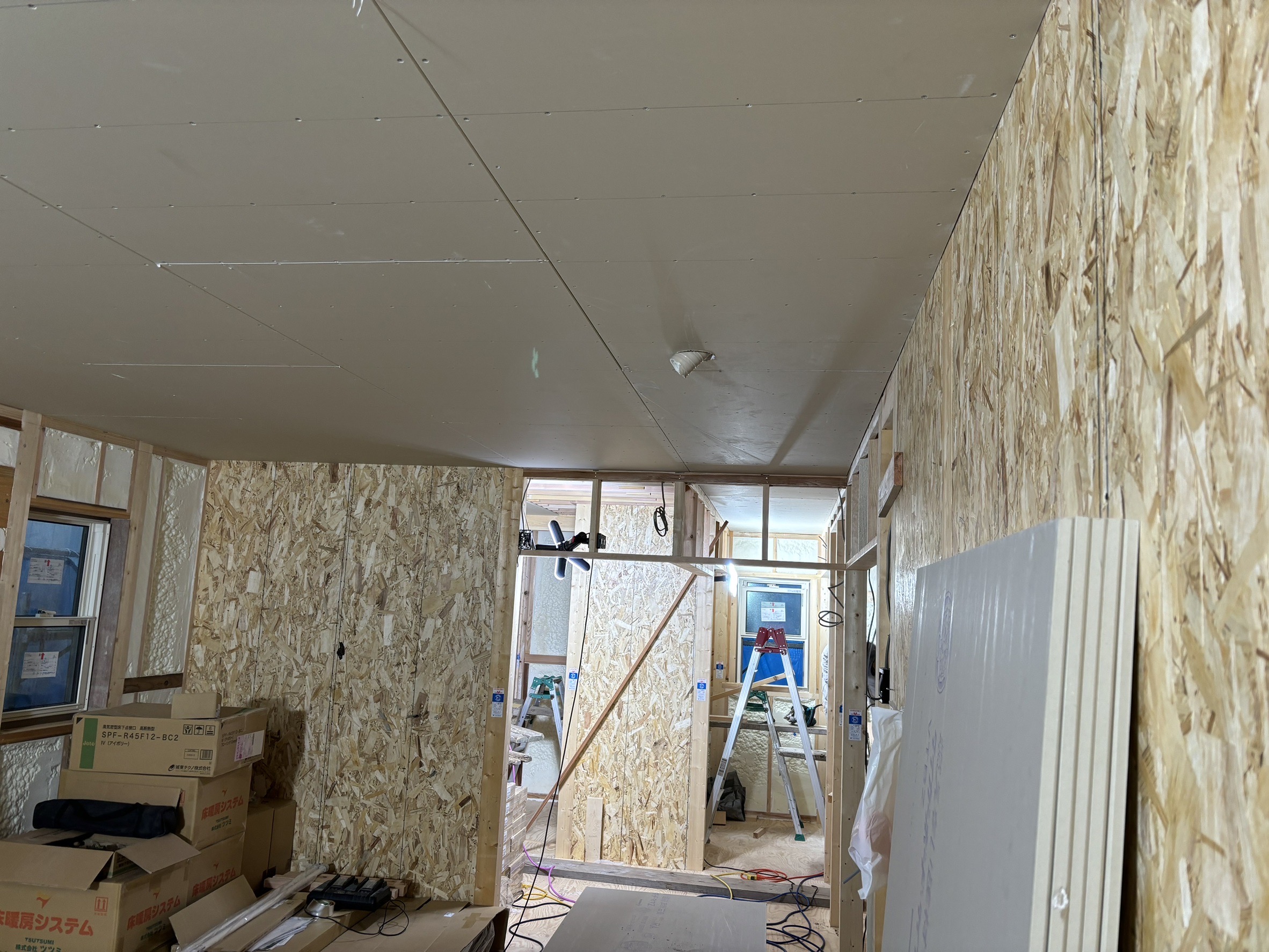 天井裏部分もアクアフォームによる散布が完了したので省令準耐火構造仕様の強化石膏ボードで天井を作っていきます。