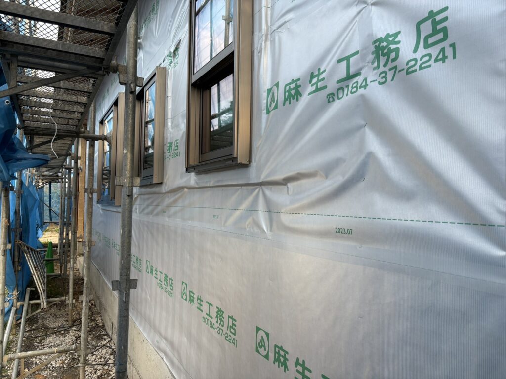 だいぶ住宅の全容が伺える様になってきました。外部は透湿防水シートが貼り終わりましたのでいよいよサイディング(外壁材)を貼る作業になります。