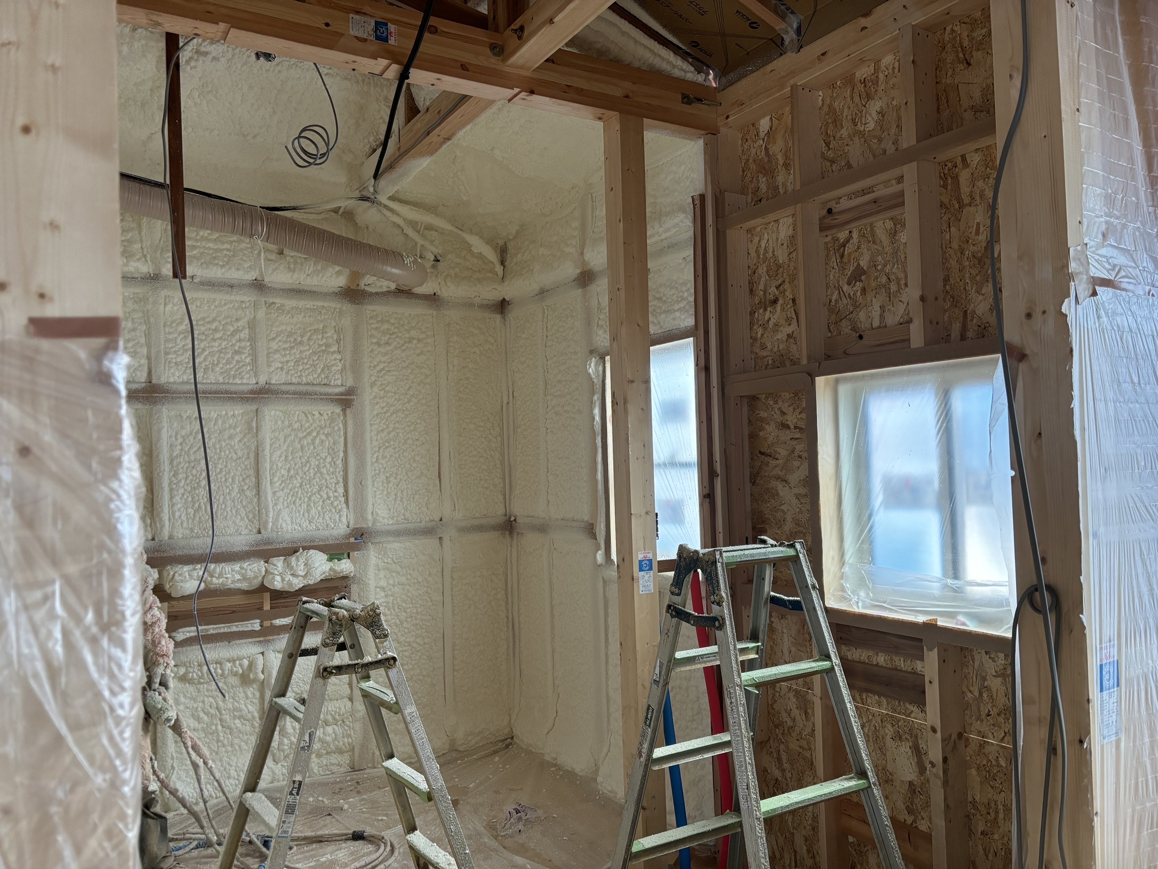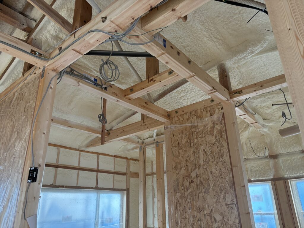 内部は断熱性能の高さに定評のある「アクアフォーム」という発報断熱材を散布しました。個体の断熱材に比べて隙間なくピッタリと密着するため高気密高断熱効果のある工法です。
