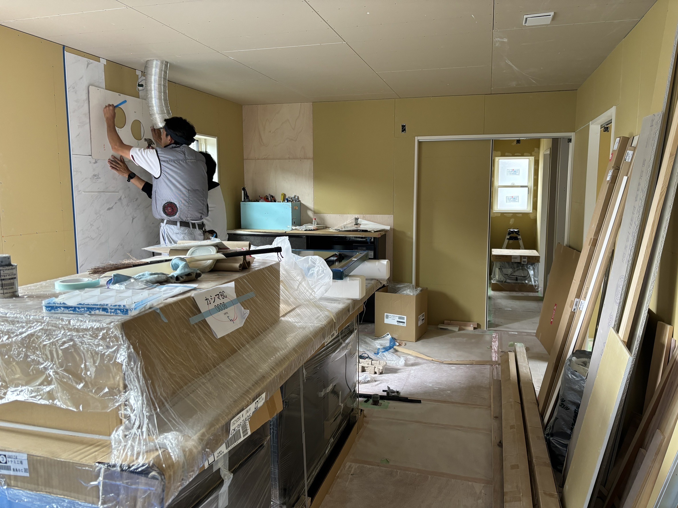 内部はシステムキッチンの取り付け作業を行なっています。換気扇用のダクトを設置している様子です。