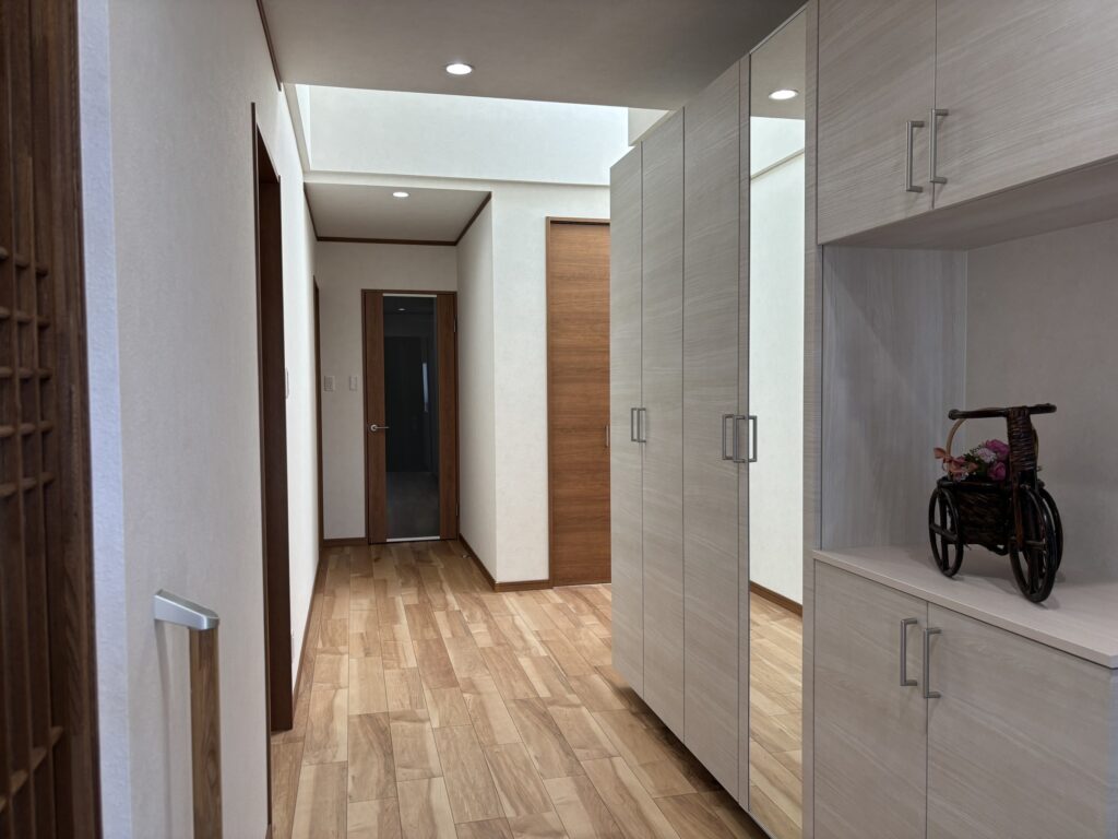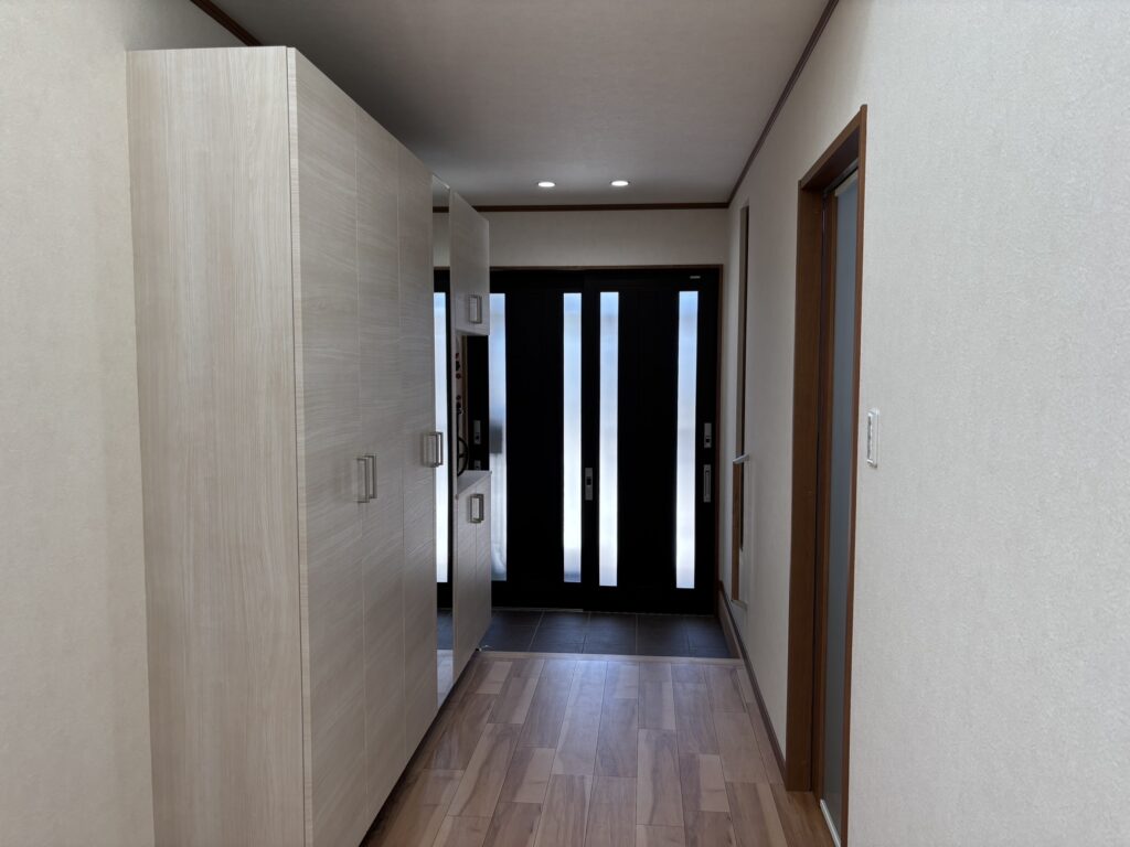 玄関の様子。白を基調とした内壁に三協アルミ社製茶色の内装建具、フローリングを合わせた空間はスタンダードながらも落ち着きを見せる仕上がりです。