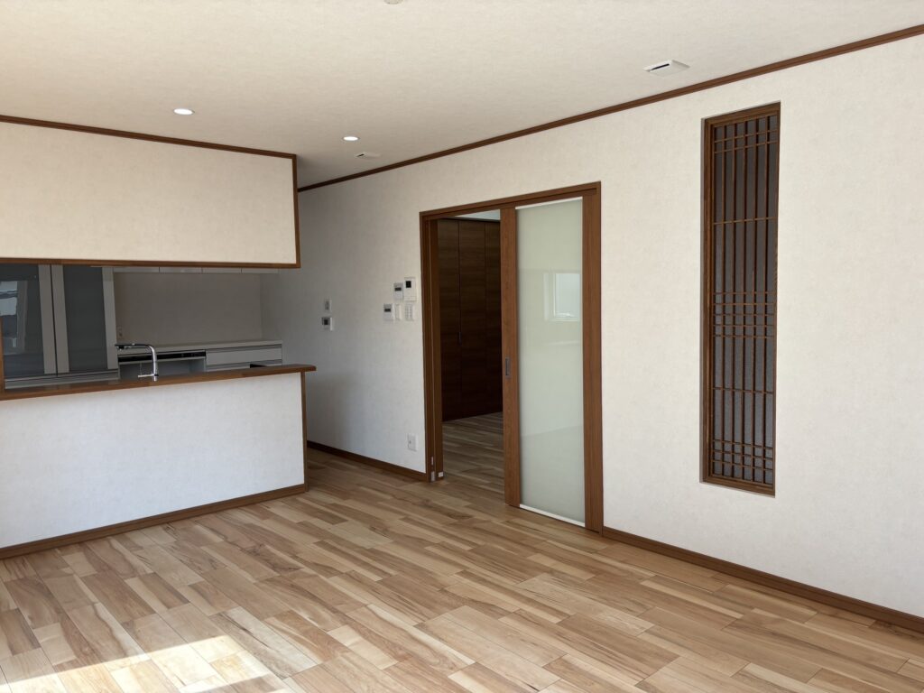 キッチンと一体型となるリビングダイニング。引き戸は車輪が上にあるタイプで玄関からキッチンまで段差が無くスムーズに入ることができます。