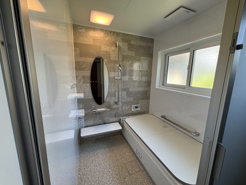 浴室はTOTO社のシステムバスルーム「サザナ」を取り付けました。入浴後にボタンを押すだけで皮脂・角質汚れを洗い流し、きれい除菌水で除菌仕上げが行える床ワイパー洗浄機能が搭載されています。