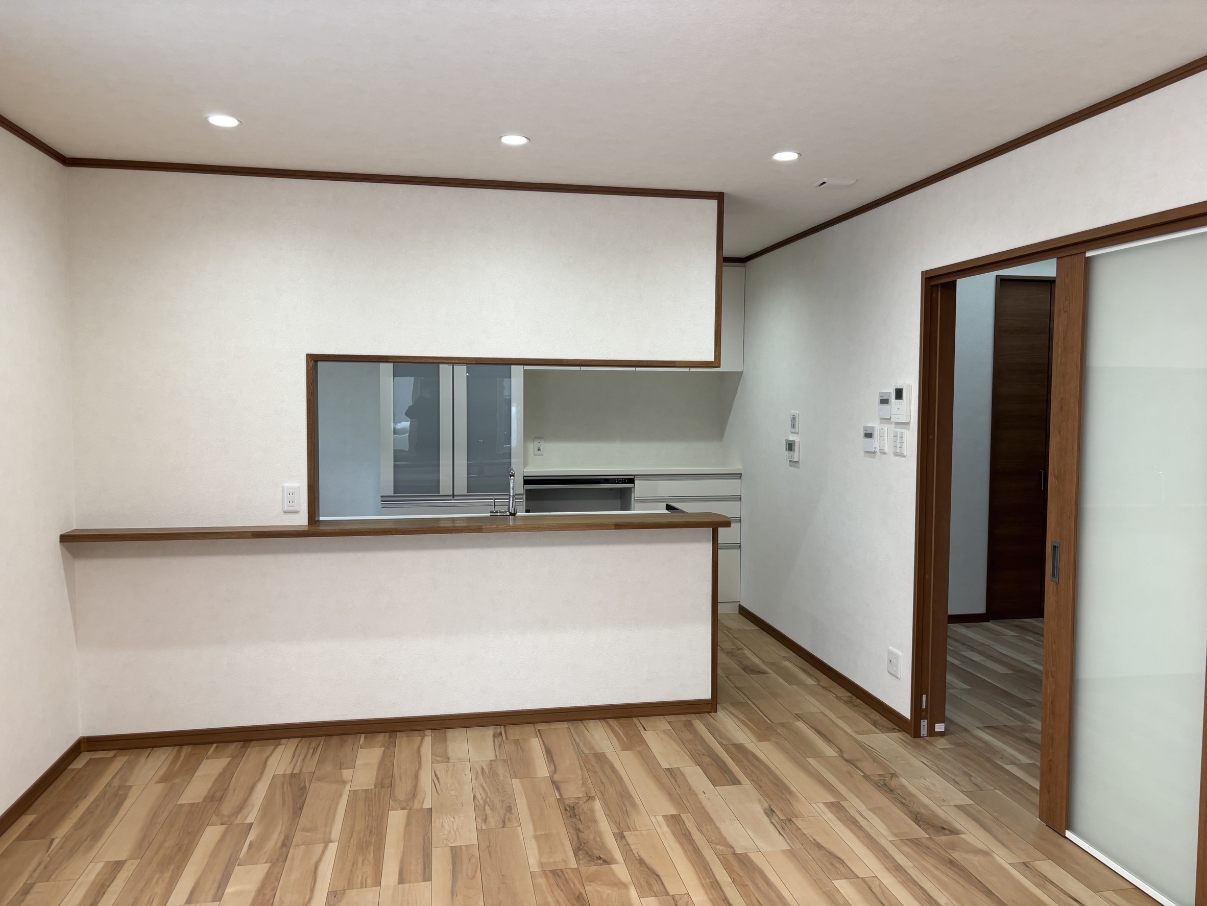 キッチンと一体型となるリビングダイニング。引き戸は車輪が上にあるタイプで玄関からキッチンまで段差が無くスムーズに入ることができます。