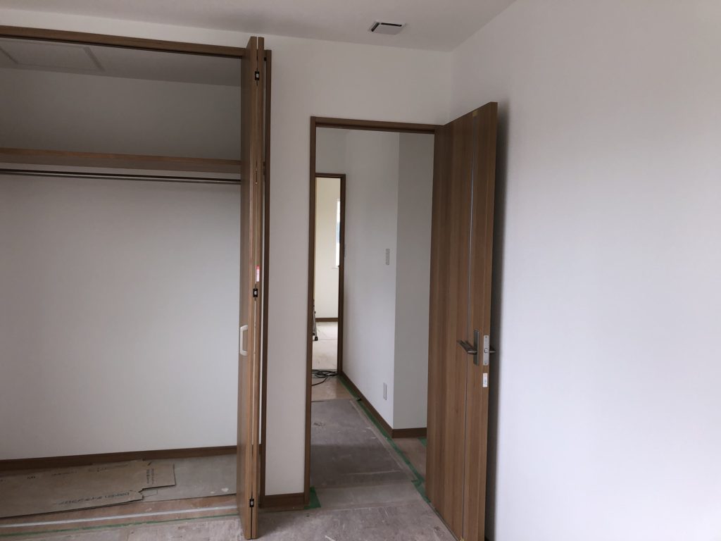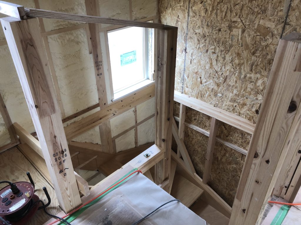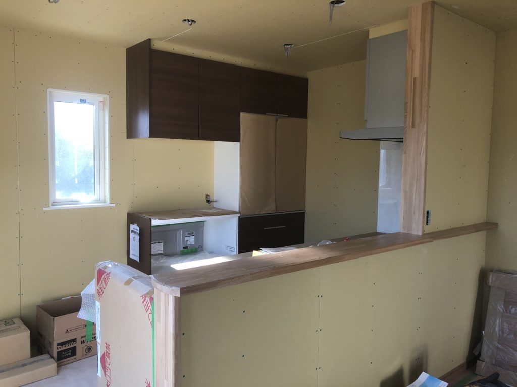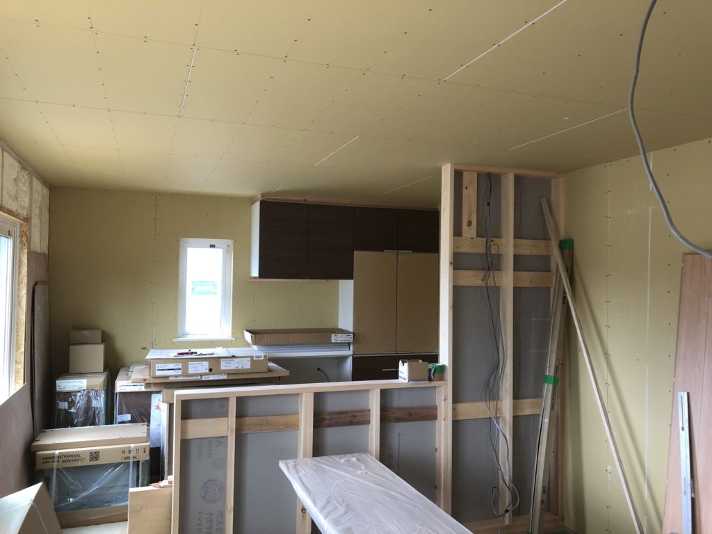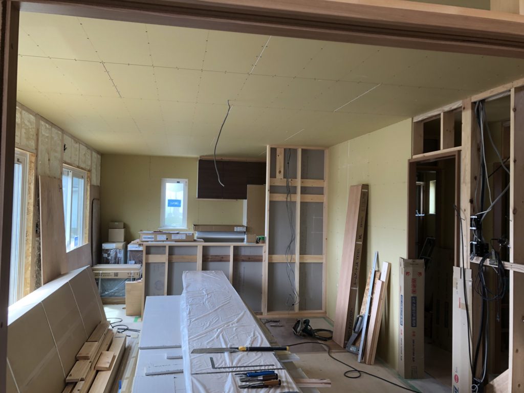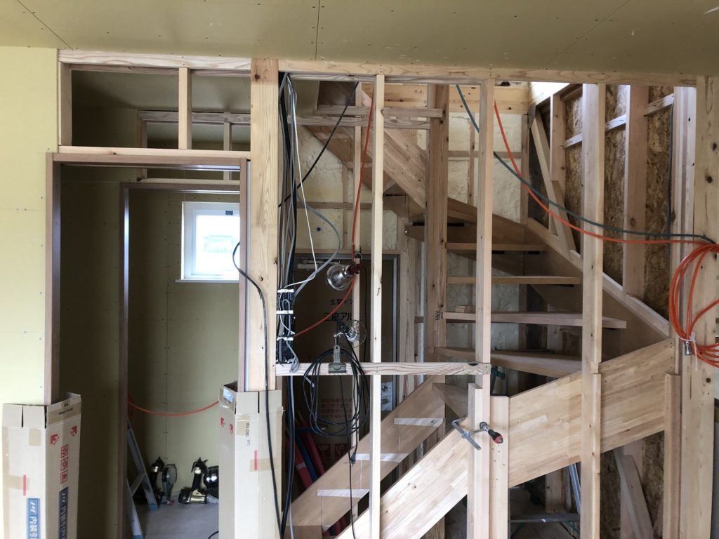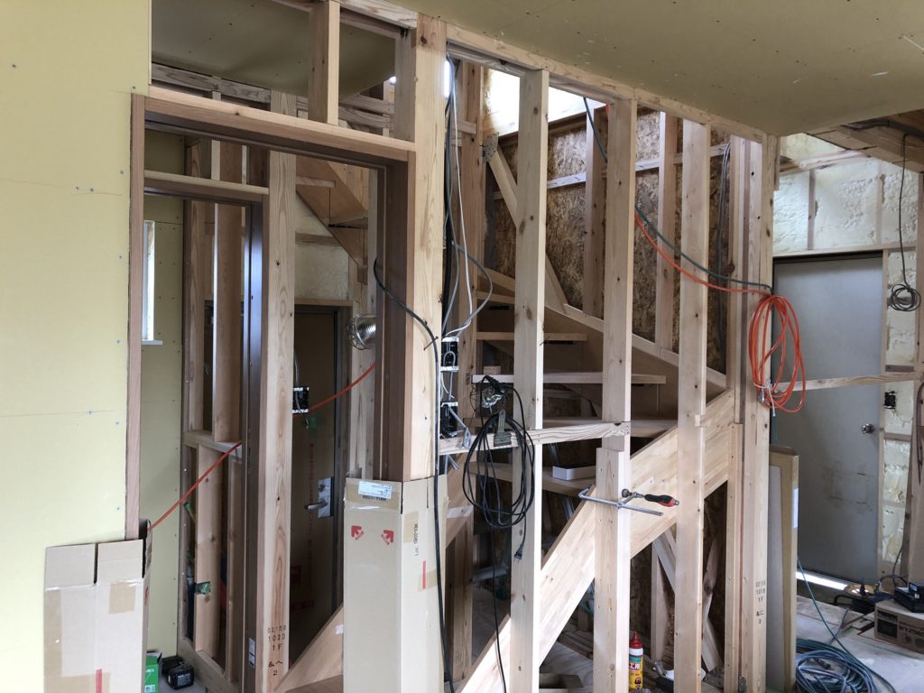 内装工事の状況です。各部屋の配線、配管の設置を行い備え付けのクローゼット等の内装建具を作っています。階段も取り付け、キッチンも制作しています。徐々にではありますがこのお住まいの「顔」が見えてきました。