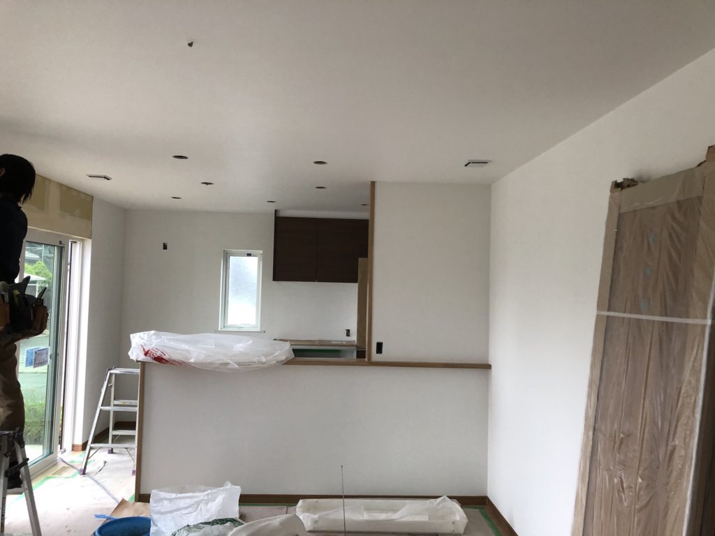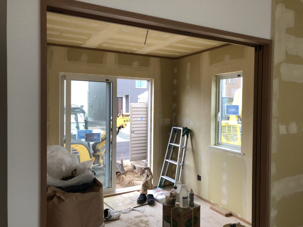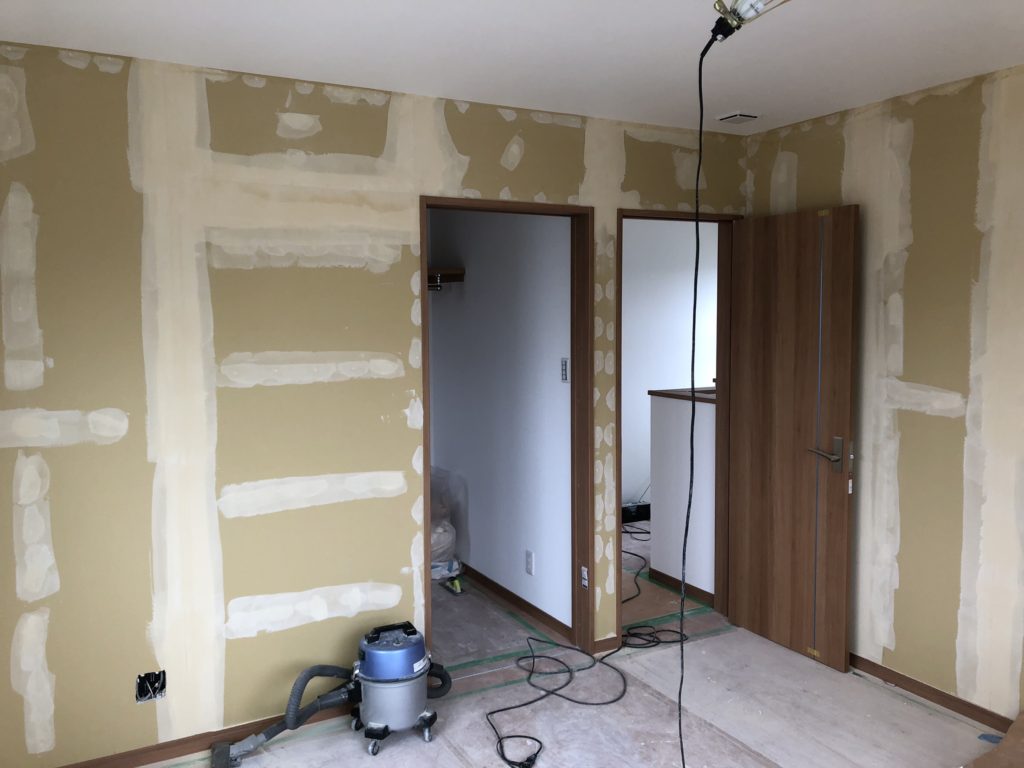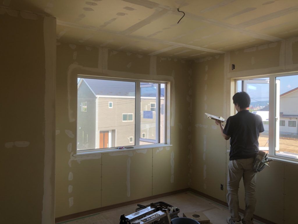 発泡ウレタンで高断熱、高気密性を確保し配線配管の終わった内壁や天井に石膏ボードを貼り付けます。クロス貼りの作業に入ります。
