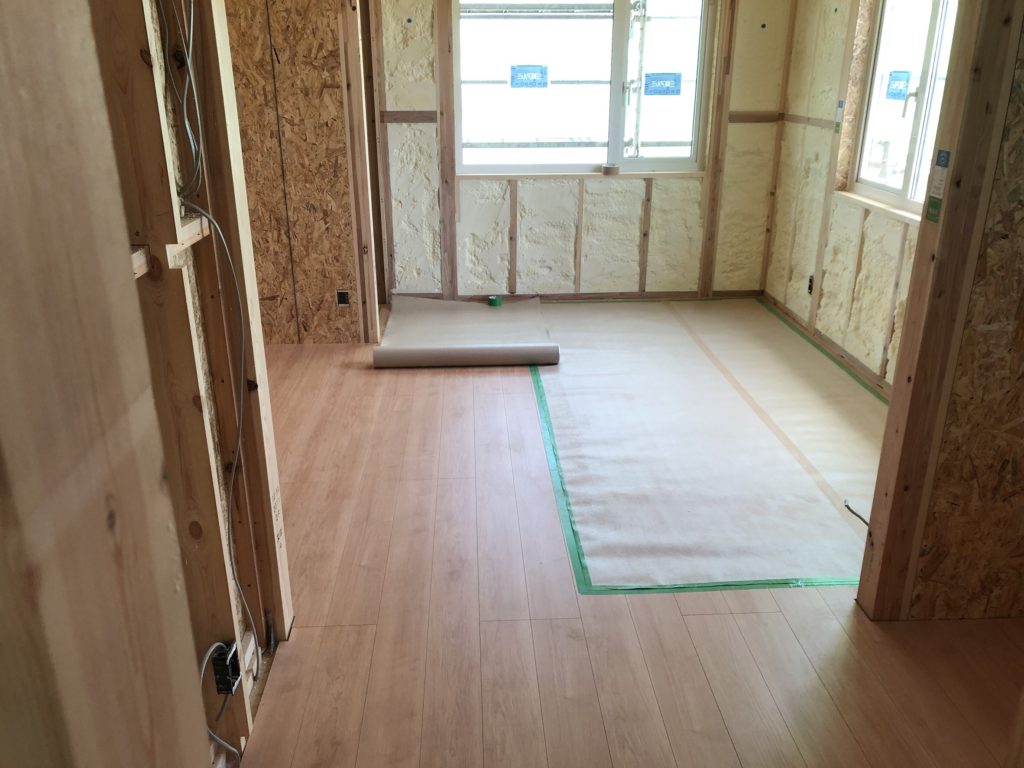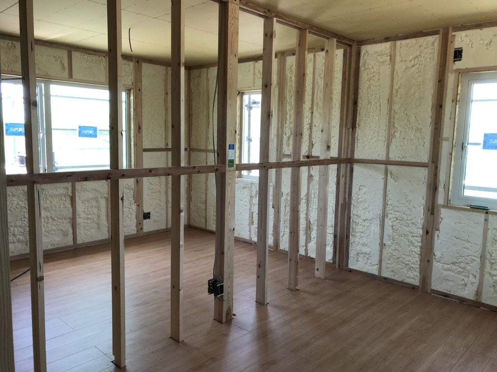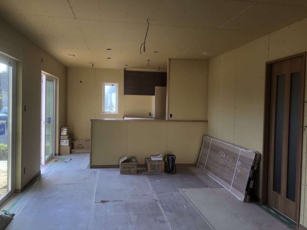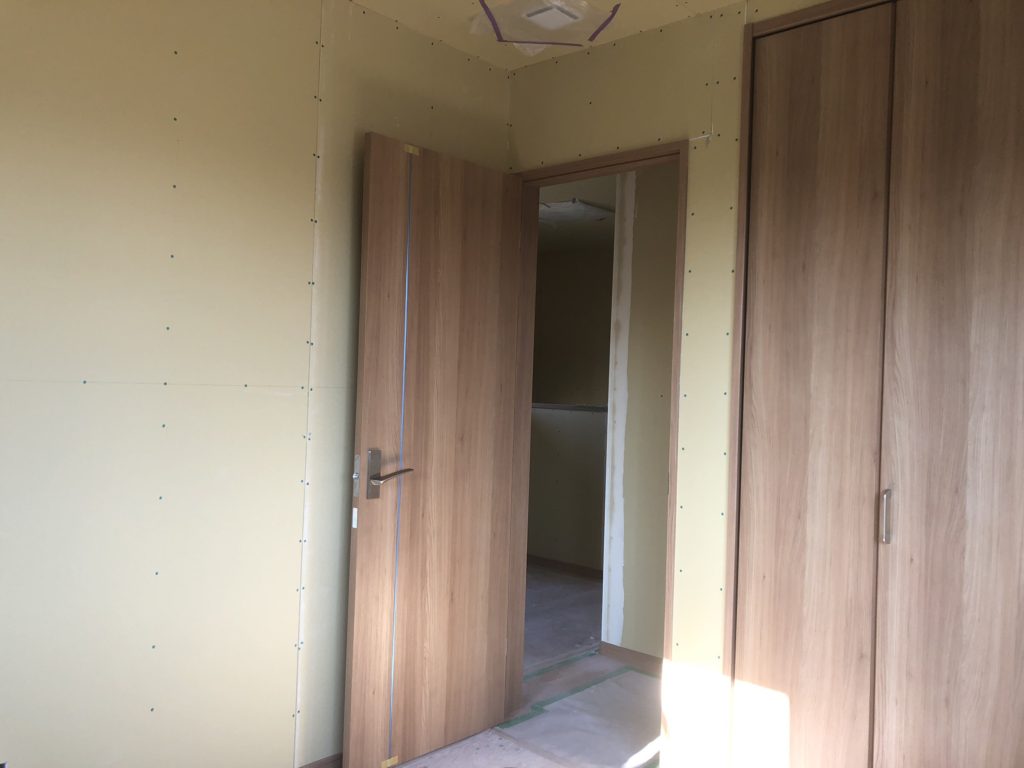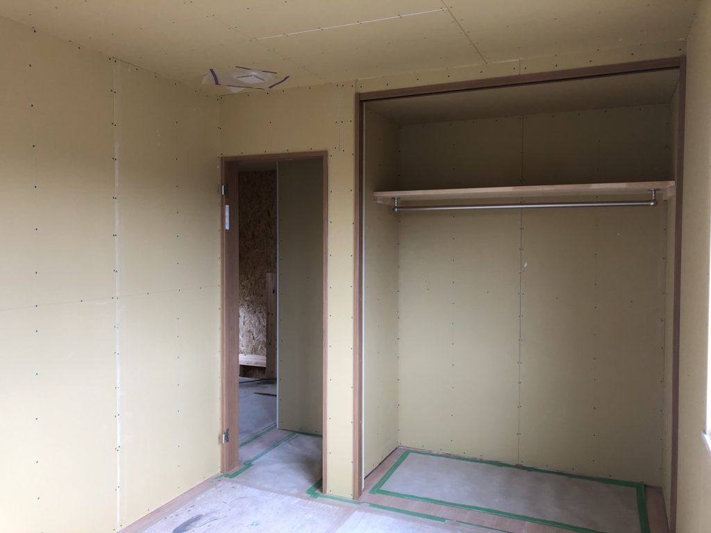 発泡ウレタンで高断熱、高気密性を確保し配線配管の終わった内壁や天井に石膏ボードを貼り付けます。クロス貼りの作業に入ります。