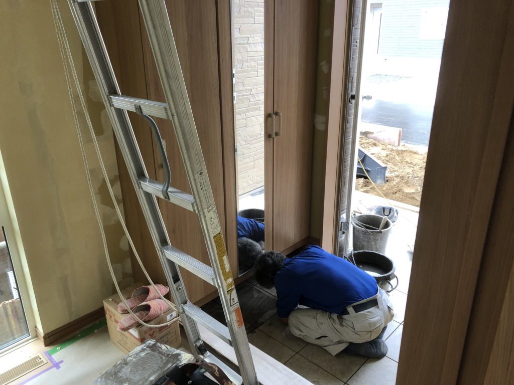 玄関のタイル貼りや外構の作業も行います。いよいよS様邸の施工も佳境に入りました。
