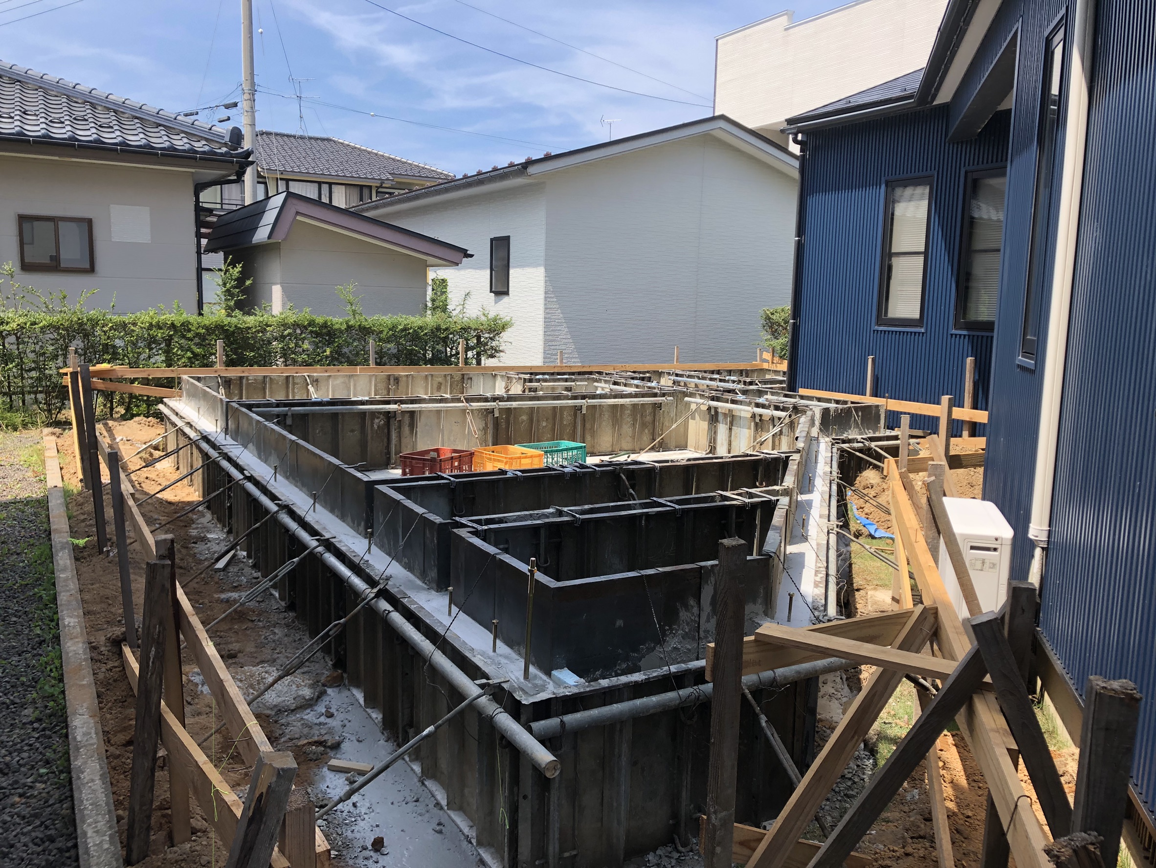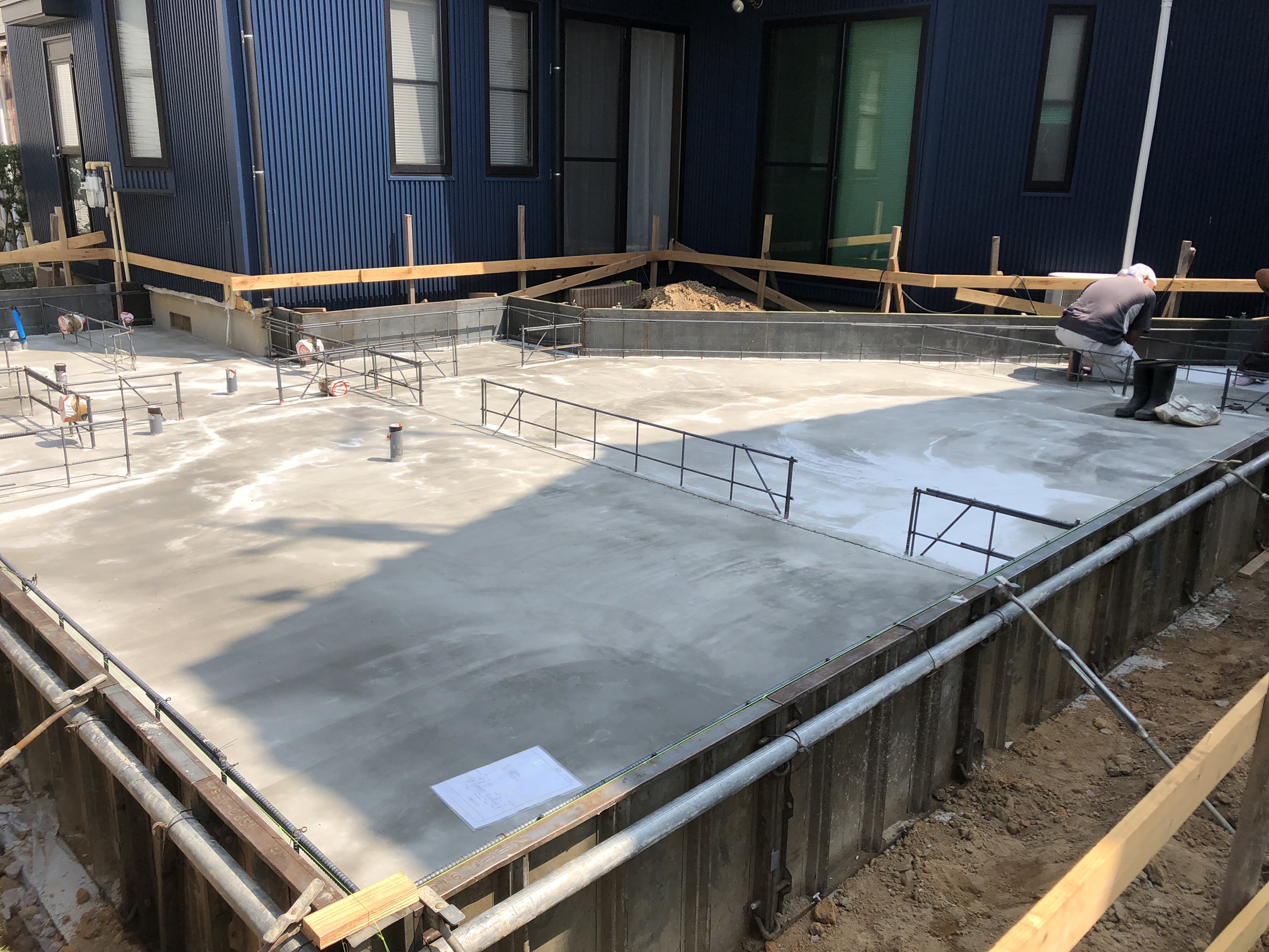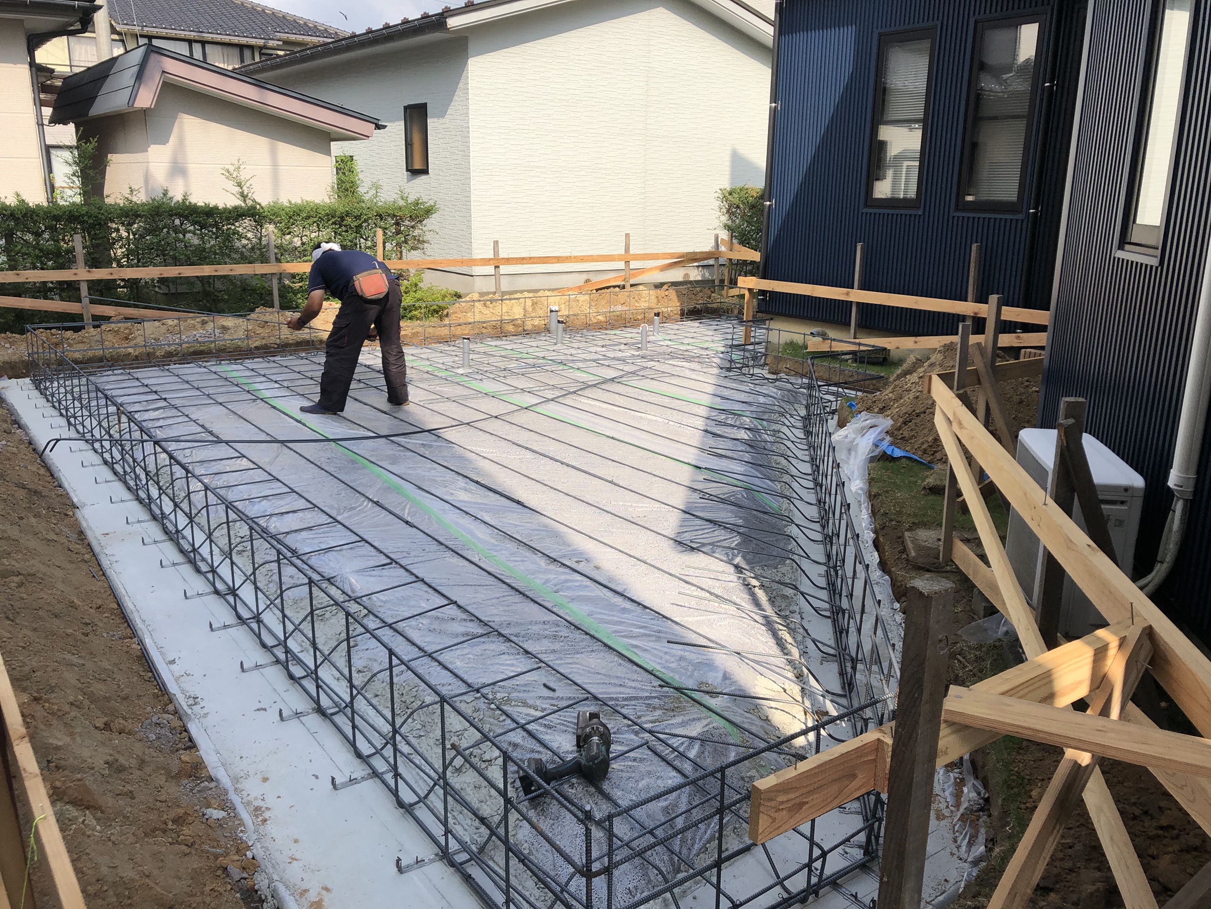 鉄筋が組み終わりましたら次に型枠を組んでコンクリートを流し込み土台を作っていきます。