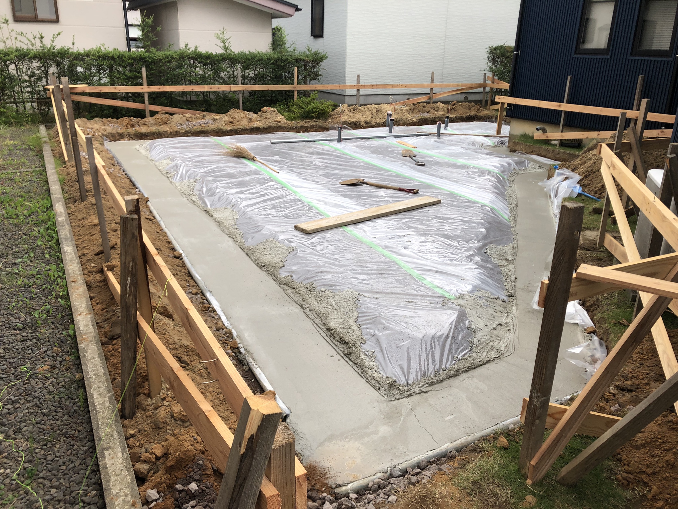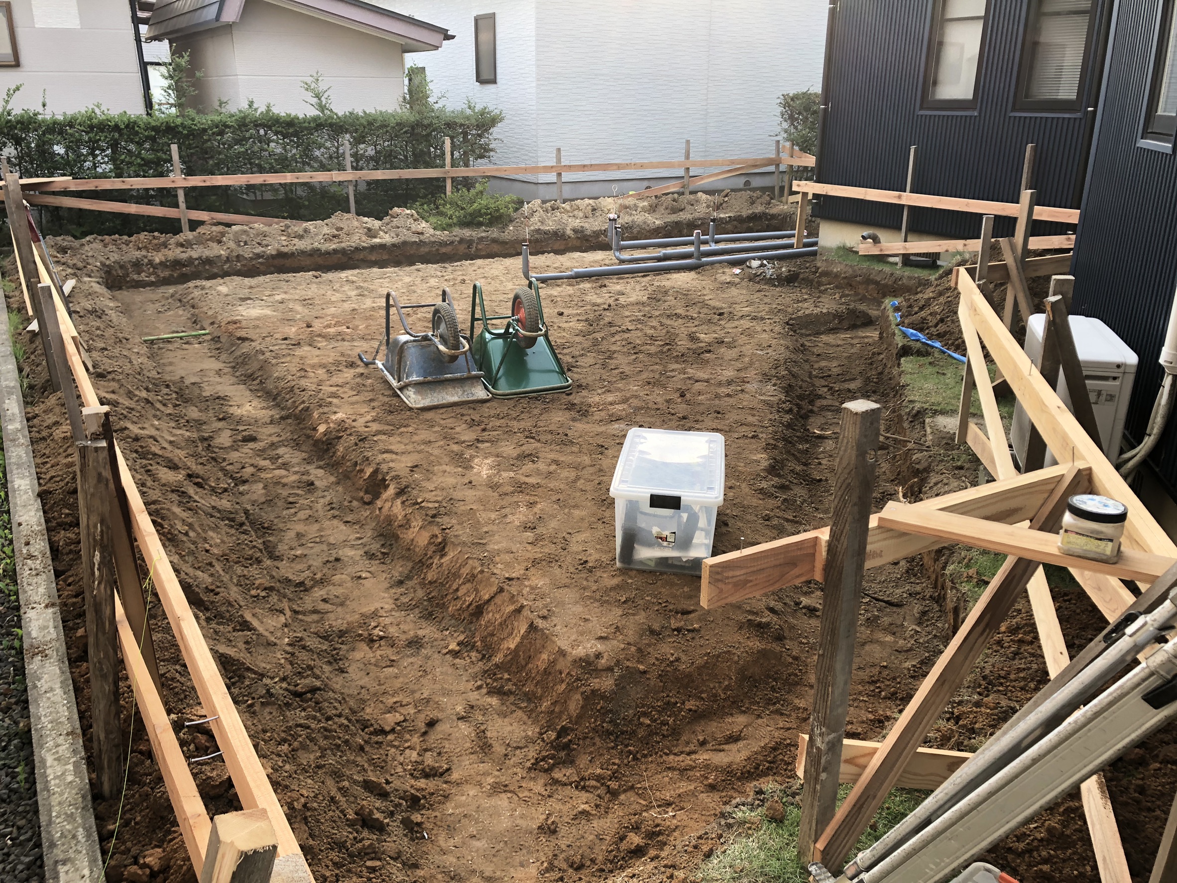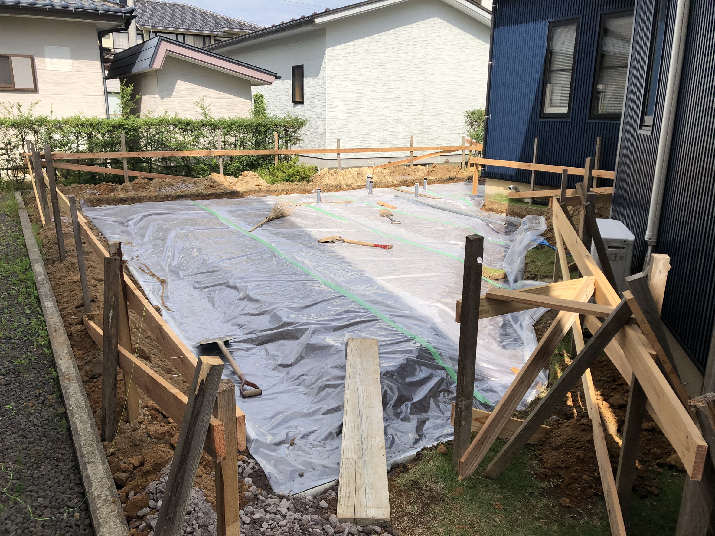 鉄筋が組み終わりましたら次に型枠を組んでコンクリートを流し込み土台を作っていきます。