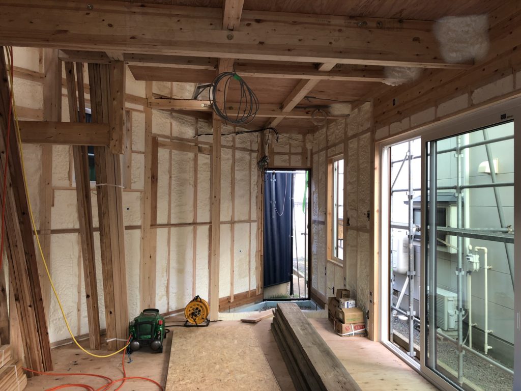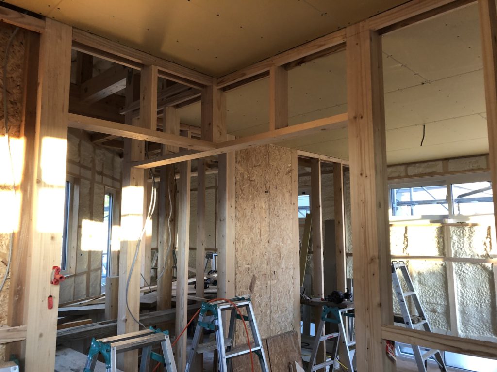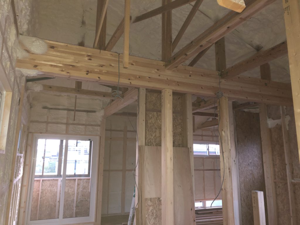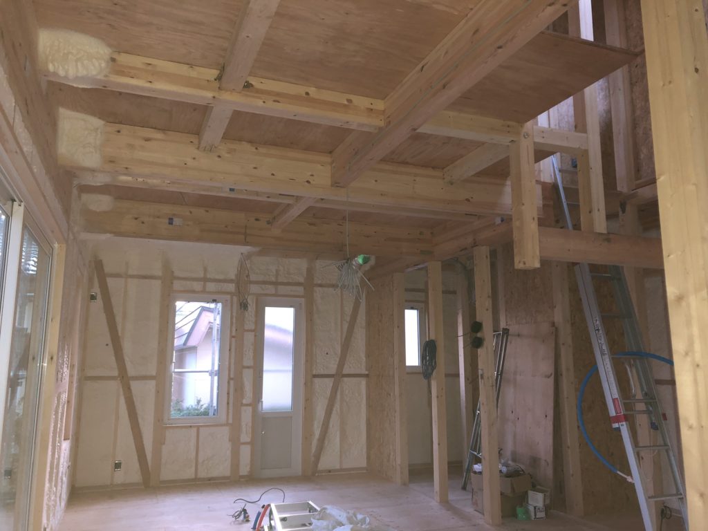 内装の方は発泡ウレタンによる断熱処理が完了したので、どんどんフタをしていきます。徐々に住宅の「形」が現れてきました。