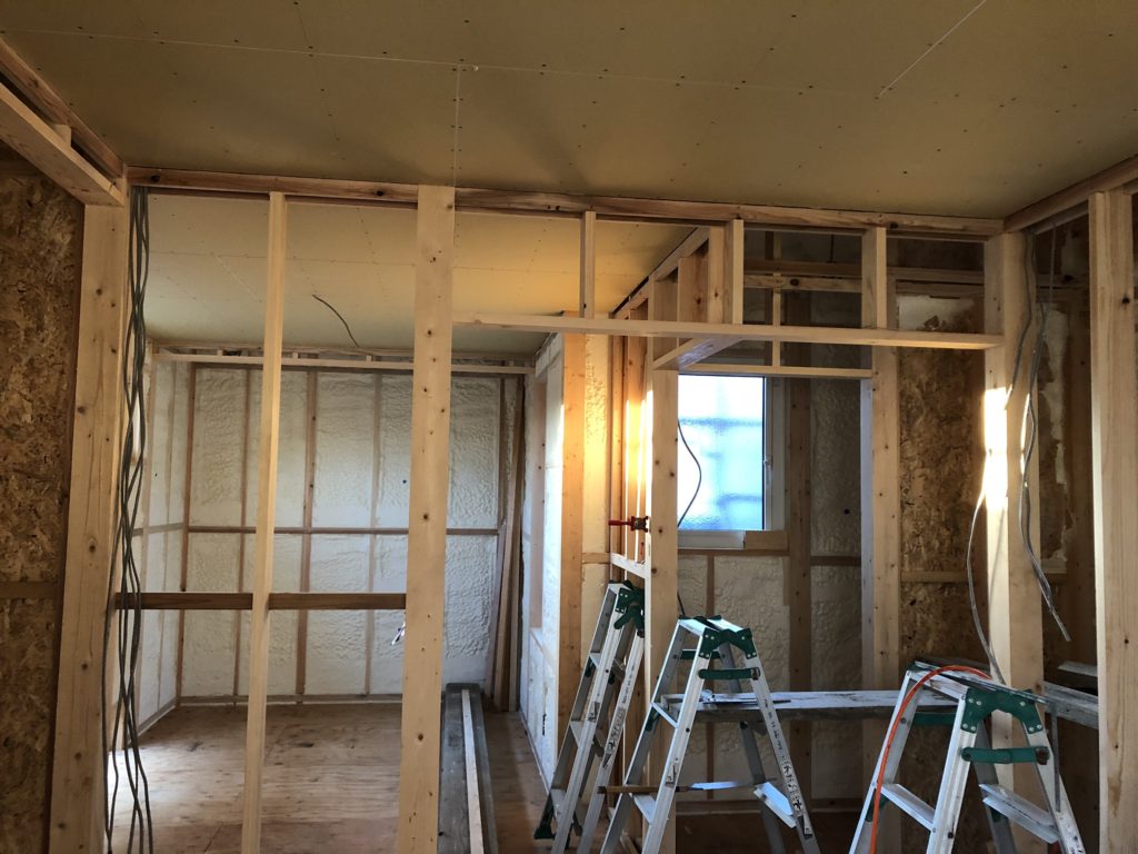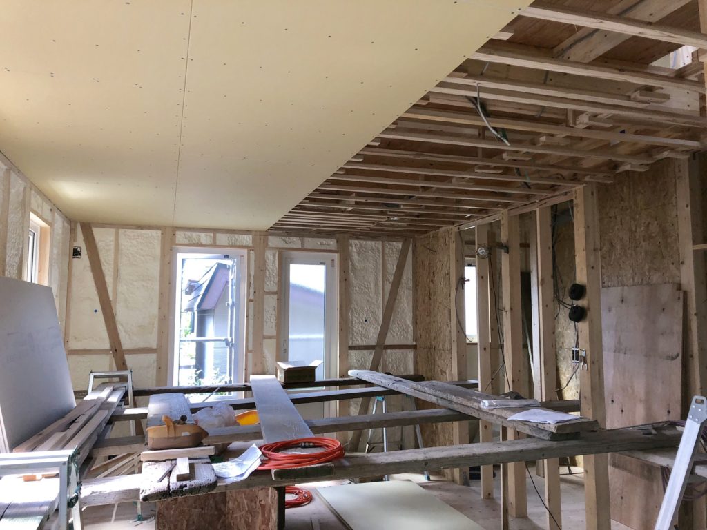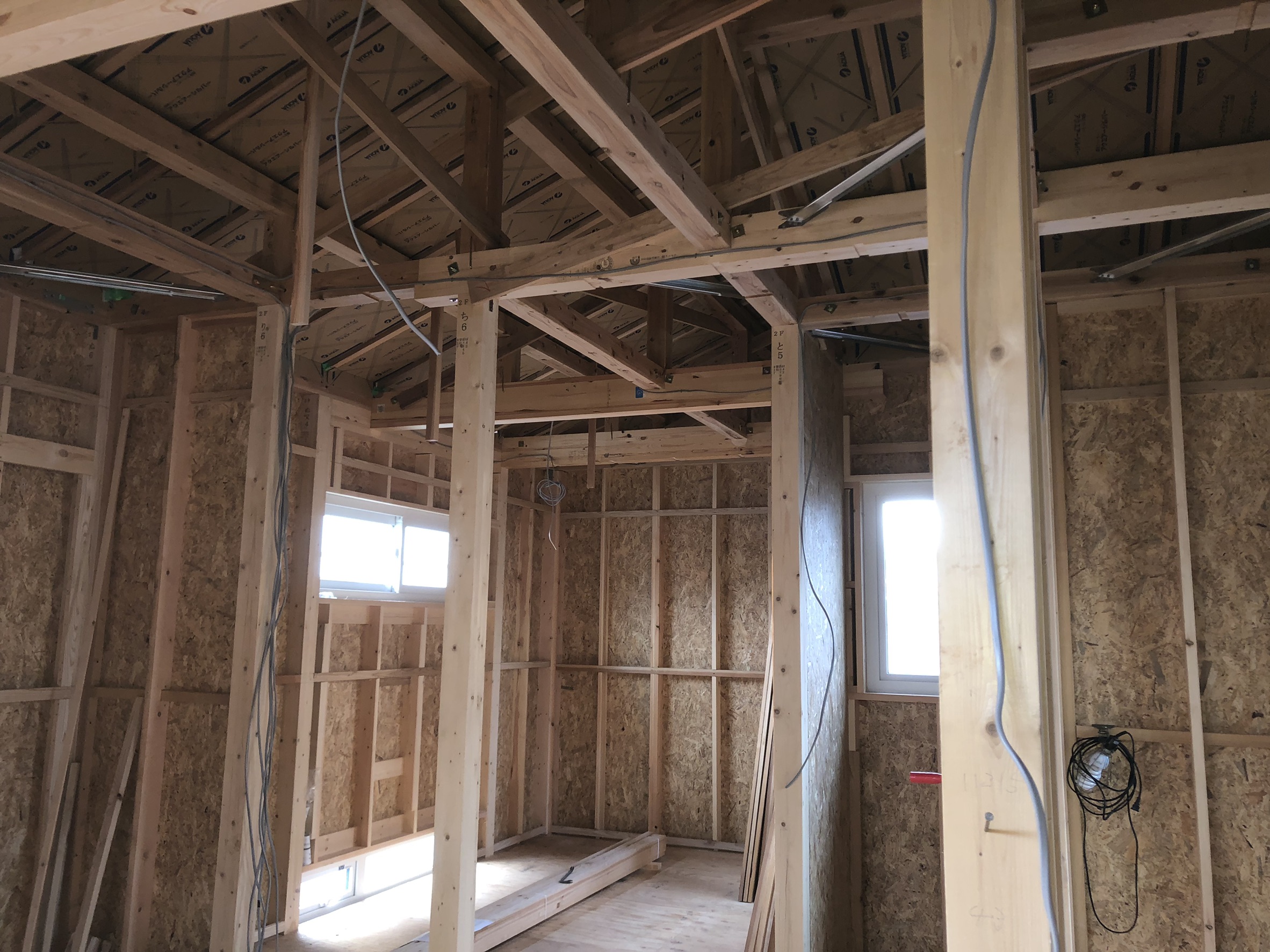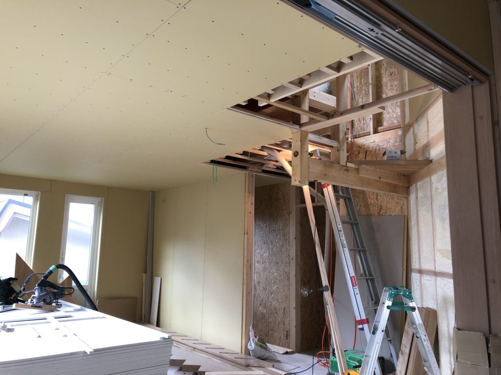 内装の方は発泡ウレタンによる断熱処理が完了したので、どんどんフタをしていきます。徐々に住宅の「形」が現れてきました。
