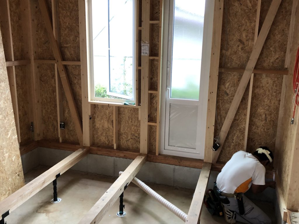 梁が完成したので、内装の施工を行うと隠れてしまう配線と配管の工事を行っていきます。