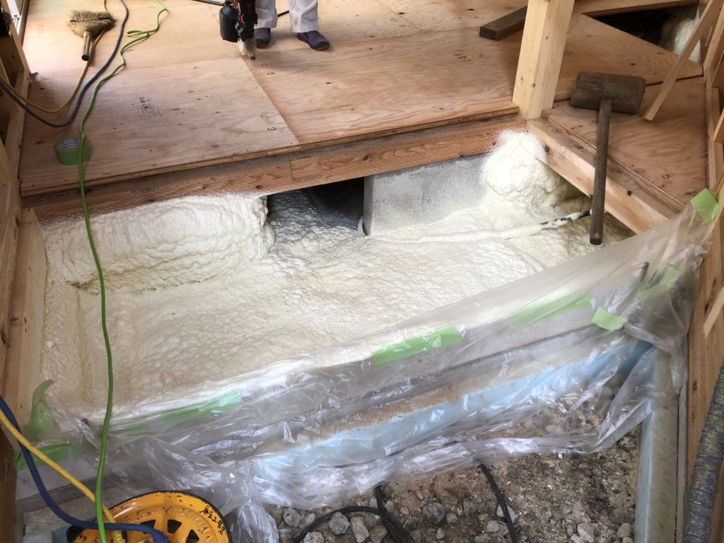 配線・配管の工事が完了したら床面・壁面・天井に発泡ウレタンを隙間なく散布していきます。発泡ウレタンは耐水性・防音性に優れ、シックハウスの心配がない安全な断熱材として評判を得ていまして、まんべんなく断熱処理を行うことができます。