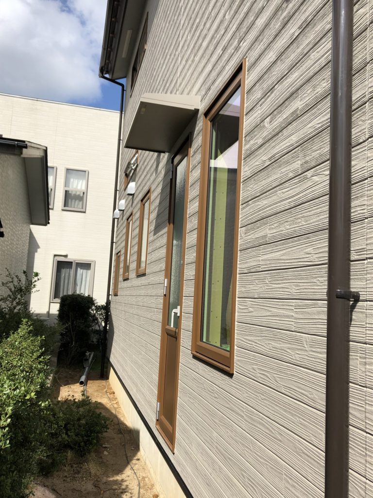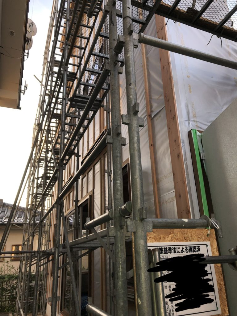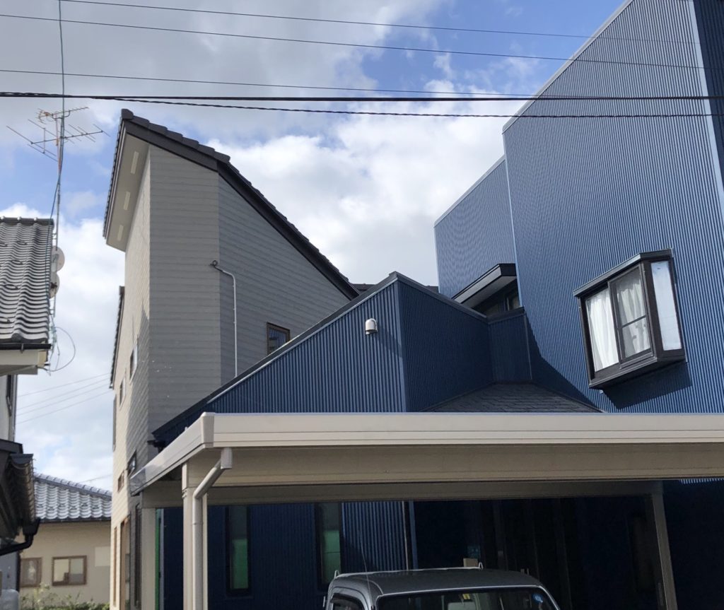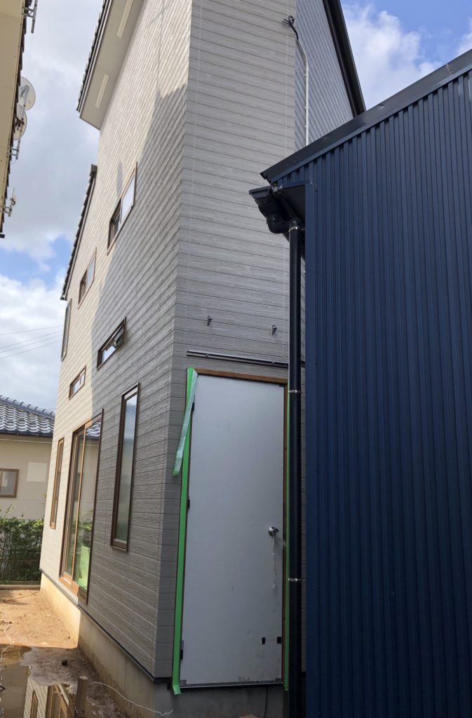 屋根が完成し、ドアや窓のサッシも取り付け、外壁の作業も完成しました。青い家が元々建っていた住宅ですが、新築部分は増築でも違和感のないデザインで建てることができました。内装のクロス(壁紙)貼り等細かい作業が終わればいよいよ住宅の完成となります。