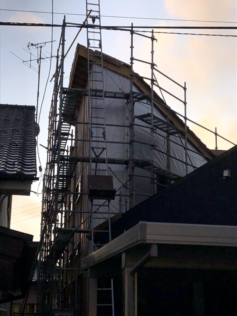 発泡ウレタンによる断熱処理の内装工事と供に外装工事の準備も進めていきます。透湿防水シートを全面に取り付けて、外装の下地を作っていきます。