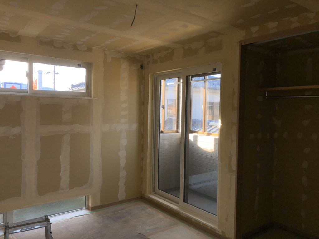 発泡ウレタンによる高気密高断熱処理が完了し、石膏ボードで天井と壁面にフタをしていきます。同時に床面にはフローリング処理を行っていきます。窓が壁面の上下にある部屋は寝室と子供部屋なのですが、通常の窓の位置だと隣家と窓の高さが揃ってしまうので、お客様のこだわりによってこのような形となっています。