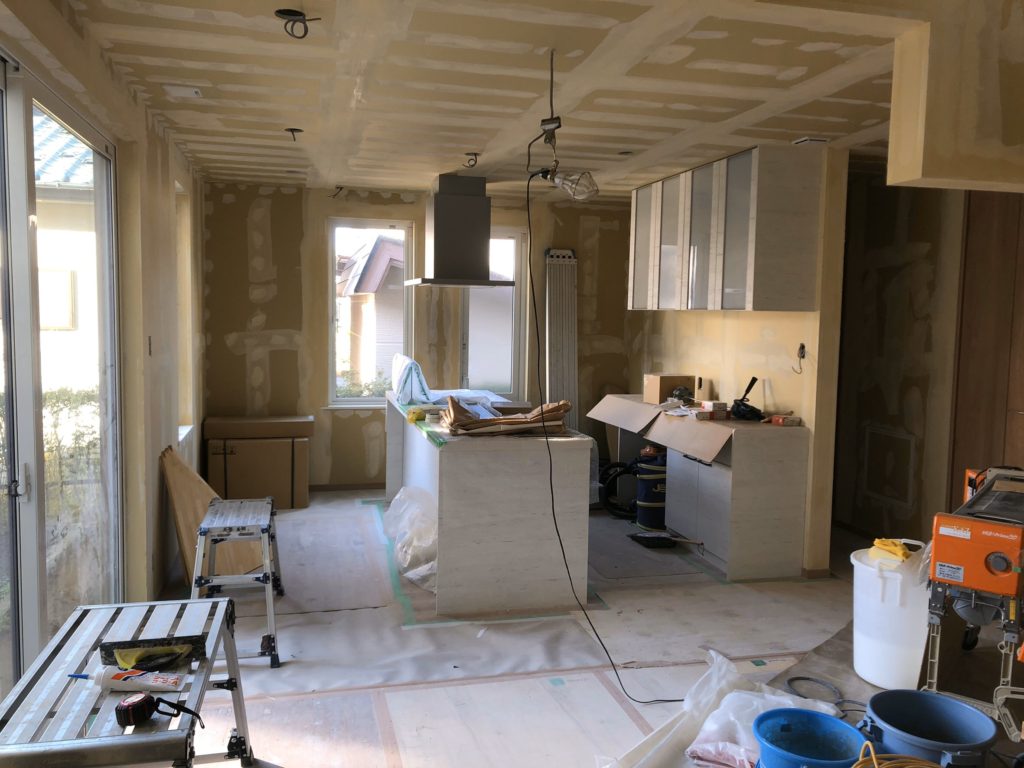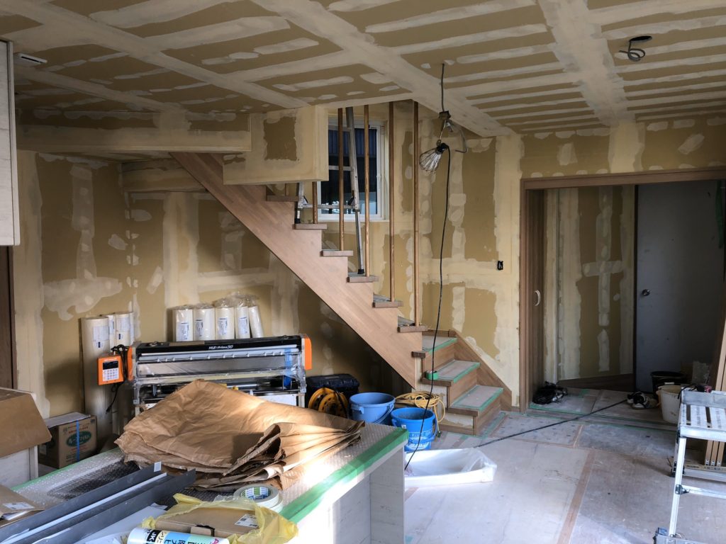 下の階も石膏ボードによるフタが終わり、キッチンやトイレ、洗面台など水まわりや収納棚などの家具を設置し、その作業が終わったらクロス(壁紙)を貼る作業を行います。