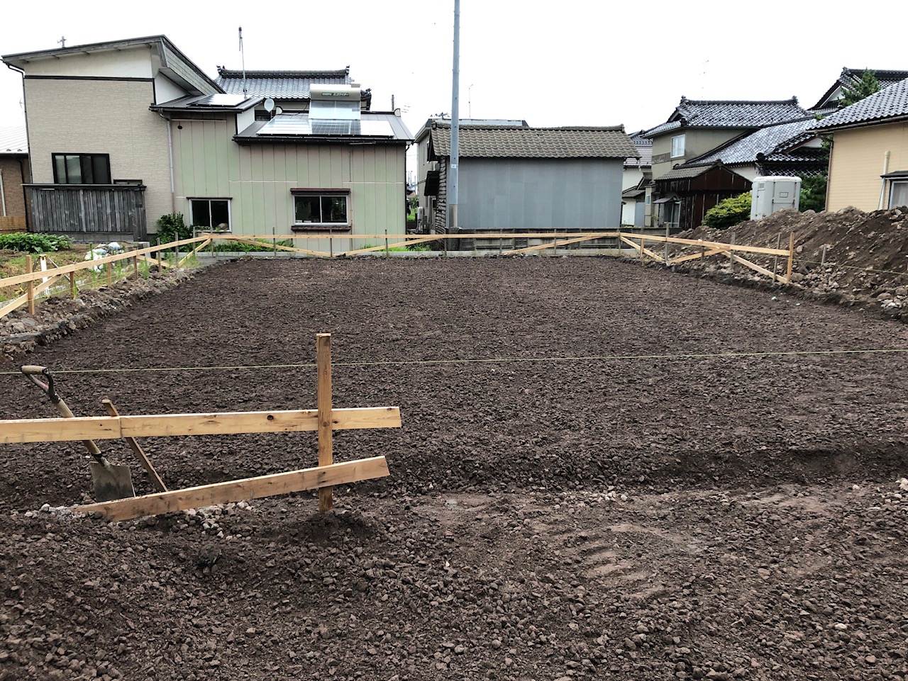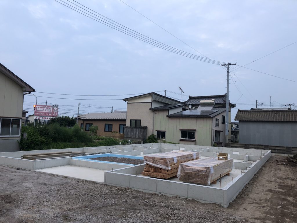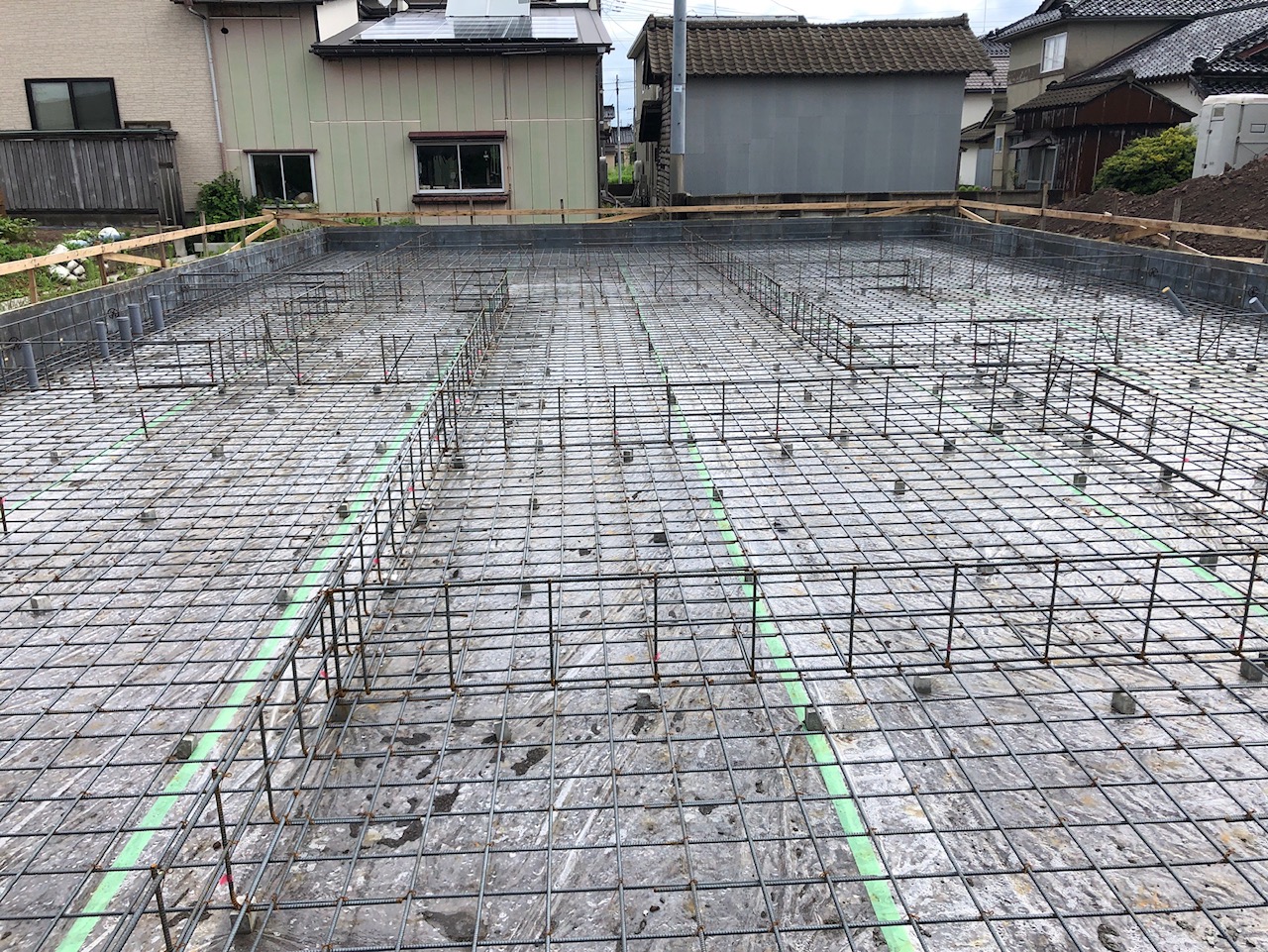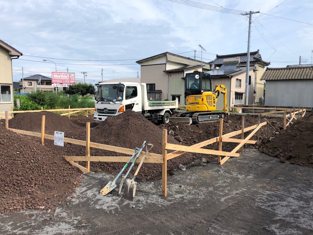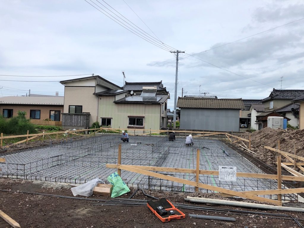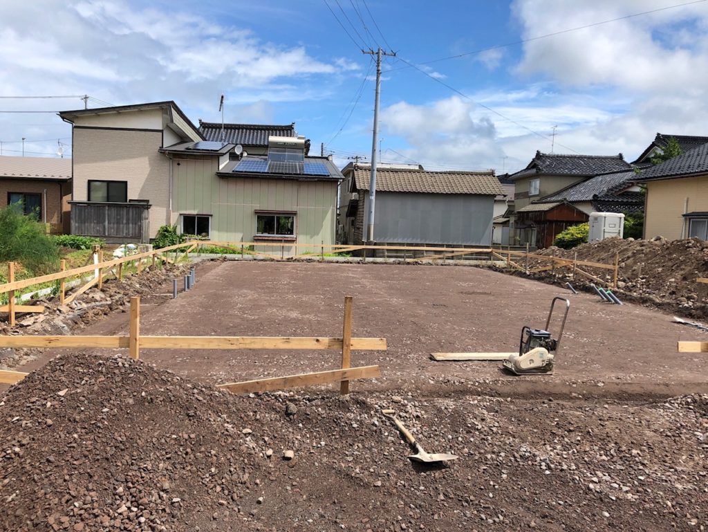 土をならして整地が完了しました。この上に建物の基礎を建てていきます。今回は「ベタ基礎」を構築します。ベタ基礎とは、立ち上がっている部分と床一面を鉄筋を入れたコンクリートで一体化して、大きな「面」で建物の重みを支えます。もう一つの有名な基礎である「布基礎」は立ち上がっている部分の「点」で建物を支える構造となるので、ベタ基礎は布基礎よりも耐震性が高いのが特徴です。
