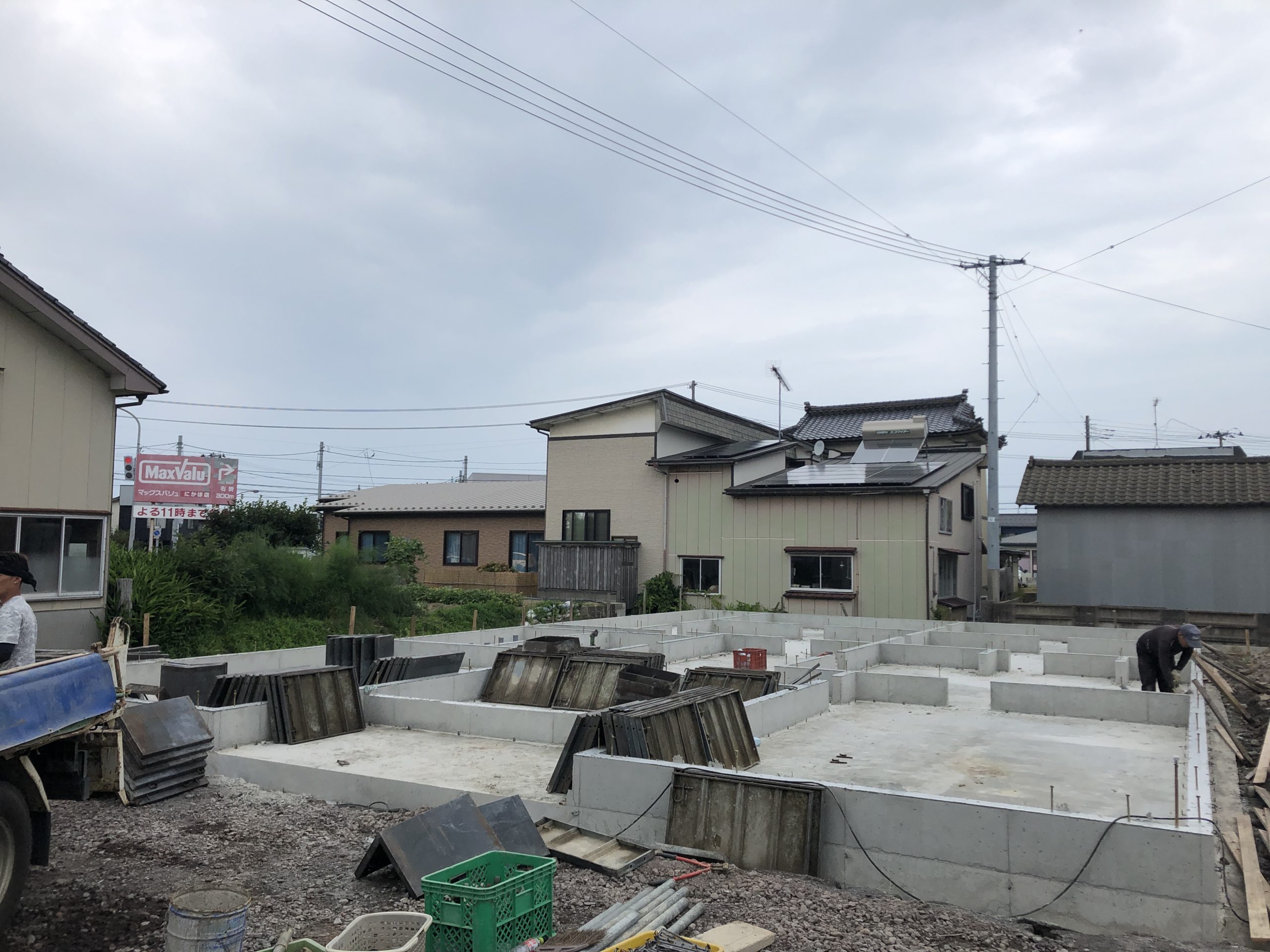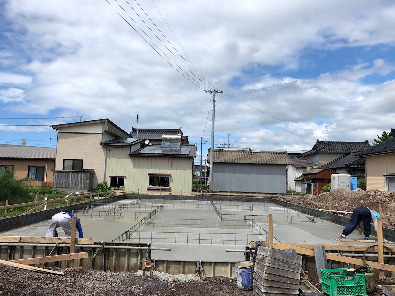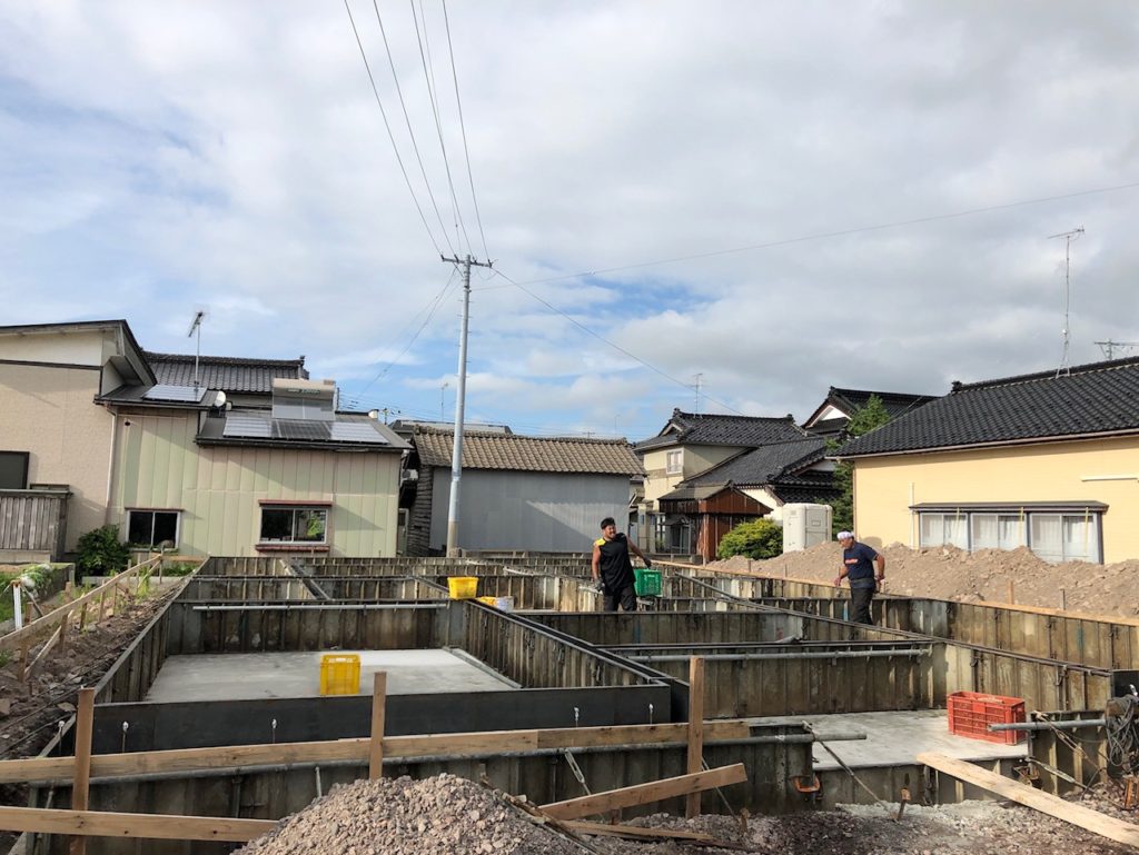 敷き終わった床面のコンクリートを十分に乾かしたら型枠を組み立ち上がりの部分を作っていきます。型枠にコンクリートを流し込んでこちらも十分に乾かしたらベタ基礎の完成となります。